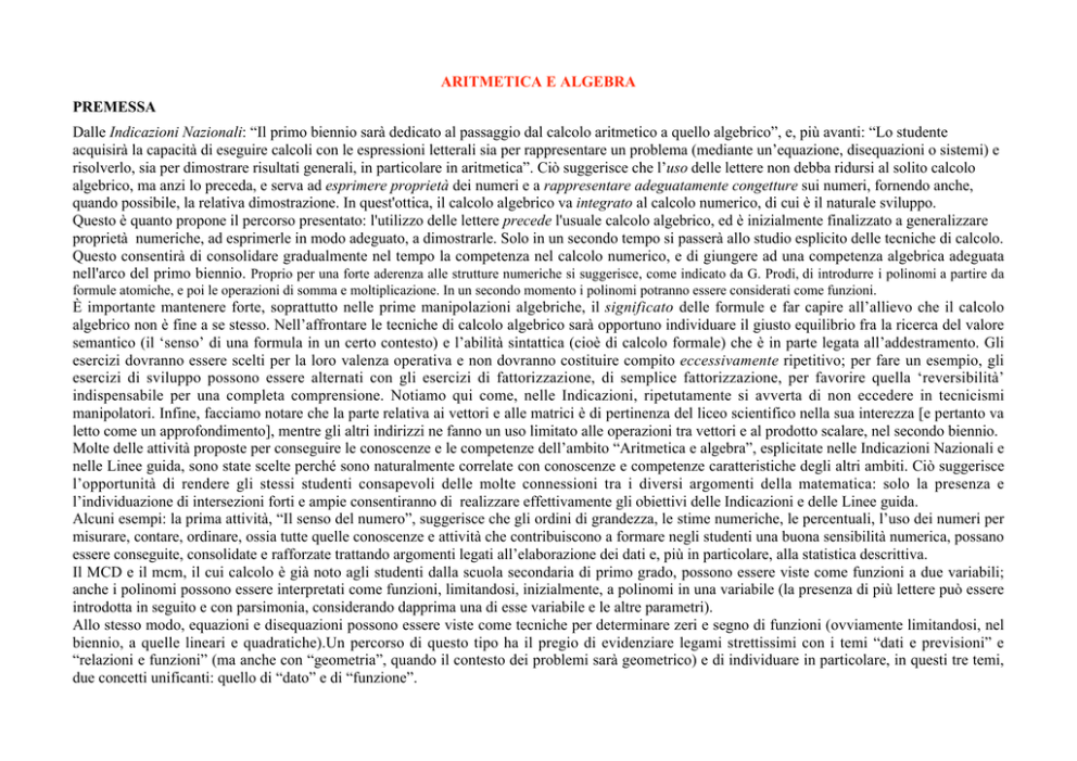 ARITMETICA E ALGEBRA PREMESSA Dalle Indicazioni Nazionali: “Il primo biennio sarà dedicato al passaggio dal calcolo aritmetico a quello algebrico”, e, più avanti: “Lo studente acquisirà la capacità di eseguire calcoli con le espressioni letterali sia per rappresentare un problema (mediante un’equazione, disequazioni o sistemi) e risolverlo, sia per dimostrare risultati generali, in particolare in aritmetica”. Ciò suggerisce che l’uso delle lettere non debba ridursi al solito calcolo algebrico, ma anzi lo preceda, e serva ad esprimere proprietà dei numeri e a rappresentare adeguatamente congetture sui numeri, fornendo anche, quando possibile, la relativa dimostrazione. In quest'ottica, il calcolo algebrico va integrato al calcolo numerico, di cui è il naturale sviluppo. Questo è quanto propone il percorso presentato: l'utilizzo delle lettere precede l'usuale calcolo algebrico, ed è inizialmente finalizzato a generalizzare proprietà numeriche, ad esprimerle in modo adeguato, a dimostrarle. Solo in un secondo tempo si passerà allo studio esplicito delle tecniche di calcolo. Questo consentirà di consolidare gradualmente nel tempo la competenza nel calcolo numerico, e di giungere ad una competenza algebrica adeguata nell'arco del primo biennio. Proprio per una forte aderenza alle strutture numeriche si suggerisce, come indicato da G. Prodi, di introdurre i polinomi a partire da formule atomiche, e poi le operazioni di somma e moltiplicazione. In un secondo momento i polinomi potranno essere considerati come funzioni. È importante mantenere forte, soprattutto nelle prime manipolazioni algebriche, il significato delle formule e far capire all’allievo che il calcolo algebrico non è fine a se stesso. Nell’affrontare le tecniche di calcolo algebrico sarà opportuno individuare il giusto equilibrio fra la ricerca del valore semantico (il ‘senso’ di una formula in un certo contesto) e l’abilità sintattica (cioè di calcolo formale) che è in parte legata all’addestramento. Gli esercizi dovranno essere scelti per la loro valenza operativa e non dovranno costituire compito eccessivamente ripetitivo; per fare un esempio, gli esercizi di sviluppo possono essere alternati con gli esercizi di fattorizzazione, di semplice fattorizzazione, per favorire quella ‘reversibilità’ indispensabile per una completa comprensione. Notiamo qui come, nelle Indicazioni, ripetutamente si avverta di non eccedere in tecnicismi manipolatori. Infine, facciamo notare che la parte relativa ai vettori e alle matrici è di pertinenza del liceo scientifico nella sua interezza [e pertanto va letto come un approfondimento], mentre gli altri indirizzi ne fanno un uso limitato alle operazioni tra vettori e al prodotto scalare, nel secondo biennio. Molte delle attività proposte per conseguire le conoscenze e le competenze dell’ambito “Aritmetica e algebra”, esplicitate nelle Indicazioni Nazionali e nelle Linee guida, sono state scelte perché sono naturalmente correlate con conoscenze e competenze caratteristiche degli altri ambiti. Ciò suggerisce l’opportunità di rendere gli stessi studenti consapevoli delle molte connessioni tra i diversi argomenti della matematica: solo la presenza e l’individuazione di intersezioni forti e ampie consentiranno di realizzare effettivamente gli obiettivi delle Indicazioni e delle Linee guida. Alcuni esempi: la prima attività, “Il senso del numero”, suggerisce che gli ordini di grandezza, le stime numeriche, le percentuali, l’uso dei numeri per misurare, contare, ordinare, ossia tutte quelle conoscenze e attività che contribuiscono a formare negli studenti una buona sensibilità numerica, possano essere conseguite, consolidate e rafforzate trattando argomenti legati all’elaborazione dei dati e, più in particolare, alla statistica descrittiva. Il MCD e il mcm, il cui calcolo è già noto agli studenti dalla scuola secondaria di primo grado, possono essere viste come funzioni a due variabili; anche i polinomi possono essere interpretati come funzioni, limitandosi, inizialmente, a polinomi in una variabile (la presenza di più lettere può essere introdotta in seguito e con parsimonia, considerando dapprima una di esse variabile e le altre parametri). Allo stesso modo, equazioni e disequazioni possono essere viste come tecniche per determinare zeri e segno di funzioni (ovviamente limitandosi, nel biennio, a quelle lineari e quadratiche).Un percorso di questo tipo ha il pregio di evidenziare legami strettissimi con i temi “dati e previsioni” e “relazioni e funzioni” (ma anche con “geometria”, quando il contesto dei problemi sarà geometrico) e di individuare in particolare, in questi tre temi, due concetti unificanti: quello di “dato” e di “funzione”. Conoscenze Numeri naturali Abilità Competenze • utilizzare le tecniche e le • Utilizzare le procedure del calcolo procedure del calcolo aritmetico aritmetico (a mente, per iscritto, Multipli e divisori; ed algebrico rappresentandole con strumenti di calcolo) per numeri primi e anche sotto forma grafica calcolare espressioni aritmetiche e scomposizione in risolvere problemi. fattori. • analizzare dati e interpretarli • Operare con i numeri naturali e MCD e mcm. sviluppando deduzioni e valutare l’ordine di grandezza dei ragionamenti sugli stessi anche risultati. Operazioni con i con l’ausilio di rappresentazioni • Utilizzare correttamente il concetto numeri naturali; grafiche, usando consapevolmente di approssimazione. algoritmi di calcolo gli strumenti di calcolo e le • Determinare multipli e divisori di “Dati e potenzialità offerte da applicazioni un numero intero e multipli e previsioni”, calcolo specifiche di tipo informatico divisori comuni a più numeri. combinatorio • Conoscere il significato delle operazioni e saper padroneggiare La divisione con algoritmi operativi. resto. • Dare un senso alle operazioni in MCD mediante contesti differenti 