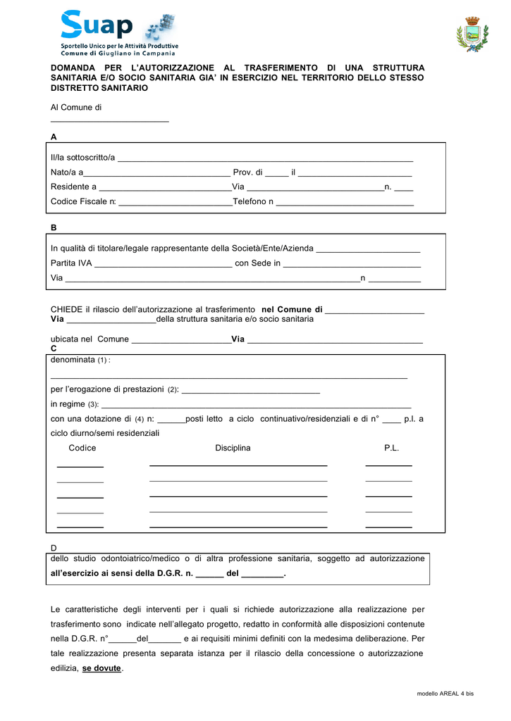 DOMANDA PER L’AUTORIZZAZIONE AL TRASFERIMENTO DI UNA STRUTTURA SANITARIA E/O SOCIO SANITARIA GIA’ IN ESERCIZIO NEL TERRITORIO DELLO STESSO DISTRETTO SANITARIO Al Comune di _________________________ A Il/la sottoscritto/a ______________________________________________________________ Nato/a a_______________________________ Prov. di _____ il ________________________ Residente a ____________________________Via _____________________________n. ____ Codice Fiscale n: ________________________Telefono n _____________________________ B In qualità di titolare/legale rappresentante della Società/Ente/Azienda ______________________ Partita IVA _____________________________ con Sede in _____________________________ Via ______________________________________________________________n ___________ CHIEDE il rilascio dell’autorizzazione al trasferimento nel Comune di _____________________ Via ___________________della struttura sanitaria e/o socio sanitaria ubicata nel Comune _____________________Via _____________________________________ C denominata (1) : ___________________________________________________________________________ per l’erogazione di prestazioni (2): _____________________________ in regime (3): _________________________________________________________________ con una dotazione di (4) n: ______posti letto a ciclo continuativo/residenziali e di n° ____ p.l. a ciclo diurno/semi residenziali Codice Disciplina P.L. D dello studio odontoiatrico/medico o di altra professione sanitaria, soggetto ad autorizzazione all’esercizio ai sensi della D.G.R. n. ______ del _________. Le caratteristiche degli interventi per i quali si richiede autorizzazione alla realizzazione per trasferimento sono indicate nell’allegato progetto, redatto in conformità alle disposizioni contenute nella D.G.R. n°______del_______ e ai requisiti minimi definiti con la medesima deliberazione. Per tale realizzazione presenta separata istanza per il rilascio della concessione o autorizzazione edilizia, se dovute. modello AREAL 4 bis A tal fine dichiara, consapevole della responsabilità penale cui può andare incontro per dichiarazioni mendaci, che il trasferimento non comporta ampliamento e trasformazione della struttura: E denominata (1) : già autorizzata con atto (*) del _________________ n. ________ del ___________ attualmente eroga prestazioni (2): _____________________________________________ in regime (3): ________________________________________________________________ con una dotazione di (4) n: ______posti letto a ciclo continuativo/residenziali e di n° ____ p.l. a ciclo diurno/semi residenziali Codice Disciplina P.L. * indicare l’ultimo provvedimento autorizzativo, se riferito a tutte le attività della struttura; in caso di autorizzazioni parziali allegare alla presente un elenco contenente gli estremi degli ultimi atti autorizzativi. Data___________ Firma ________________________________________ (per esteso) 2 modello AREAL 4 bis Istruzioni per la compilazione del Modello AReal.4 bis La domanda di autorizzazione al trasferimento di una struttura sanitaria e/o socio sanitaria nel territorio dello stesso distretto sanitario va presentata congiuntamente alla domanda di concessione o autorizzazione edilizia, se dovute. La stessa deve essere prodotta: ; in due copie. Nel caso il trasferimento sia richiesto in altro Comune appartenente allo stesso distretto della stessa ASL, una ulteriore copia della domanda va inviata, per conoscenza, al Comune dal quale si intende trasferirsi. Il riquadro A deve essere sempre compilato integralmente. Nel caso degli Studi associati soggetti ad autorizzazione vanno indicati i nominativi e i dati anagrafici di tutti gli associati. Il riquadro B deve essere compilato nel caso in cui la titolarità della struttura sia di una Società, Ente, Azienda o comunque di una persona giuridica. Il riquadro C deve essere compilato indicando: al punto (1) la denominazione della struttura; al punto (2) la tipologia delle prestazioni che si intende erogare a seguito di autorizzazione al trasferimento nell’ambito di quelle individuate dalla DGR n°___________ del ________ e precisamente: nel regime ambulatoriale extra o intraospedaliero: 1) 2) 3) 4) specialistiche mediche: classe 1–2-3 specialistiche chirurgiche: classe 1-2-3 odontoiatriche di medicina di laboratorio: laboratori generali di base laboratori generali di base con settori specializzati: A,B,C,D,E,F laboratori specializzati: A,B, C, D, E, F punti prelievo esterni 5) di anatomia patologica 6) di medicina trasfusionale 7) 8) 9) 10) 11) 12) 13) 14) 15) 16) di diagnostica per immagini di radioterapia di medicina nucleare in vivo di riabilitazione di dialisi di terapia iperbarica centro di salute mentale di consultorio familiare di trattamento delle tossicodipendenze centri erogatori di prestazioni di diabetologia nel regime di ricovero ospedaliero a ciclo continuativo o diurno: 1) polispecialistiche (specificare la specialità) 2) monospecialistiche (specificare la specialità) 3) di alta specializzazione (specificare il tipo) secondo il seguente elenco: Codice 01 5 8 52 18 19 19579 58 21 20 24 25 26 29 32 64 68 40 70 71 51 54 9 9599 10 12 13 14 7 30 9500 43 36 34 38 35 Disciplina Area medica Allergologia Angiologia Cardiologia Dermatologia Ematologia Endocrinologia Diabetologia Gastroenterologia Geriatria Immunologia Malattie infettive Medicina del Lavoro Medicina generale Nefrologia Neurologia Oncologia Pneumologia Psichiatria Radioterapia Reumatologia Oss. Breve - Ast. Med. Chirurgica Emodialisi Area Chirugica Chirurgia Generale Chirurgia d' urgenza Chirurgia maxillo facciale Chirurgia plastica Chirurgia toracica Chirurgia vascolare Cardiochirurgia Neurochirurgia Chirurgia con trapianto Urologia Ortopedia Oculistica Otorinolaringoiatria Odontostomatologia Codice 3 49 50 47 28 Disciplina Area Terapia Intensive Rian.T.Intensiv Poliv U.T.I.C. Grandi ustionati Unita' spinale 37 73 73573 62 39 11 33 Area Materno Infantile Ostet