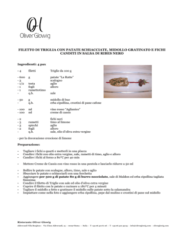 FILETTO DI TRIGLIA CON PATATE SCHIACCIATE, MIDOLLO GRATINATO E FICHI CANDITI IN SALSA DI RIBES NERO Ingredienti: 4 pax -4 filetti Triglie da 100 g - 600 -3 - 1/2 -1 -1 - g testa fogli rametto timo q.b. patate “La Ratte” scalogno aglio alloro - 50 - g q.b. midollo di bue erba cipollina, crostini di pane cafone - 100 - 100 ml ml vino rosso “Aglianico” creme di cassis -2 -3 -3 -2 - rametti spicchi fogli q.b. fichi neri timo al limone aglio alloro sale, olio d’oliva extra vergine sale - per la decorazione crescione di limone Preparazione: - Tagliare i fichi a quarti e metterli in una placca Condire i fichi con olio extra vergine, sale, rametti di timo, aglio e alloro Candire i fichi al forno a 80°C per 40 min - Mettere Creme de Cassis con vino rosso in una pentola e lasciarlo ridurre a 50 ml - Bollire le patate con scalogne, alloro, timo, sale e aglio Sbucciare le patate e schiacciarli con una forchetta Aggiungere per 500 g di patate 80 g di burro nocciolato, sale di Maldon ed erba cipollina tagliata finissima Condire il filetto di Triglie con sale ed olio d’oliva extra vergine Coprire il filetto con le patate e cucinare a 180°C per 4 minuti Tagliare il midollo a fette e gratinare il midollo sulle patate sotto la salamandra Impiattare come nella foto e aggiungere erba cipollina, pepe dal mulino e crostini di pane sul midollo - Ristorante Oliver Glowig Aldrovandi Villa Borghese - Via Ulisse Aldrovandi, 15 - 00197 Roma – Italia - T +39 06 321 61 26 - T +39 06 322 39 93 - [email protected] - oliverglowig.com