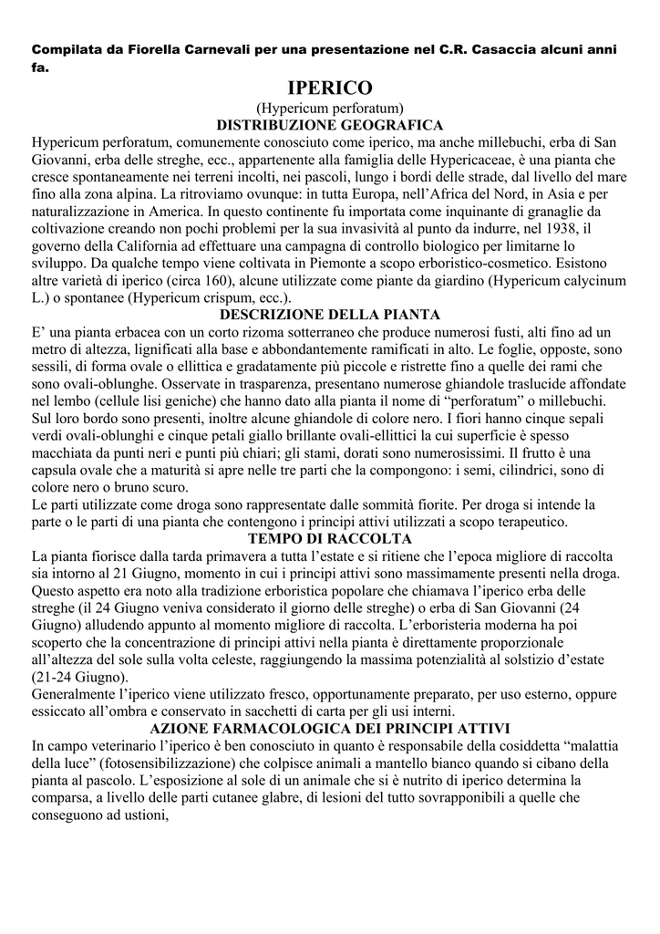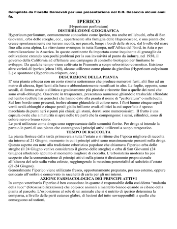 Compilata da Fiorella Carnevali per una presentazione nel C.R. Casaccia alcuni anni fa. IPERICO (Hypericum perforatum) DISTRIBUZIONE GEOGRAFICA Hypericum perforatum, comunemente conosciuto come iperico, ma anche millebuchi, erba di San Giovanni, erba delle streghe, ecc., appartenente alla famiglia delle Hypericaceae, è una pianta che cresce spontaneamente nei terreni incolti, nei pascoli, lungo i bordi delle strade, dal livello del mare fino alla zona alpina. La ritroviamo ovunque: in tutta Europa, nell’Africa del Nord, in Asia e per naturalizzazione in America. In questo continente fu importata come inquinante di granaglie da coltivazione creando non pochi problemi per la sua invasività al punto da indurre, nel 1938, il governo della California ad effettuare una campagna di controllo biologico per limitarne lo sviluppo. Da qualche tempo viene coltivata in Piemonte a scopo erboristico-cosmetico. Esistono altre varietà di iperico (circa 160), alcune utilizzate come piante da giardino (Hypericum calycinum L.) o spontanee (Hypericum crispum, ecc.). DESCRIZIONE DELLA PIANTA E’ una pianta erbacea con un corto rizoma sotterraneo che produce numerosi fusti, alti fino ad un metro di altezza, lignificati alla base e abbondantemente ramificati in alto. Le foglie, opposte, sono sessili, di forma ovale o ellittica e gradatamente più piccole e ristrette fino a quelle dei rami che sono ovali-oblunghe. Osservate in trasparenza, presentano numerose ghiandole traslucide affondate nel lembo (cellule lisi geniche) che hanno dato alla pianta il nome di “perforatum” o millebuchi. Sul loro bordo sono presenti, inoltre alcune ghiandole di colore nero. I fiori hanno cinque sepali verdi ovali-oblunghi e cinque petali giallo brillante ovali-ellittici la cui superficie è spesso macchiata da punti neri e punti più chiari; gli stami, dorati sono numerosissimi. Il frutto è una capsula ovale che a maturità si apre nelle tre parti che la compongono: i semi, cilindrici, sono di colore nero o bruno scuro. Le parti utilizzate come droga sono rappresentate dalle sommità fiorite. Per droga si intende la parte o le parti di una pianta che contengono i principi attivi utilizzati a scopo terapeutico. TEMPO DI RACCOLTA La pianta fiorisce dalla tarda primavera a tutta l’estate e si ritiene che l’epoca migliore di raccolta sia intorno al 21 Giugno, momento in cui i principi attivi sono massimamente presenti nella droga. Questo aspetto era noto alla tradizione erboristica popolare che chiamava l’iperico erba delle streghe (il 24 Giugno veniva considerato il giorno delle streghe) o erba di San Giovanni (24 Giugno) alludendo appunto al momento migliore di raccolta. L’erboristeria moderna ha poi scoperto che la concentrazione di principi attivi nella pianta è direttamente proporzionale all’altezza del sole sulla volta celeste, raggiungendo la massima potenzialità al solstizio d’estate (21-24 Giugno). Generalmente l’iperico viene utilizzato fresco, opportunamente preparato, per uso esterno, oppure essiccato all’ombra e conservato in sacchetti di carta per gli usi interni. AZIONE FARMACOLOGICA DEI PRINCIPI ATTIVI In campo veterinario l’iperico è ben conosciuto in quanto è responsabile della cosiddetta “malattia della luce” (fotosensibilizzazione) che colpisce animali a mantello bianco quando si cibano della pianta al pascolo. L’esposizione al sole di un animale che si è nutrito di iperico determina la comparsa, a livello delle parti cutanee glabre, di lesioni del tutto sovrapponibili a quelle che conseguono ad ustioni, accompagnate da sintomi di eccitamento psicomotorio e nei casi gravi da emolisi, attacchi epilettici e morte. I sintomi scompaiono rapidamente mettendo all’ombra gli animali colpiti, mentre le piaghe seguono il normale corso di cicatrizzazione. Questa particolare malattia è dovuta alla presenza nelle sommità fiorite della pianta di sostanze foto dinamiche e specificamente di derivati diantronici ed antranolici di cui il più noto è l’ipericina (ma anche l’iperico-deidro-diantrone, la pseudoipericina ecc.). Questa come tutte le sostanze foto dinamiche, ha la caratteristica di emettere fluorescenza rossa quando viene colpita da radiazioni eccitanti come le radiazioni luminose e i raggi ultravioletti. Gli elettroni esterni delle molecole fotodinamiche, a seguito dell’energia accumulata, vengono sbalzati dal proprio orbitale e nel momento che ritornano alla posizione originaria la rilasciano. Questa energia liberata determina modificazioni ioniche (fenomeno dell’attivazione dell’acqua) che portano alla formazione di composti tossici e caustici per le cellule ed i tessuti in cui è presente la sostanza fotodinamica. Questo è il processo che avviene all’interno dei capillari sanguigni del circolo cutaneo ed è responsabile delle lesioni tipo ustioni che compaiono. Quando il processo avviene in estese parti del distretto capillare corporeo, specie se in quello cerebrale, compaiono i sintomi di eccitazione psicomotoria cui si è accennato. Un’altra classe di composti presenti nell’iperico, farmacologicamente attivi, è rappresentata dai composti flavonici: iperina, quercitina, quercitrina e rutina. I composti flavonici sono classificati fra le sostanze ad azione vitaminica P note per la loro azione vasoprotettrice a livello capillare (Fattore di resistenza capillare) e di diminuzione della permeabilità vasale. Secondo alcuni autori l’iperina sarebbe più attiva della rutina sui vasi grazie alla presenza galattosio che permetterebbe una migliore diffusione a livello di parete capillare. L’iperico contiene inoltre un olio essenziale composto principalmente da terpeni e sesquiterpeni, a cui verrebbero attribuite le proprietà antibatteriche delle preparazioni per uso esterno dell’iperico. I terpeni hanno, infatti, spiccate proprietà antibatteriche impedendo lo sviluppo dei germi sulle piaghe. Sono inoltre presenti numerosi altri composti come tannini, vitam