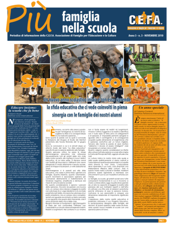 Più famiglia nella scuola Periodico di informazione della C.E.F.A. Associazione di Famiglie per l’Educazione e la Cultura Sfida Educare insieme: la scuola che fa bene di Gianni Vicari Direttore Iunior International N el preparare, alcuni giorni fa, una relazione sul tema “Scuole promosse da Genitori”, ho riletto alcuni paragrafi della Carta dei principi delle scuole Faes, realizzata nel 1977, e sono rimasto particolarmente colpito - come se lo leggessi per la prima volta! - dall’art. 2, comma 3 in cui si dice esplicitamente che i genitori sono i primi e principali educatori dei figli ed è di loro pertinenza la scelta del tipo di educazione da dare loro. Il tutto è avvalorato anche da illustri documenti di riferimento come l’art. 26 della Dichiarazione Universale dei Diritti dell’Uomo e l’art. 30 della Costituzione della Repubblica Italiana: oggi, più che mai, abbiamo bisogno di rimettere a fuoco questo tema sostenendo tutti i padri e le madri ad affrontare con coraggio questa sfida. Recentemente il Ministro della Pubblica Istruzione Italiana, Maria Stella Gelmini, in occasione della giornata europea del Genitore che aveva come tema “Educare insieme: la scuola che fa bene”, ha sottolineato che l’emergenza educativa è diventata una priorità nella società attuale che è sempre più orientata a traguardi di successo personale, ma poco sensibile alla formazione umana e alle relazioni interpersonali significative. “Educare insieme: la scuola che fa bene”... in questa bellissima espressione è sintetizzato il nostro progetto scolastico in cui è presente la collaborazione Famiglia e Scuola e la bellezza e l’efficacia che questa stessa alleanza produce nelle realtà educative della CEFA. Forte di questa convinzione mi accingo a comunicare al Parlamento Europeo il prossimo 16 novembre una breve relazione su “Presentaciòn de buenas practicas de participaciòn de las partes interesadas” in quanto ospite dell’OIDEL (Organisation International pour le droit à l’Education et Liberté d’Enseignement), di cui il FAES è membro ormai da molti anni. Anno 3 - n. 3 - NOVEMBRE 2010 raccolta! Un nuovo anno scolastico inizia e con esso riprende la sfida educativa che ci vede coinvolti in piena sinergia con le famiglie dei nostri alunni della Prof.ssa Mirella Rossi Ufficio Studi CEFA “È emersa, accanto alla preoccupazione per l’emergenza, la volontà di raccogliere la sfida e la consapevolezza di una radicata speranza…” Sono queste le parole con le quali si conclude la Relazione del Gruppo di Studio dei Genitori presentata alla Tavola Rotonda del 12 giugno scorso. Sono le conclusioni a cui si è arrivati dopo un attento studio del testo “La sfida educativa” soprattutto per la sezione dedicata alla famiglia. Questo percorso critico ha preso le mosse dall’emergenza educativa che attraversa trasversalmente tutti gli ambiti della vita civile della nostra società, per mettere in luce il deficit educativo, di cui essa soffre. Si rilevano ormai con facilità gli insuccessi e i fallimenti che vanno allargando in modo allarmante il tessuto sociale, pieno di strappi e lacerazioni, a volte abbastanza vistosi. Dall’emergenza si è passati poi alla sfida educativa, che vede in prima linea i genitori e la famiglia. Quante iniziative, quanto volontariato, quanti movimenti e associazioni operano per contrastare direttamente e indirettamente le tendenze negative, amplificate a dismisura dai mezzi di comunicazione sociale! Da questa considerazione si aprono i percorsi della speranza. Occorre recuperare una buona vista, un campo visivo idoneo a leggere la realtà non sulla base di un vago idealismo o di una fede proiettata nell’aldilà, ma neanche sulla base di un piatto empirismo, ma un campo visivo completo: quindi uno sguardo ravvicinato sul dato concreto e uno sguardo che questo dato trascende, cioè il senso profondo della vita e delle cose. Bisogna ritornare ai fondamenti, agli interrogativi di base per non confondere l’effimero con l’essenziale in un circolo vizioso di imperativi indotti. Realisti e lungimiranti. Nel contesto in cui viviamo Più Famiglia nella Scuola - Anno 3 N. 3 - novembre 2010 non è facile essere né realisti né lungimiranti. Viviamo l’attimo fuggente e la realtà si identifica con il nudo dato di fatto privo di collegamenti e di spessore. E’ impossibile pertanto spingere lo sguardo oltre il contingente e di conseguenza acquisire quella dimensione di lungimiranza che è speranza costruttiva per un futuro migliore. Tornano alla mente le parole di Jean Guitton “abbiamo il dovere di essere intelligenti” cioè recuperare un campo visivo a 360°. Quanto valgono queste considerazioni se riferite alla cultura e all’educazione a cui per altro si ispira la Carta dei Principi del FAES, oggi più attuale che mai! La cultura indica la nostra storia sulla quale e nella quale realisticamente ci siamo costruiti e l’educazione è quel lavorio personale in cui quella storia diventa la “mia” storia. “L’educazione deve riprendere il suo ruolo, cioè diventare una elaborazione riflessiva della cultura”. Solo in questo modo radici culturali e familiari, tradizioni potranno essere rigenerate e trasmesse con arricchimenti nuovi e con modalità in sintonia con i tempi. La famiglia, la scuola, gli ambiti sociali sono tutte componenti fondamentali in cui ci troviamo a vivere. Lo sforzo allora, oggi, è quello di recuperare da un lato la capacità di leggere la realtà nella pienezza dei suoi molteplici aspetti e dall’altro di coltivare una fitta rete di relazioni autentiche perché attraverso di esse la persona matura, costruisce la sua personalità e sviluppa una dimensione relazionale di importante significato sociale. L’esperienza della nostra realtà educativa è proiettata attraverso il suo Progetto Educativo, la partecipazione allargata delle famiglie, dei docenti, di quanti operano nelle nostre strutture, verso questo nuovo mo