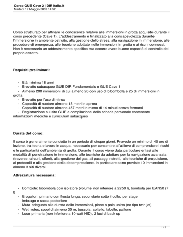 Corso GUE Cave 2 | DIR Italia.it Martedì 12 Maggio 2009 14:52 Corso strutturato per affinare le conoscenze relative alle immersioni in grotta acquisite durante il corso precedente (Cave 1). L'addestramento è finalizzato alla consapevolezza durante l'immersione in ambiente ostruito, alla gestione dello stress, alla navigazione in immersione, alle procedure di emergenza, alle tecniche adottate nelle immersioni in grotta e ai rischi connessi. Non è necessario un addestramento specifico ma occorre avere buone capacità di controllo del proprio assetto. Requisiti preliminari: - Età minima 18 anni - Brevetto subacqueo GUE DIR Fundamentals e GUE Cave 1 - Almeno 200 immersioni di cui almeno 20 con uso di bibombola e 25 di immersioni in grotta - Brevetto per l'uso di nitrox - Capacità di nuotare almeno 18 metri in apnea - Capacità di nuotare almeno 457 metri in meno di 14 minuti senza fermarsi - Registrazione sul sito GUE e compilazione della scheda personale contenente informazioni mediche e curriculum subacqueo Durata del corso: Il corso è generalmente condotto in un periodo di cinque giorni. Prevede un minimo di 40 ore di lezione, tra teoria e lavoro in acqua, necessarie per consentire all’allievo di comprendere i rischi e le particolarità dell’ambiente di grotta. Durante il corso viene data particolare enfasi alle modalità di penetrazione in immersione, alle tecniche da adottare per la navigazione avanzata (traverse, circuiti, sifoni), alla gestione del gas, ai passaggi ristretti, alle tecniche di propulsione, ai protocolli e alla gestione della decompressione. In particolare sono previste 10 immersioni in almeno 3 siti diversi. Attrezzatura necessaria: l) - Bombole: bibombola con isolatore (volume non inferiore a 2250 l), bombola per EAN50 (7 - Erogatori: primario con frusta lunga, secondario sotto il collo, per stage Imbrago e sacca posteriore Muta adeguata alla durata delle immersioni, pinne a pala unica (no tipo twin jet) Wet notes, spool di almeno 30 m, bussola, coltello, tabelle, pallone Luce primaria (non inferiore a 10 watt HID), 2 luci di back up 1/2 Corso GUE Cave 2 | DIR Italia.it Martedì 12 Maggio 2009 14:52 - Spool primario per team con non meno di 90 m di cima Limiti del corso: - Rapporto tra allievo ed istruttore non superiore a 3:1 in acqua Consumo di gas: 1/3 del gas per l'immersione visibilità minima per iniziare l'immersione: 6 metri Volume minimo di gas per iniziare l'immersione: 3950 litri Immersioni in ambiente con passaggi ristretti Immersioni con navigazione complessa (jump, trevrse, circuiti, gap) Immersioni con decompressione Immersioni senza uso di scooter Immersioni con uso di stage aggiuntive Testi consigliati: - Doing it Right: I fondamentali del DIR. Jarrod Jablonski, GUE, 2001 - Beyond the daylight zone: the fundamentals of cave diving. Jarrod Jablonski, Panos Alexakos, Todd Kincaid. GUE, 2003 2/2