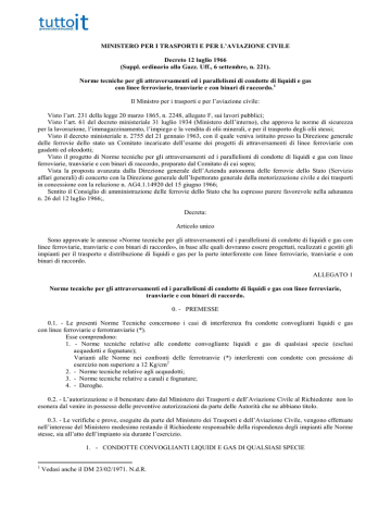 MINISTERO PER I TRASPORTI E PER L’AVIAZIONE CIVILE Decreto 12 luglio 1966 (Suppl. ordinario alla Gazz. Uff., 6 settembre, n. 221). Norme tecniche per gli attraversamenti ed i parallelismi di condotte di liquidi e gas con linee ferroviarie, tranviarie e con binari di raccordo. 1 Il Ministro per i trasporti e per l’aviazione civile: Visto l’art. 231 della legge 20 marzo 1865, n. 2248, allegato F, sui lavori pubblici; Visto l’art. 61 del decreto ministeriale 31 luglio 1934 (Ministero dell’interno), che approva le norme di sicurezza per la lavorazione, l’immagazzinamento, l’impiego e la vendita di olii minerali, e per il trasporto degli olii stessi; Visto il decreto ministeriale n. 2755 del 21 gennaio 1963, con il quale veniva istituito presso la Direzione generale delle ferrovie dello stato un Comitato incaricato dell’esame dei progetti di attraversamenti di linee ferroviarie con gasdotti ed oleodotti; Visto il progetto di Norme tecniche per gli attraversamenti ed i parallelismi di condotte di liquidi e gas con linee ferroviarie, tranviarie e con binari di raccordo, preparato dal Comitato di cui sopra; Vista la proposta avanzata dalla Direzione generale dell’Azienda autonoma delle ferrovie dello Stato (Servizio affari generali) di concerto con la Direzione generale dell’Ispettorato generale della motorizzazione civile e dei trasporti in concessione con la relazione n. AG4.1.14920 del 15 giugno 1966; Sentito il Consiglio di amministrazione delle ferrovie dello Stato che ha espresso parere favorevole nella adunanza n. 26 del 12 luglio 1966;, Decreta: Articolo unico Sono approvate le annesse «Norme tecniche per gli attraversamenti ed i parallelismi di condotte di liquidi e gas con linee ferroviarie, tranviarie e con binari di raccordo», in base alle quali dovranno essere progettati, realizzati e gestiti gli impianti per il trasporto e distribuzione di liquidi e gas per la parte interferente con linee ferroviarie, tranviarie e con binari di raccordo. ALLEGATO 1 Norme tecniche per gli attraversamenti ed i parallelismi di condotte di liquidi e gas con linee ferroviarie, tranviarie e con binari di raccordo. 0. - PREMESSE 0.1. - Le presenti Norme Tecniche concernono i casi di interferenza fra condotte convoglianti liquidi e gas con linee ferroviarie e ferrotranviarie (*). Esse comprendono: 1. - Norme tecniche relative alle condotte convogliante liquidi e gas di qualsiasi specie (esclusi acquedotti e fognature); Varianti alle Norme nei confronti delle ferrotranvie (*) interferenti con condotte con pressione di esercizio non superiore a 12 Kg/cm2 2. - Norme tecniche relative agli acquedotti; 3. - Norme tecniche relative a canali e fognature; 4. - Deroghe. 0.2. - L’autorizzazione o il benestare dato dal Ministero dei Trasporti e dell’Aviazione Civile al Richiedente non lo esonera dal venire in possesso delle preventive autorizzazioni da parte delle Autorità che ne abbiano titolo. 0.3. - Le verifiche e prove, eseguite da parte del Ministero dei Trasporti e dell’Aviazione Civile, vengono effettuate nell’interesse del Ministero medesimo restando il Richiedente responsabile della rispondenza degli impianti alle Norme stesse, sia all’atto dell’impianto sia durante l’esercizio. 1. - CONDOTTE CONVOGLIANTI LIQUIDI E GAS DI QUALSIASI SPECIE 1 Vedasi anche il DM 23/02/1971. N.d.R. (ESCLUSI ACQUEDOTTI E FOGNATURE); 1.0. - Le condotte di liquidi e gas, esclusi acquedotti e fognature, nei tratti in cui attraversano linee ferroviarie e ferrotranviarie, o corrono ad esse parallele, devono rispondere alle seguenti Norme: 1.1. - Attraversamenti. Gli attraversamenti si distinguono in: 1. interrati; 2. superiori; 3. inferiori. 1.1.1. - Attraversamenti interrati. Sono quelli realizzati con le condotte interrate al disotto della sede ferroviaria o tranviaria (alleg. n. 1). 1.1.1.1. - Non è ammesso l’attraversamento di marciapiedi di stazione, di piani caricatori o di altre installazioni fisse. Non è ammesso altresì l’attraversamento di fasci di binari aventi larghezza maggiore di 20 m misurata fra le rotaie esterne dei binari estremi. 1.1.1.2. - Il tracciato dell’attraversamento dovrà essere rettilineo e normale all’asse del binario. Però, quando particolari condizioni lo impongano, è consentito che il tracciato stesso formi con la normale all’asse del binario, un angolo non superiore a 15°. 1.1.1.3. - In prossimità di opere d’arte l’attraversamento dovrà essere realizzato in modo tale da non interessare le strutture delle opere stesse e consentire l’eventuale esecuzione di lavori. In ogni caso l’attraversamento dovrà risultare a distanza non inferiore a 10 m dal filo esterno della struttura più vicina. 1.1.1.4. - La condotta dovrà essere contenuta entro un tubo di maggior diametro (tubo di protezione) avente le caratteristiche riportate al paragrafo 1.4. e dovrà avere una pendenza uniforme non inferiore al due per mille in direzione dello spurgo. 1.1.1.5. - La profondità di interramento delle condotte (altezza del terreno sovrastante la generatrice superiore del tubo di protezione), nel tratto sottostante ai binari più una ulteriore lunghezza minima di 20 m dalla più vicina rotaia e da ambo i lati della ferrovia o tranvia, non dovrà essere inferiore a 2 m per le linee ferroviarie e ad 1 m per le ferrotranvie. 1.1.1.6. - Le profondità di cui sopra sono irriducibili in corrispondenza ai binari, compresi due tratti esterni, ciascuno della lunghezza di 3 m dalla più vicina rotaia. É ammesso che, nei restanti due tratti compresi tra 3 m e 20 m dalla rotaia esterna, si abbia una minore profondità di interramento, in ogni caso mai inferiore ad 1 m, a condizione che la tubazione sia protetta superiormente da lastroni di calcestruzzo di cemento armato, aventi le caratteristiche riportate nel disegno allegato n. 2. La distanza minima fra la faccia inferiore del lastrone e la generatrice superiore della tubazione non potrà mai essere inferiore a cm 50. NOT