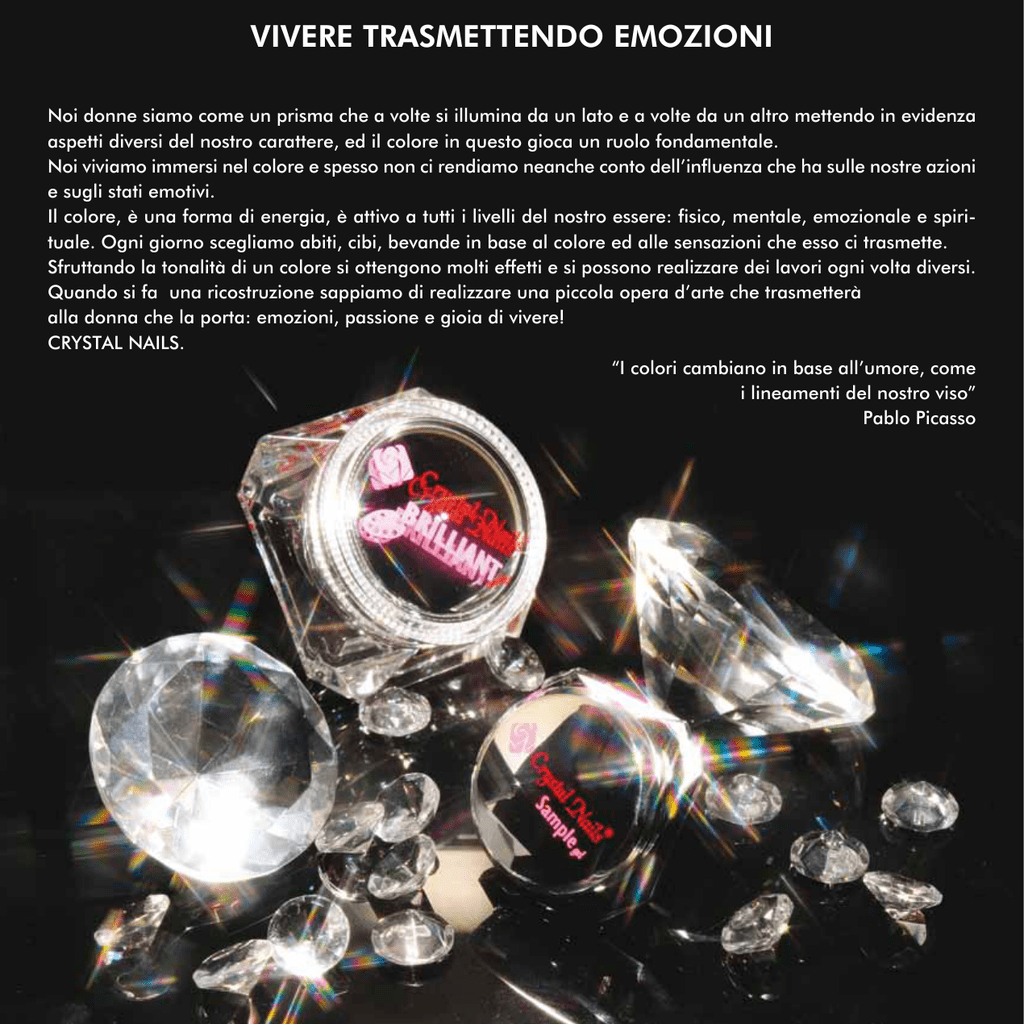 VIVERE TRASMETTENDO EMOZIONI Noi donne siamo come un prisma che a volte si illumina da un lato e a volte da un altro mettendo in evidenza aspetti diversi del nostro carattere, ed il colore in questo gioca un ruolo fondamentale. Noi viviamo immersi nel colore e spesso non ci rendiamo neanche conto dell’influenza che ha sulle nostre azioni e sugli stati emotivi. Il colore, è una forma di energia, è attivo a tutti i livelli del nostro essere: fisico, mentale, emozionale e spirituale. Ogni giorno scegliamo abiti, cibi, bevande in base al colore ed alle sensazioni che esso ci trasmette. Sfruttando la tonalità di un colore si ottengono molti effetti e si possono realizzare dei lavori ogni volta diversi. Quando si fa una ricostruzione sappiamo di realizzare una piccola opera d’arte che trasmetterà alla donna che la porta: emozioni, passione e gioia di vivere! CRYSTAL NAILS. “I colori cambiano in base all’umore, come i lineamenti del nostro viso” Pablo Picasso nonsolo com nonsolo UNGHIE . La Nostra Tecnica e i Nostri Prodotti Vi faranno Distinguere www.crystalnails.it I Prodotti ® Crystal Nails è un marchio che investe ogni sei mesi nella ricerca per poter offrire ai propri clienti prodotti sempre innovativi, che permettano di essere all’avanguardia con le richieste del mercato. Tutti i prodotti Crystal Nails corrispondono alle leggi americane, sono sottoposti a severi controlli della Comunità Europea e sono regolarmente notificati al Ministero della Salute Italiano per la vostra tranquillità e la sicurezza delle vostre clienti. Crystal Nails è un prodotto made in U.S.A. LIGURIA - Lombardia - Veneto - Friuli - Piemonte - Valle D’Aosta - Toscana - Marche - Romagna - San Marino Abruzzo - Sardegna - Campania - Puglia - Calabria - Sicilia nonsolo Nonsolounghie.com srl è presente sul mercato italiano dalla fine del 2006, da sempre con l’obiettivo di fornire prodotti orientati alla soluzione delle esigenze degli operatori nel mondo della cura e dell’estetica di mani e piedi. Oggi Nonsolounghie.com è una realtà consolidata e presente in modo capillare su tutto il territorio Italiano. nonsolo com Nonsolounghie.com srl ® UNGHIE . Nella sede di Genova è nato da piu’ di 2 anni un fornitissimo Cash & Carry all’ingrosso e poco distante è stata aperta la Nails University, una delle più moderne strutture multimediali per la formazione professionale delle onicotecniche, avvalendosi delle migliori insegnanti Internazionali. Nonsolounghie.com distribuisce su tutto il territorio nazionale il prestigioso marchio Crystal Nails ricco di prodotti innovativi con un rapporto qualità/prezzo tra i migliori sul mercato. Al momento Crystal Nails offre ai propri clienti una gamma di prodotti ineguagliabile, dai Builder Gel più resistenti e facili da stendere, agli oltre 270 colori con effetti metallici, glitterati, microperlati, opachi, coprenti, traslucidi, cangianti, oltre ai gel: tridimensionali, per il camouflage (in grado di coprire ed allungare il letto ungueale), bianchi superlativi per il french e lucidanti con un realistico effetto bagnato. Inoltre Crystal Nails offre una disponibilità pressoché infinita di polveri acriliche e pitture in base acqua. A tutto ciò si aggiungono le attrezzature più innovative per la corretta esecuzione della tecnica ricostruttiva e/o per la Nail Art più esclusiva. Pennelli appositamente progettati e realizzati per l’utilizzo ottimale dei prodotti e delle tecniche crystal nails, lampade UV molto efficienti e frese silenziose indicate sia per la rimozione del Gel che per l’Acrilico. Nonostante i successi e la continua ricerca di nuovi materiali la filosofia, però, resta sempre la stessa: proporre prodotti mirati e specifici per le esigenze delle onicotecniche affinchè ne traggano il maggior profitto, proprio perché studiati per le quotidiane necessità operative. Molti sono i clienti che grazie ai prodotti Crystal Nails ed alla continua formazione, hanno investito ed hanno potuto raggiungere diversi traguardi con soddisfazione personale ed economica. Oggi i campioni Internazionali più famosi usano Crystal Nails riconoscendo di fatto il primato tecnologico e qualitativo del prodotto. 4 Franchising Crystal Nails Nonsolounghie.com, titolare per l’Italia del marchio Crystal Nails, ha un concetto molto personale del termine “Franchising” e decisamente diverso dallo standard che offre oggi il mercato. Per franchising noi intendiamo: • • • • • • Collaborazione costante Formazione e un training continuo attraverso i nostri corsi e seminari Alta rimuneratività Una vasta offerta di servizi e prodotti Un basso impegno economico finanziario Nessuna quota di ingresso. Per semplificare offriamo una proposta di Franchising che sia una ALLEANZA Far parte del Franchising Crystal Nails significa accedere da subito a: • Una linea di prodotti tra le più innovative, complete ed apprezzate nel mondo della ricostruzione unghie e della cura delle mani. • Un canale privilegiato per le novità del settore. • Un percorso formativo completo e certificato, dal corso base a veri e propri seminari di tecnica avanzata per concorsi e gare anche di livello internazionale. • Una visibilità del marchio Crystal Nails a livello Nazionale, attraverso pubblicità e redazionali sulle più quotate riviste del settore. • Un supporto fiscale/amministrativo e di marketing (se richiesto). • Un numero verde nazionale 800.180.005 per una migliore accoglienza del cliente. • Un sito internet www.crystalnails.it dove essere presenti attraverso banner e redazionali. • Una casella di posta elettronica personalizzata. • Le migliori condizioni di acquisto dei prodotti Crystal Nails con sconti e prezzi imbattibili, mantenendo la più alta qualità del prodotto. • La totale autonomia gestionale ed amministrativa. • Una condivisione totale della conoscenza su questa affascinante materia. Per saperne di più contattaci senza alcun impegno! www.crystaln