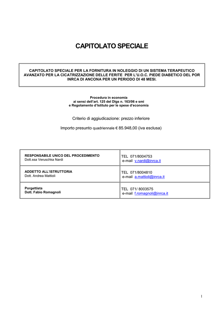 CAPITOLATO SPECIALE CAPITOLATO SPECIALE PER LA FORNITURA IN NOLEGGIO DI UN SISTEMA TERAPEUTICO AVANZATO PER LA CICATRIZZAZIONE DELLE FERITE PER L’U.O.C. PIEDE DIABETICO DEL POR INRCA DI ANCONA PER UN PERIODO DI 48 MESI. Procedura in economia ai sensi dell’art. 125 del Dlgs n. 163/06 e smi e Regolamento d’Istituto per le spese d’economia Criterio di aggiudicazione: prezzo inferiore Importo presunto quadriennale € 85.948,00 (iva esclusa) RESPONSABILE UNICO DEL PROCEDIMENTO Dott.ssa Veruschka Nardi TEL 071/8004753 e-mail [email protected] ADDETTO ALL’ISTRUTTORIA Dott. Andrea Mattioli TEL 071/8004810 e-mail [email protected] Porgettista Dott. Fabio Romagnoli TEL 071/ 8003575 e-mail [email protected] 1 INDICE ART. 1 – OGGETTO CARATTERISTICHE E QUANTITA’ DELLA FORNITURA .......................... 3 ART. 2 – IMPORTO ........................................................................................................................ 3 ART. 3 – DURATA DELLA FORNITURA ....................................................................................... 3 ART. 4 – REQUISITI TECNICI E NORMATIVI ............................................................................... 3 ART. 5 – ORGANIZZAZIONE DELLE SEDUTE, MANUTENZIONE ED INSTALLAZIONE DELL’APPARECCHIATURA.......................................................................................................... 4 ART. 6 – CONFEZIONAMENTO MATERIALI DI CONSUMO ........................................................ 4 ART. 7 – ONERI ED OBBLIGHI DELLA DITTA AGGIUDICATARIA ............................................. 4 ART. 8 – DOCUMENTAZIONE AMMINISTRATIVA ....................................................................... 5 ART. 9 – OFFERTA ECONOMICA ................................................................................................. 5 ART. 10 – PREZZI .......................................................................................................................... 5 ART. 11 – AGGIUDICAZIONE ....................................................................................................... 6 ART. 12 – DOCUMENTI (da presentare da parte dell’aggiudicatario) ........................................ 6 ART. 13 – FATTURAZIONE/MODALITA’ DI PAGAMENTO .......................................................... 6 ART. 14 – TRACCIABILITA’ DEI FLUSSI FINANZIARI ................................................................. 7 ART. 15 – DIVIETO SOSPENSIONE DELLA FORNITURA ........................................................... 7 ART. 16 – ASSICURAZIONI........................................................................................................... 7 ART. 17 – PENALITA’ E RISOLUZIONE DEL CONTRATTO ........................................................ 7 ART. 18 – FORO COMPETENTE ................................................................................................... 7 ART. 16 – DISPOSIZIONI FINALI .................................................................................................. 8 2 ART. 1 – OGGETTO CARATTERISTICHE E QUANTITA’ DELLA FORNITURA Il presente capitolato ha per oggetto la fornitura con noleggio a giornata di un Sistema terapeutico avanzato per la cicatrizzazione delle ferite per l’U.O.C. Piede Diabetico del POR INRCA di Ancona, nelle tipologie che sono descritte nei seguenti lotti: LOTTO n. 1 Indivisibile – CIG n. 48739395B2 A) SISTEMA A PRESSIONE NEGATIVA”PORTATILE” PER IL TRATTAMENTO DI PIAGHE E FERITE DIFFICILI, ACUTE E CRONICHE CON SCHIUMA DI POLIURETANO A CELLE APERTE; B) SISTEMA A PRESSIONE NEGATIVA COMBINATA CON LA TERAPIA DI INSTILLAZIONE AUTOMATIZZATA DI SOLUZIONI PER IL TRATTAMENTO DELLE FERITE CAVITARIE, TUNNELLIZZATE O SOTTOMINATE E INFETTE, CON SCHIUMA DI POLURETANO A CELLE APERTE LOTTO N. 2 – CIG n. 4874144EDB SISTEMA A PRESSIONE NEGATIVA PER IL TRATTAMENTO DI PIAGHE E FERITE DIFFICILI, ACUTE E CRONICHE CON SCHIUMA DI POLIURETANO CON STRUTTURA A NIDO D’APE A CELLULE APERTE E CHIUSE; LOTTO N. 3 – CIG n. 4874166107 SISTEMA A PRESSIONE NEGATIVA PER IL TRATTAMENTO DI PIAGHE E FERITE DIFFICILI, ACUTE E CRONICHE CON KIT DI MEDICAZIONI MONOUSO, STERILI,CON FILLER IN GARZA CON PHMB, DRENAGGIO SOFT-PORT ANTI BLOCCAGGIO E ANTIDECUBITO; come precisato nell’allegato A parte integrante e sostanziale del presente capitolato. La ditta aggiudicataria dovrà altresì provvedere a fornire, compreso nel noleggio, ogni tipo di materiale di consumo necessario per una corretta esecuzione delle medicazioni di ferite/lesioni di dimensioni piccole e medie, con esclusione delle medicazioni extra-large, delle medicazioni della mano e delle medicazioni addominali. Il numero di giornate stimate indicate nell’allegato A devono considerarsi indicative e non vincolanti per l’Istituto, in quanto sono subordinati ai pazienti che frequentano l’U.O.C. Piede Diabetico. La fornitura dovrà essere, quindi, eseguita anche per quantitativi superiori o inferiori, alle medesime condizioni, senza che il fornitore possa sollevare eccezione alcuna o pretendere, comunque, compensi o indennità di sorta. ART. 2 – IMPORTO Il valore annuo presunto della fornitura è quantificabile in € 21.487,00 + IVA. ART. 3 – DURATA DELLA FORNITURA La fornitura avrà la durata di quarantotto (48) mesi, decorrenti dalla data di effettivo inizio della stessa, come indicato al successivo art. 11 aggiudicazione. L’impresa avrà l’obbligo di continuare la fornitura alle condizioni pattuite, fino a quando l’Istituto non avrà provveduto alla stipula di un nuovo contratto e comunque non oltre 180 giorni dalla scadenza del contratto medesimo. ART. 4 – REQUISITI TECNICI E NORMATIVI La strumentazione che verrà fornita in noleggio dovrà essere conforme alle norme CEI attualmente in vigore e/o ad altre norme internazionali ufficialmente riconosciute sulla sicurezza elettrica in ambiente medicale. 3 I prodotti e relativi confezionam