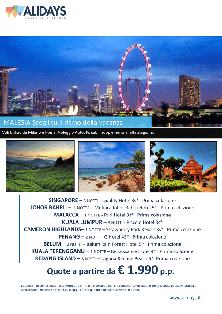 MALESIA Scegli tu il ritmo della vacanza Voli Etihad da Milano e Roma, Noleggio Auto. Possibili supplementi in alta stagione. SINGAPORE – 3 NOTTI - Quality Hotel 3s* Prima colazione JOHOR BAHRU – 1 NOTTE – Mutiara Johor Bahru Hotel 5* Prima colazione MALACCA – 1 NOTTE - Puri Hotel 3s* Prima colazione KUALA LUMPUR – 3 NOTTI - Piccolo Hotel 3s* CAMERON HIGHLANDS– 1 NOTTE – Strawberry Park Resort 3s* Prima colazione PENANG – 2 NOTTI - G Hotel 4S* Prima colazione BELUM – 2 NOTTI – Belum Rain Forest Hotel 5* Prima colazione KUALA TERENGGANU – 1 NOTTE – Renaissance Hotel 4* Prima colazione REDANG ISLAND – 5 NOTTI – Laguna Redang Beach 5* Prima colazione Quote a partire da € 1.990 p.p. La quota non comprende: Tasse Aeroportuali, pasti e bevande non indicate, mance ed extra in genere, spese gestione pratica e assicurazione medico bagaglio €60,00 p.p., e tutto quanto non espressamente indicato. www.alidays.it