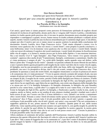 1 Don Renzo Bonetti Catechesi per sposi Anno Pastorale 2016-2017 Spunti per una crescita spirituale degli sposi in Amoris Laetitia Catechesi n. 1 La Parola di Dio e la famiglia (sbobinatura non vista dal relatore) Cari amici, quest’anno ci siamo proposti come percorso di formazione spirituale di cogliere alcuni elementi di ricchezza di spiritualità, alcune perle che ci vengono dall’Amoris Laetitia, e desideriamo mettere in risalto queste perle preziose che si trovano in questo documento post-sinodale proprio per rispondere o contrapporci a quanti, invece, hanno messo in risalto soltanto problemi o soltanto alcuni aspetti, mentre Amoris Laetitia ha una ricchezza straordinaria per il cammino degli sposi. E da ultimo, sempre per dire il motivo per cui ci siamo messi su questo sentiero lo prendo dalla conclusione del documento Amoris Laetitia, dove Papa Francesco scrive “Tutti siamo chiamati a tenere viva la tensione verso qualcosa che va oltre noi stessi e i nostri limiti”; sono proprio le parole conclusive, e sono bellissime; tener viva la tensione verso qualcosa che va oltre noi stessi e i nostri limiti. Quante volte noi stessi diventiamo il sepolcro dei nostri matrimoni, i nostri limiti diventano la fossilizzazione della vita di coppia, ci si ferma lì, mentre invece per la forza dello Spirito c’è una tensione interiore. Sta a noi tenerla viva! E “ogni famiglia”, dice Papa Francesco, “deve tenere vivo questo stimolo costante”, appresso dice anche di più “Camminiamo, famiglie, continuiamo a camminare. Quello che ci viene promesso è sempre di più.” La verità delle famiglie, anche quando sono nel dolore, nella fatica è poter dire “il meglio ha da venire”. Quando voi pensate soltanto di essere liberati da una fatica e non vi ponete dentro questa prospettiva del meglio ha da venire vuol dire che la vostra vita di coppia, di famiglia, non ha una prospettiva se non quello dello star bene, dello star tranquilli, del non avere problemi; ma non è la prospettiva divina, tant’è che più avanti, sempre Papa Francesco dice “Non perdiamo la speranza a causa dei nostri limiti, ma neppure rinunciamo a cercare la pienezza di amore e di comunione che ci è stata promessa”. Vivere in questo stimolo costante del sempre di più, ma non sempre di più per arrivare all’esaurimento nervoso; non sempre di più per un volontarismo esasperato; un sempre di più, il meglio ha da venire, perché il bello della famiglia non finisce al cimitero, il bello della famiglia è il fatto che stiamo costruendo la famiglia dei figli di Dio, una famiglia grande dove ogni sforzo ha un significato, ogni fatica ha un significato, non esiste una disgrazia della famiglia fine a se stessa per cui c’è la famiglia fortunata e la famiglia sfortunata, la famiglia che può benedire perché le cose vanno bene, e quelle altre? La coppia dove tutte le cose vanno bene, e le altre invece? Esiste la famiglia dei figli di Dio, quella è la famiglia, e finalizzata a quella è anche la mia, anche se zoppica, anche se fatica, anche se mi sembra di non ottenere risultati; perché i risultati non è solo il bene-essere di qui, ma l’essere con Dio è il bene definitivo e vero. Quindi è un invito a camminare oltre i nostri limiti. Pensate a come i limiti diventano molto spesso la nostra pietra tombale. “Cercare la pienezza” dice il Papa, cercare tutto il di più possibile nella vita di tutti i giorni; e quando non cerchiamo il più possibile nella vita di tutti i giorni, cari amici, cosa succede? Che noi cominciamo a seppellire qualcosa di noi, prima ancora di finire al cimitero. Quanta parte di noi, della nostra affettività, viene sepolta prima perché non usiamo con quel marito lì, con quella moglie là, perché ha quel difetto lì, perché ha quel difetto là; finiamo per seppellire la nostra capacità, la nostra gioia finiamo per seppellire “perché visto che tu sei così io non posso essere cosà”. Cercare la pienezza e il di più possibile nella vita di tutti i giorni. Allora andiamo al contenuto del primo capitolo dell’Esortazione Amoris Laetitia facendo subito la premessa che queste riflessioni che facciamo di volta in volta su un capitolo dell’Amoris Laetitia non è per dirvi “fate a meno di leggerla che ve la commento io”, è per farvi venire il desiderio di leggerla, perché magari lo Spirito vi dice qualcosa di più al di là di quello che ho detto io; la mia parola può essere stimolo. 2 Quindi andiamo a vedere il primo capitolo con la certezza che sintonizzandoci con questo documento post-sinodale noi andiamo a sintonizzarci con lo Spirito Santo che guida la Chiesa. Non è piccola cosa, non un progetto programmatico della vita della Chiesa con all’ordine del giorno l’urgenza che riguarda la famiglia, no! questo lo possono fare i governi, ma una Chiesa che si riunisce in comunione mossa dallo Spirito…quello che ne esce è l’azione dello Spirito santo in quel momento per la Chiesa. Quindi, cercare di capire ciò che lo Spirito Santo dice a ciascuno di voi, penso a ciascuno di voi qui presenti, penso a tutti gli ascoltatori collegati, e mettere in sintonia ciò che dice lo Spirito Santo alla Chiesa con la mia vita personale: lo Spirito Santo con questo Sinodo cosa dice a noi due? È un patrimonio della Chiesa che è dato a me, a noi due come coppia, perché solo questo ci porta a costruire il progetto divino della famiglia, non il nostro progetto. Allora, è chiaro, per costruire il progetto divino della famiglia, per costruire il progetto divino della mia coppia, cos’è l’elemento essenziale? Certo, l’amore, non c’è dubbio; ma cos’è lo strumento, anche se la parola mi sembra povera nei confronti di ciò che dice questo strumento, qual è lo strumento più importante in assoluto che mi aiuta proprio a fare i passi giusti, non sbagliare i passi nei confronti di mio marito, nei confronti di mia moglie, non sbagliare i passi nei confronti dei miei figli, nei c