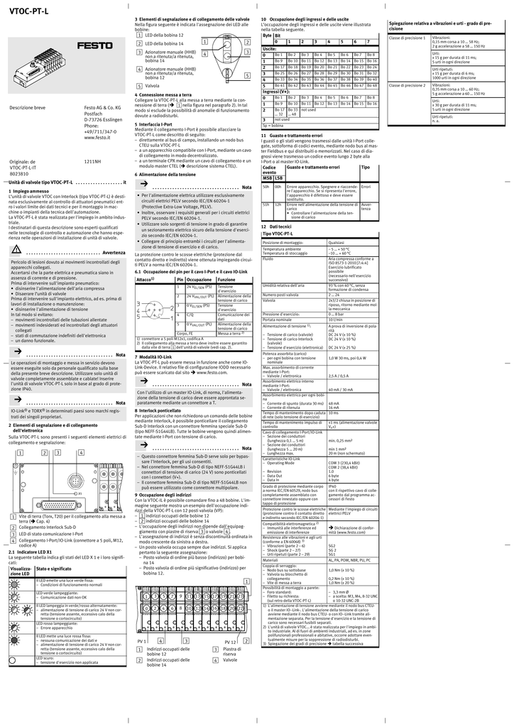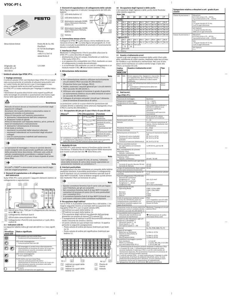 VTOC-PT-L 3 Elementi di segnalazione e di collegamento delle valvole Nella figura seguente è indicata l'assegnazione dei LED alle bobine: 1 LED della bobina 12 2 LED della bobina 14 1 2 3 Azionatore manuale (HHB) 4 3 non a ritenuta/a ritenuta, bobina 14 4 Azionatore manuale (HHB) non a ritenuta/a ritenuta, bobina 12 5 5 Valvola Descrizione breve Festo AG & Co. KG Postfach D-73726 Esslingen Phone: +49/711/347-0 www.festo.it 1211NH Originale: de VTOC-PT-L-IT 8023810 4 Connessione messa a terra Collegare la VTOC-PT-L alla messa a terra mediante la connessione di terra ( 1 nella figura nel paragrafo 2). In tal modo si esclude la possibilità di anomalie di funzionamento dovute a radiodisturbi. 5 Interfaccia I-Port Mediante il collegamento I-Port è possibile allacciare la VTOC-PT-L come descritto di seguito: – direttamente al bus di campo, installando un nodo bus CTEU sulla VTOC-PT-L – a un apparecchio compatibile con I-Port, mediante un cavo di collegamento in modo decentralizzato. – a un terminale CPX mediante un cavo di collegamento e un modulo master CTEL ( descrizione sistema CTEL). 6 Alimentazione della tensione Unità di valvole tipo VTOC-PT-L . . . . . . . . . . . . . . . . . . . it 1 Impiego ammesso L’unità di valvole VTOC con Interlock (tipo VTOC-PT-L) è destinata esclusivamente al controllo di attuatori pneumatici entro i valori limite dei dati tecnici e per il montaggio in macchine o impianti della tecnica dell'automazione. La VTOC-PT-L è stata realizzata per l'impiego in ambito industriale. I destinatari di questa descrizione sono esperti qualificati nelle tecnologie di controllo e automazione che hanno esperienza nelle operazioni di installazione di unità di valvole. . . . . . . . . . . . . . . . . . . . . . . . . . . . . . . Avvertenza Pericolo di lesioni dovuto ai movimenti incontrollati degli apparecchi collegati. Accertarsi che la parte elettrica e pneumatica siano in assenza di corrente e di pressione. Prima di intervenire sull'impianto pneumatico: • disinserire l'alimentazione dell'aria compressa • Disaerare l’unità di valvole Prima di intervenire sull'impianto elettrico, ad es. prima di lavori di installazione o manutenzione: • disinserire l'alimentazione di tensione In tal modo si evitano: – movimenti incontrollati delle tubazioni allentate – movimenti indesiderati ed incontrollati degli attuatori collegati – stati di commutazione indefiniti dell'elettronica – un danno funzionale. . . . . . . . . . . . . . . . . . . . . . . . . . . . . . . . . . . . Nota Le operazioni di montaggio e messa in servizio devono essere eseguite solo da personale qualificato sulla base della presente breve descrizione. Utilizzare solo unità di valvole completamente assemblate e cablate! Inserire l'unità di valvole VTOC-PT-L solo in base al grado di protezione IP40. . . . . . . . . . . . . . . . . . . . . . . . . . . . . . . . . . . . Nota IO-Link® e TORX® in determinati paesi sono marchi registrati dei singoli proprietari. 2 Elementi di segnalazione e di collegamento dell'elettronica Sulla VTOC-PT-L sono presenti i seguenti elementi elettrici di collegamento e segnalazione: 1 2 3 4 1 Vite di terra (Torx, T20) per il collegamento alla messa a terra ( Cap. 4) 2 Collegamento Interlock Sub-D 3 LED di stato comunicazione I-Port 4 Collegamento I-Port/IO-Link (connettore a 5 poli, M12, codice A) 2.1 Indicatore LED X1 La seguente tabella indica gli stati del LED X 1 e i loro significati: Visualizza- Stato e significato zione LED . . . . . . . . . . . . . . . . . . . . . . . . . . . . . . . . . . . Nota • Per l'alimentazione elettrica utilizzare esclusivamente circuiti elettrici PELV secondo IEC/EN 60204-1 (Protective Extra-Low Voltage, PELV). • Inoltre, osservare i requisiti generali per i circuiti elettrici PELV secondo IEC/EN 60204-1. • Utilizzare solo sorgenti di tensione in grado di garantire un sezionamento elettrico sicuro della tensione d'esercizio secondo IEC/EN 60204-1. • Collegare di principio entrambi i circuiti per l'alimentazione di tensione di esercizio e di carico. La protezione contro le scosse elettriche (protezione dal contatto diretto e indiretto) viene ottenuta impiegando circuiti PELV a norma IEC/EN 60204-1. Il LED lampeggia in verde/rosso alternatamente: – alimentazione di tensione di carico 24 V non corretta (tensione assente, eccessivo calo della tensione o cortocircuito) LED rosso lampeggiante: – Errore apparecchio Il LED mette una luce rossa fissa: – nessuna comunicazione dei dati e – alimentazione di tensione di carico 24 V non corretta (tensione assente, eccessivo calo della tensione o cortocircuito) LED scuro: – tensione d'esercizio non applicata Uscite: Bo 1 Bo 2 0 Bo 9 Bo 10 1 Bo 17 Bo 18 2 Bo 25 Bo 26 3 Bo 33 Bo 34 4 Bo 41 Bo 42 5 Ingressi (V+): Bo 1 Bo 2 0 Bo 9 Bo 10 1 Bo 17 Bo 33 2 3 Bo 3 Bo 4 Attacco1) Pin Occupazione 1 Tensione d'esercizio 2 24 VVAL/OUT (PL) Alimentazione della tensione di carico 3 0 VEL/SEN (PS) Tensione d'esercizio 4 C/Q Comunicazione dei dati 5 0 VVAL/OUT (PL) Alimentazione della tensione di carico Corpo, FE Messa a terra 2) 1) connettore a 5 poli M12x1, codifica A 2) Il collegamento alla messa a terra deve inoltre essere garantito dalla vite di terra 1 dell'unità di valvole (vedi cap. 2). 7 Modalità IO-Link La VTOC-PT-L può essere messa in funzione anche come IOLink-Device. Il relativo file di configurazione IODD necessario può essere scaricato dal sito www.festo.com. . . . . . . . . . . . . . . . . . . . . . . . . . . . . . . . . . . . Nota Con l'utilizzo di un master IO-Link, di norma, l'alimentazione della tensione di carico deve essere approntata separatamente mediante un connettore a T. 8 Interlock ponticellato Per applicazioni che non richiedono un comando delle bobine mediante Interlock, è possibile ponticellare il collegamento Sub-D Interlock con un connettore femmina speciale Sub-D (tipo NEFF-S1G44LB). Tutte le bobine vengono quindi alimentate mediante I-Port con tensione di cari