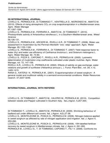 Pubblicazioni Scritto da Administrator Domenica 01 Agosto 2010 22:28 - Ultimo aggiornamento Sabato 22 Gennaio 2011 09:09 ISI INTERNATIONAL JOURNAL LOVELLI S., PERNIOLA M., Di TOMMASO T., VENTRELLA D., MORIONDO M., AMATO M. (2010). Effects of rising atmospheric CO 2 on crop evapotranspiration in a Mediterranean area. Agric. Water Manage 97,1287-1292. LOVELLI S., PERNIOLA M., FERRARA A., AMATO M., DI TOMMASO T. (2010). Photosynthetic activity of Amaranthus retroflexus L. in a Southern-Mediterranean area. Weed Science 58,126-131. LOVELLI S., PERNIOLA M., ARCIERI M., RIVELLI A.R., DI TOMMASO T. (2008). Water use assessment in muskmelon by the Penman-Monteith “one –step” approach. Agric. Water Manage. 95,1153-1160. LOVELLI S., PERNIOLA M., FERRARA A., DI TOMMASO T. (2007) Yield response factor to water (Ky) and water use efficiency of Carthamus tinctorius L. and Solanum melongena L. Agric. Water Manage. 92, 73-80. LOVELLI S., PIZZA S., CAPONIO T., RIVELLI A.R., PERNIOLA M. (2005). Lysimetric determination of muskmelon crop coefficients cultivated under plastic mulches. Agric. Water Manage, vol. 72, 147-159. RIVELLI A.R., LOVELLI S., PERNIOLA M. (2002). Effects of salinity on gas exchange, water relations and growth of sunflower (Helianthus annuus L. ). Funct. Plant Biol., vol. 29, n.12, 1405-1415. RANA G., KATERJI N., PERNIOLA M., (2001). Evapotranspiration of sweet sorghum : A general model and multilocal validity in a semiarid environmental conditions. Water Resources reserch. 37,3237-3246. INTERNATIONAL JOURNAL WITH REFEREE LOVELLI S., DI TOMMASO T., AMATO M., VALERIO M., PERNIOLA M. (2010). Competition between weeds and Pepper cultivated in Southern Italy. Ital.J.Agron. 5,257-264; DI TOMMASO T., LOVELLI S., AMATO M., PERNIOLA M. (2009). Shrinking behaviour of badland soil under different soil covers. Ital. J.Agron. 4(2),27-38; LOVELLI S., MONTELEONE M., POSCA G., PERNIOLA M. (2008). Nitrogen balance applied to sweet sorghum as affected by rate of nitrogen application and irrigation. Ital. J. Agron 4, 253-260. LOVELLI S., MONTELEONE M., POSCA G., PERNIOLA M. (2008). 15N-labelled fertilizer recovery by sweet sorghum in Mediterranean climate. Ital. J .Agron 4, 261-265. PERNIOLA M., LOVELLI S., T. DI TOMMASO, CAPONIO T., FILI’ V. (2008). Confronto tra 1/4 Pubblicazioni Scritto da Administrator Domenica 01 Agosto 2010 22:28 - Ultimo aggiornamento Sabato 22 Gennaio 2011 09:09 miscele di erbicidi per il controllo della flora infestante del frumento duro. Ital. J. Agron. Vol 3, No.2 Suppl., 255-263. PERNIOLA M., NARDIELLO, I., LOVELLI S. (2006). Effect of sowing dates on water use efficiency of sunflower (Helianthus annuus L.) crop. Ital. J. Agron. 3, 387-392. NATIONAL JOURNAL WITH REFEREE RIVELLI A.R., LOVELLI S., PIZZA S., PERNIOLA M., (2003). Irrigazione e pacciamatura in coltura di melone: I analisi ecofisiologica. Italus Hortus, Vol.10, n.6, 60-67. RIVELLI A.R., LOVELLI S., PIZZA S., PERNIOLA M. (2003). Irrigazione e pacciamatura in coltura di melone: II Consumi idrici e risposta produttiva. Italus Hortus Vol.10, n.6, 68-73. RIVELLI A.R., LOVELLI S., NARDIELLO I., PERNIOLA M., E GHERBIN, P. (2002). Effetto della salinità sull’accrescimento e sulla risposta produttiva del sorgo da carta. Rivista di Agronomia, 36, 333-338. . INTERNATIONAL CONGRESS PERNIOLA M., DI TOMMASO, LOVELLI S., CAPONIO T. (2008). Agronomic response and energy balance of Canola (Brassica napus L.) cropped in southern Italy at different energy input . Proceedings 16th European Biomass Conference Valencia, Spain, 2-6 June, pp.374-376. LOVELLI S., PERNIOLA M., FERRARA, A., VENTRELLA D., BINDI M., (2008). Effect of Climate Change on Water Use and Irrigation Requirements of Muskmelon and Broccoli in Southern Europe. Proceedings X ESA Congress, Bologna 15-19 September, pp. 789-790. LOVELLI S., PIZZA S., MASCI S., PERNIOLA M. (2006). Nitrogen fertilization effect on quantitive-qualitative parameters of durum wheat different genotypes. Bibliotheca Fragmenta Agronomica, IX European Society of Agronomy Congress, Warsawa Poland 4-7 Spetember, Book of proceedings, Vol. 11 Part II, 463-464. ARCIERI M., ALEXANDRIS S., LOVELLI S., PERNIOLA M. (2006) Hourly reference evapotranspiration evaluation in southern Italy using estimated values of solar and net radiation from photosynthetic active radiation (PAR) measurements. 8th Conference on Meteorology – Climatology and Atmospheric Physics (COMECAP), Athens , Greece May 24 – 26, 2006, Volume C, 1-10. RIVELLI A.R., LOVELLI S., PERNIOLA M. (2004). Leaves salt accumulation and CO2 assimilation of durum wheat in salinity condition. VIII European Society of Agronomy Congress, Book of proceedings pp. 439-440. RIVELLI A.R., ALBRIZIO R., LOVELLI S., PERNIOLA M. (2004). Water use effieciency response of field-grown muskmelon and pepper to environmental water status. Proceedings of 4th International Crop Science Congress. 26-1 october (CD), on-line www.cropscience.org.au/icsc2004. NATIONAL CONGRESS LOVELLI S., DI TOMMASO T., AMATO M., VALERIO M., PERNIOLA M 2009. Studio dei 2/4 Pubblicazioni Scritto da Administrator Domenica 01 Agosto 2010 22:28 - Ultimo aggiornamento Sabato 22 Gennaio 2011 09:09 rapporti di competizione infestante-coltura in relazione al mutato regime termico in un agroecosistema erbaceo nell’area del Mediterraneo. Atti XXXVIII Convegno SIA, Firenze (Italia) 21-23 settembre, pag 35-36. DI TOMMASO T., LOVELLI S., PERNIOLA M. (2007). Influenza delle radici sulla crepacciabilità dei suoli argillosi. Atti del XXXVII Convegno nazionale della SIA, Catania 13-14 settembre, pp.335-336. LOVELLI S., PERNIOLA M., CAPONIO T., DI TOMMASO T. (2007). Effetto dei cambiamenti climatici sui consumi idrici di frumento e pomodoro. V Convegno AISSA Foggia 10-12 Dicembre 2007, pp.120-121. DI TOMMASO T., LOVELLI S., PERNIOLA M., AMATO M. (2007). Influenza della resistenza a trazione delle radici sulla crepacciabilità dei suoli argillosi. V Convegno AISSA Foggia 10-12 Dicembre 2007, pp.82