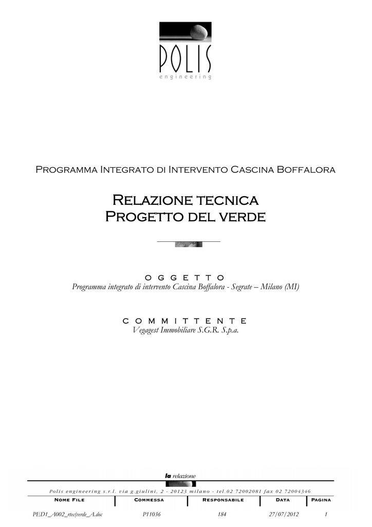 Programma Integrato di Intervento Cascina Boffalora Relazione tecnica Progetto del verde O G G E T T O Programma integrato di intervento Cascina Boffalora - Segrate – Milano (MI) C O M M I T T E N T E Vegagest Immobiliare S.G.R. S.p.a. PED1_A002_rtec(verde_A.doc P11036 184 27/07/2012 1 PED1_A002_rtec(verde_A.doc P11036 184 27/07/2012 2 INDICE 1. 2. 3. 4. 5. 6. 7. PREMESSE ................................................................................................ 4 OPERE PREVISTE .................................................................................... 5 LA STANZA DELL’ACQUA ...................................................................... 6 TEATRO DI VERZURA .............................................................................. 8 PIAZZA LOTTO 1 ...................................................................................... 8 LE AREE GIOCO ....................................................................................... 9 IL SISTEMA DEI PERCORSI ................................................................. 10 7.1. CARATTERISTICHE TECNICHE E PLANO-ALTIMETRICHE.................................................................. 11 7.2. SEGNALETICA STRADALE .............................................................................................................. 11 7.3. PISTE CICLABILI .............................................................................................................................12 7.4. PERCORSI PEDONALI ..................................................................................................................... 12 7.5. PASSEGGIATE SULLO SPECCHIO D’ACQUA, PIAZZALI .................................................................... 12 1. 2. 3. SISTEMAZIONE A VERDE ..................................................................... 14 ELEMENTI DI ARREDO ......................................................................... 16 STRUTTURE ACCESSORIE ................................................................. 17 3.1. TERRE RINFORZATE ....................................................................................................................... 17 4. ILLUMINAZIONE ..................................................................................... 18 4.1. IMPIANTO DI ILLUMINAZIONE PUBBLICA, OPERE CIVILI ................................................................... 18 4.1.1. Canalizzazioni ................................................................................. 18 4.1.2. Plinti di fondazione ......................................................................... 19 4.1.3. Pali ................................................................................................ 19 4.2. IMPIANTO ILLUMINAZIONE PUBBLICA, OPERE ELETTRICHE ............................................................ 20 4.2.1. 4.2.2. 4.2.3. 4.2.4. Apparecchi illuminanti ..................................................................... 20 Quadri elettrici ............................................................................... 20 Cavi elettrici ................................................................................... 20 Impianto di terra ............................................................................. 20 PED1_A002_rtec(verde_A.doc P11036 184 27/07/2012 3 1. Premesse L'area interessata dal progetto è localizzata a Nord Est del territorio di Segrate, e delimitata a Nord dal territorio del Comune di Pioltello, a Ovest dalla Via Di Vittorio, ad est dal territorio del Comune di Pioltello e a sud dalla strada Cassanese. L'intervento in esame interessa una superficie di circa mq. 290.000,00 e prevede l’esecuzione delle seguenti opere: - sistemazione verde degli spazi esterni, - piste ciclabili e percorsi pedonali, - aree gioco. Il progetto di sistemazione del verde nasce con l’obiettivo di realizzare un parco costituito da aree connesse tra di loro, a formare un “sistema” dal carattere unitario nel quale convivono in maniera sinergica le varie “stanze” tematiche: la stanza dell’acqua, gli spazi del gioco, la fascia perimetrale di cerniera con l’area agricola adiacente. PED1_A002_rtec(verde_A.doc P11036 184 27/07/2012 4 2. Opere previste Le opere previste sono le seguenti: - Realizzazione del nuovo parco urbano, comprensivo delle varie aree tematiche; - Realizzazione di un’area gradonata utilizzabile come teatro all’aperto (denominato “teatro di verzura”), area in asservimento; - Realizzazione della piazza in asservimento in prossimità del lotto 1 di edilizia convenzionata (rif. Richiesta di PdC prot. n. 45467 del 09/11/2009); - Realizzazione di aree gioco all’aperto per i bambini; - Realizzazione di strutture accessorie quali terre armate in corrispondenza di forti pendenze nella modellazione del terreno; - Realizzazione percorsi pedonali e ciclabili; - Realizzazione illuminazione pubblica. PED1_A002_rtec(verde_A.doc P11036 184 27/07/2012 5 3. La stanza dell’acqua La stanza dell’acqua è il baricentro dell’intera composizione; è caratterizzata da un disegno architettonico più intenso e da geometrie più esplicite. E’ il luogo del passeggio, dove l’acqua è protagonista grazie alla presenza di due canali pressoché paralleli, dai bordi esterni curvilinei che costeggiano i percorsi pedonali. La stanza dell’acqua è stata pensata come una riserva d’acqua alimentata dagli scarichi delle acque bianche provenienti dalle pavimentazioni presenti all’interno della stanza e da un pozzo freatico che verrà scavato in prossimità del bacino; da tale riserva verrà prelevata l’acqua per l’impianto di irrigazione il cui consumo nei mesi estivi, per il parco in oggetto, è stimato tra i 200 e i 300 mc. giornalieri (circa 5 litri/mq ogni due giorni). A)L’impianto d’irrigazione L’impianto d’irrigazione è costituito da un anello in pressione costituito da una tubazione in polietilene ad alta densità, disposta affinché possa raggiung