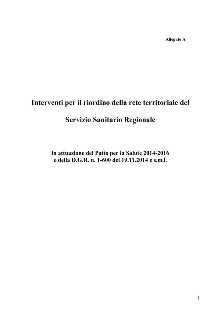 Allegato A Interventi per il riordino della rete territoriale del Servizio Sanitario Regionale in attuazione del Patto per la Salute 2014-2016 e della D.G.R. n. 1-600 del 19.11.2014 e s.m.i. 1 Sommario Pag. Introduzione La spesa per l’assistenza sanitaria territoriale Principi generali del riordino organizzativo 3 4 5 La riorganizzazione della rete dei servizi territoriali 7 1. Il modello organizzativo per il governo del territorio: il ruolo del Distretto 1.1.Situazione attuale, criticità e prospettive 1.2. Linee d’indirizzo per la riorganizzazione delle funzioni del Distretto 1.3 Dimensioni del Distretto 1.4 Collocazione organizzativa del distretto nell’organigramma ASL 1.5 Il Direttore del Distretto 1.6 Il Coordinamento dei Distretti 1.7 Il sistema informativo aziendale a supporto delle funzioni distrettuali 1.8 Il ruolo dei Sindaci nella programmazione territoriale-distrettuale 1.9 Il Programma delle attività territoriali-distrettuali (PAT) 7 8 8 10 10 11 11 12 13 14 2. Il riordino delle forme organizzative dell’Assistenza primaria sul territorio regionale 2.1 Quadro normativo nazionale e regionale 2.2 Le attuali forme associative dell’Assistenza primaria 2.3.Linee d’indirizzo per l’evoluzione verso le nuove forme organizzative delle cure primarie: UCCP-AFT 2.3.1 Aggregazioni funzionali territoriali MMG/PDLS (AFT) 2.3.2 Unità Complesse di Cure primarie (UCCP) 2.3.3 Collegamenti operativi fra le cure primarie e le altre reti aziendali 16 16 17 18 19 20 22 3. I servizi territoriali dell’ASL 3.1 I dipartimenti territoriali 3.2 I servizi territoriali aziendali 3.2.1. Area della continuità tra ospedale e territorio 24 24 29 30 4. Le competenze della rete territoriale rispetto ai Livelli di assistenza da garantire al cittadino 32 5. Il raccordo con la rete dei servizi dell’area dell’integrazione socio-sanitaria e socio-assistenziale 33 6. L’interazione tra il Servizio di Continuità Assistenziale e il sistema di Emergenza e Urgenza 6.1 Il modello regionale a cui tendere: la centralizzazione delle chiamate di C.A. 6.2 Fasi del percorso per la realizzazione del progetto “116117” 6.2.1 Modalità operative 6.2.2 Sala operativa “116117” 6.3 Sperimentazione regionale sul territorio torinese (AA.SS.LL. To 1 e To2) 6.4 Indirizzi per la riorganizzazione del Servizio di C.A. 35 36 37 37 38 38 39 2 Introduzione Il Piemonte, dove risiede poco più del 7 % degli italiani, si evidenzia come una delle regioni più vecchie e dipendenti della media delle regioni italiane: nel 2011 gli anziani (> 65 anni) residenti erano 1.023.195; l’indice di invecchiamento, che rapporta gli ultrasessantacinquenni al totale della popolazione, faceva registrare, nel 2011, valori del 23,4 % (alla stessa data, in Italia, erano 12.301.537 i soggetti di età uguale o superiore a 65 anni, pari al 20,3 % del totale della popolazione). Gli ultraottantenni, verso i quali si rivolgono prevalentemente le cure destinate alla fetta di popolazione non autosufficiente, rappresentavano invece, alla stessa data, il 7 % del totale della popolazione. Nel 2001 i residenti in Piemonte con più di 65 anni erano 897.432. In Piemonte, nel 2011, risiedevano 181 anziani ogni 100 bambini di 0-14 anni, con un tasso di ricambio, quindi, ben più basso del “valore di equilibrio” di 100. In prospettiva, se non si registrerà un incremento di fecondità o un flusso migratorio consistente, la popolazione tenderà a invecchiare (gli anziani diventeranno grandi anziani e gli adulti entreranno nella fascia anziana), con un ricambio insufficiente a compensare tale tendenza: la carenza di giovani, che rappresentano le forze di lavoro in grado di pagare i servizi socio sanitari di cui necessita la popolazione anziana, rappresenta uno dei problemi principali evidenziati dagli indicatori demografici illustrati. Se il fattore invecchiamento riveste un ruolo centrale nella crescita delle risorse impiegate dal settore socio sanitario, il bisogno non cresce proporzionalmente all’invecchiamento, dal momento che si invecchia in condizioni di salute che tendono a diventare via via migliori. I dati delle Indagini Multiscopo Istat indicano come negli ultimi 10 anni la cronicità sia insorta, tra gli anziani, a un’età di 5 anni maggiore che in passato. Se la popolazione invecchia in condizioni di salute migliori, è perché è cambiato, negli ultimi decenni, lo scenario epidemiologico caratterizzato da un aumento della prevalenza delle patologie croniche. Secondo le rilevazioni Istat (Istat, 2011) il 38,6 % dei residenti, in Italia, soffre di almeno una patologia cronica; di questi, il 20,1 % della popolazione dichiara di avere almeno due patologie croniche. Le modifiche demografiche ed epidemiologiche illustrate richiedono un adeguamento delle risposte assistenziali: attualmente l’ospedale si fa carico di circa il 30 % della cronicità in regime di ricovero e cura, con un forte spreco di risorse economiche e umane. 3 La cura dei pazienti cronici richiede non tanto un aumento di risorse, quanto piuttosto un’inversione di tendenza culturale. A fronte di una medicina oggi sempre più specializzata, i pazienti cronici necessitano di risposte integrate e multidisciplinari, trasversali ai diversi ambiti di assistenza. E se le strutture ospedaliere restano la sede più adatta per la diagnosi e la cura degli episodi acuti della malattia, le altre prestazioni sanitarie, quali visite mediche, visite ed esami specialistici, consumo di farmaci, trovano il luogo più appropriato di erogazione sul territorio, che comprende anche il domicilio dei pazienti. L’assistenza socio sanitaria territoriale rappresenta uno dei tre macro-livelli di assistenza, o linee di attività, in cui si suddivide l’offerta di servizi del Servizio sanitario in Italia e in Piemonte, insieme alla prevenzione ed all’assistenza ospedaliera. I percorsi di cura territoriali dei residenti si snodano attraverso una rete di servizi che comprende, in un continuum, un