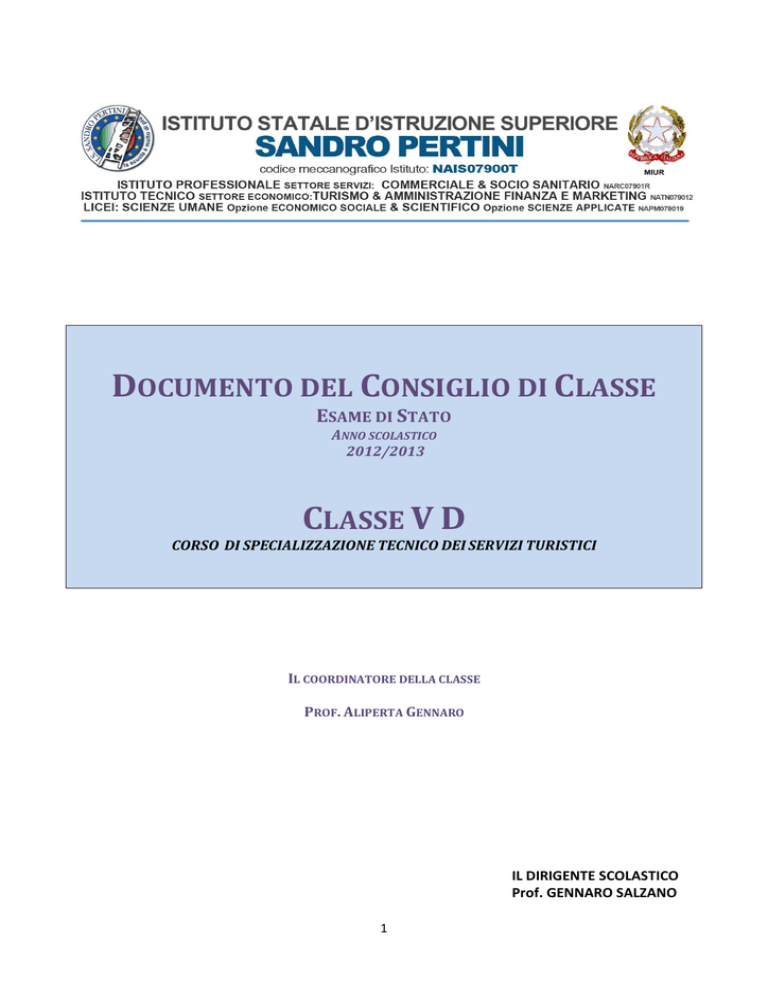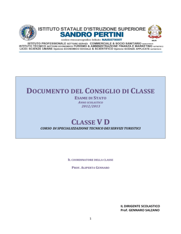 DOCUMENTO DEL CONSIGLIO DI CLASSE ESAME DI STATO ANNO SCOLASTICO 2012/2013 CLASSE V D CORSO DI SPECIALIZZAZIONE TECNICO DEI SERVIZI TURISTICI IL COORDINATORE DELLA CLASSE PROF. ALIPERTA GENNARO IL DIRIGENTE SCOLASTICO Prof. GENNARO SALZANO 1 INDICE PRESENTAZIONE DELLA SCUOLA………………………………………………………………………………….PAG. 3 PRESENTAZIONE DEL CONSIGLIO DI CLASSE………………………………………………………………… PAG. 5 INFORMAZIONI GENERALI RELATIVE ALLA CLASSE E QUADRO ORARIO…………………………PAG . 6 PROFILO PROFESSIONALE DEL TECNICO DEI SERVIZI TURISTICI …………………………………… PAG. 8 QUADRO ORARIO SETTIMANALE SERVIZI TURISTICI………………………………………………………PAG. 9 PROFILO DELLA CLASSE………………………………………………………………………………………………..PAG. 10 PROGRAMMAZIONE DEL CONSIGLIO DI CLASSE …………………………………………………………..PAG. 11 ORGANIZZAZIONE DELL’ATTIVITÀ DIDATTICA………………………………………………………………PAG. 13 GRIGLIA DI VALUTAZIONE:CONOSCENZE/ABILITÀ/COMPETENZE…………………….…………PAG. 15 CRITERI PER L’ATTRIBUZIONE DEL VOTO DI CONDOTTA……………………………………………….PAG. 16 CRITERI PER L’ATTRIBUZIONE DEL CREDITO SCOLASTICO…………………………..................PAG. 17 STRATEGIE PER IL RECUPER E ATTIVITÀ DI RIORIENTAMENTO………………………………………PAG. 18 ESAME DI STATO:SIMULAZIONE DELLE PROVE……………………………………………………………..PAG. 19 ATTIVITÀ COMPLEMENTARI ED INTEGRATIVE……………………………………………………………...PAG. 21 PERCORSO FORMATIVO PON AZIONE C1……………………………………………………………………..PAG. 23 ALTERNANZA SCUOLA LAVORO…………………………………………………………………………………..PAG. 25 PROGRAMMI SINGOLE MATERIE………………………………………………………………………………...PAG. 28 2 DESCRIZIONE DELLA SCUOLA E DEL CONTESTO SOCIOAMBIENTALE dal POF 2012-2013 DATI STORICI L'Istituto nasce come sede coordinata dell'Istituto Professionale di Stato per il Commercio "Don Minzoni" di Giugliano in Campania, per far fronte alle esigenze formative dei giovani di un ampio territorio collocato a Nord di Napoli. Dal 1 settembre 1989 esso opera come Istituto Professionale di Stato per il Commercio e il Turismo di Afragola, a seguito dell'intervenuto decreto istitutivo di autonomia da parte del Ministero della Pubblica Istruzione ‐ Direzione generale dell'Istruzione Professionale. Dal marzo 2002 l’istituto ha assunto la denominazione I.P.S.S.C.T. “Sandro Pertini”. Dall’anno scolastico 2010/2011 l’istituto si è trasformato in Istituto d’Istruzione Superiore, accogliendo accanto all’istruzione professionale quella tecnica e, dal 2011/2012 anche quella liceale.ATI ANAGRAFICI DELL’ISTITUTO: LA STRUTTURA L' I.S.I.S. “S. Pertini” di Afragola opera in una struttura moderna ed accogliente. L’edificio si disloca su tre piani: un primo e un secondo piano su quello rialzato. Conta 44 aule didattiche, 11 laboratori, un’Aula Magna, un ampio auditorium, una biblioteca e una palestra coperta. I Laboratori sono situati al secondo piano: 1 laboratorio scientifico utilizzato per l’insegnamento indirizzi di studio 2 laboratori di Informatica/Trattamento Testi dotati di postazioni PC e LIM 2 laboratori di Economia/IFS dotati di postazioni PC e LIM 2 laboratori linguistici per la didattica delle lingue straniere che permettono di attivare le abilità audio‐orali degli studenti attraverso esercizi interattivi 2 laboratori di didattica e documentazione 2 laboratori per gli alunni diversamente abili posto al piano terra, attrezzati con postazioni PC, stampante e materiale speciale per gli interventi individualizzati 3 CONTESTO SOCIO-AMBIENTALE L’istituto è ubicato in via Lombardia n° 39 nel Comune di Afragola, a Nord di Napoli, la cui realtà socioeconomica e culturale appare piuttosto eterogenea. Le radici culturali, le tradizioni e le usanze locali convivono con un presente caratterizzato da un’esplosione urbanistica caotica che, a partire dagli anni 70/80, ne ha stravolto l’originario aspetto agricolo. Un discreto sviluppo economico grazie a piccole e medie imprese di diversa tipologia, la presenza di grandi insediamenti commerciali (Ipercoop, Ikea, Leroy Merlin) e una articolata rete viaria, tuttora in opera, renderanno tale territorio, grazie alla stazione terminale dell’Alta Velocità, uno dei nodi essenziali del traffico commerciale e turistico del meridione d’Italia. Un’area, dunque, urbanizzata e in continua evoluzione a cui corrisponde un progressivo innalzamento del livello culturale del territorio. Non mancano, però, situazioni di disagio concentrate in alcune zone residenziali in cui è fortemente avvertito il fenomeno della dispersione scolastica. Pertanto, l’Istituto Pertini si dichiara pronto ad accogliere la sfida educativa proveniente da questo territorio la cui eterogeneità e vivacità culturale si riflette nei fruitori del suo servizio. I valori che sono alla base dell’attività didattico‐educativa dell’Istituto Pertini hanno come riferimento fondamentale gli articoli 3, 33 e 34 della Costituzione Italiana e si pongono come finalità la formazione dell’uomo e del cittadino. LA MISSION DELL’ISTITUTO “La scuola è molto di più. In essa risiede una funzione fondamentale quale è quella dell’educazione e della formazione umana e spirituale delle nuove generazioni.” S. Pertini (dal Messaggio per l’inizio del nuovo anno scolastico 1982) Dalle parole del Presidente della Repubblica Sandro Pertini, a cui la nostra scuola è intitolata, trae ispirazione