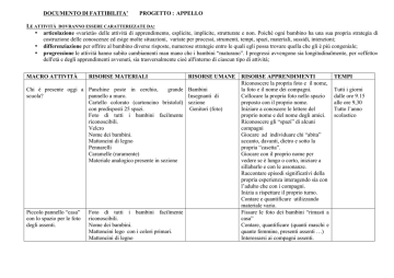 DOCUMENTO DI FATTIBILITA’ PROGETTO : APPELLO LE ATTIVITÀ DOVRANNO ESSERE CARATTERIZZATE DA: • articolazione «varietà» delle attività di apprendimento, esplicite, implicite, strutturate e non. Poiché ogni bambino ha una sua propria strategia di costruzione delle conoscenze ed esige molte situazioni, variate per processi, strumenti, tempi, spazi, materiali, sussidi, intenzioni; • differenziazione per offrire al bambino diverse risposte, numerose strategie entro le quali egli possa trovare quella che gli è più congeniale; • progressione le attività hanno subito cambiamenti man mano che i bambini “maturano”. I progressi avvengono sia longitudinalmente, per «effetto» dell'età e degli apprendimenti avvenuti, sia trasversalmente cioè all'interno di ciascun tipo di attività; MACRO ATTIVITÀ RISORSE MATERIALI RISORSE UMANE Chi è presente oggi a Panchine poste in cerchio, grande Bambini scuola? pannello a muro. Insegnanti di Cartello colorato (cartoncino bristolol) sezione con predisposti 25 spazi. Genitori (foto) Foto di tutti i bambini facilmente riconoscibili. Velcro Nome dei bambini. Mattoncini di legno Pennarelli Caramelle (raramente) Materiale analogico presente in sezione Piccolo pannello “casa” con lo spazio per le foto degli assenti. Foto di tutti i bambini facilmente riconoscibili. Nome dei bambini. Mattoncini lego con i colori primari. Mattoncini di legno RISORSE APPRENDIMENTI Riconoscere la propria foto e il nome, la foto e il nome dei compagni. Collocare la propria foto nello spazio preposto con il proprio nome. Iniziare a conoscere le lettere del proprio nome e del nome degli amici. Riconoscere gli “spazi” di alcuni compagni Giocare ad individuare chi “abita” accanto, davanti, dietro e sotto la propria “casetta”. Giocare con il proprio nome per vedere se è lungo o corto, iniziare a sillabarlo e con le assonanze. Raccontare episodi significativi della propria esperienza interagendo sia con l’adulto che con i compagni. Inizia a rispettare il proprio turno. Contare e quantificare utilizzando materiale vario. Fissare le foto dei bambini “rimasti a casa” Contare, quantificare (quanti maschi e quante femmine, presenti assenti …) Interessarsi ai compagni assenti. TEMPI Tutti i giorni dalle ore 9.15 alle ore 9,30 Tutto l’anno scolastico MACRO ATTIVITÀ RISORSE MATERIALI RISORSE UMANE RISORSE APPRENDIMENTI TEMPI Gioco della “Settimana a colori” Panchine poste in cerchio e pannello a muro. Pannello con i giorni della settimana. Schema di un grande fiore 7 petali di colori diversi Velcro per fissare i petali al fiore. Filastrocca della settimana, rime, assonanze Panchine poste in cerchio e pannello a muro. Cartoncino bristol colorato Scritta: incarichi giornalieri. Immagini degli angoli da riordinare: angolo della casa”, “angolo dei travestimenti”, “angolo biblioteca”, “angolo delle costruzioni” e dei giochi da tavolo. Foto con nome dei bambini. Bambini Insegnanti di sezione Individuazione dei giorni della settimana con il gioco la “settimana a colori”. Imparare la filastrocca o la canzone della settimana. Giocare con le parole, le rime e le assonanze. Raccordare/ricordare episodi personali. Dalle ore 9.30 alle ore 10.00 Da ottobre a giugno Bambini Insegnanti di sezione Avere cura dei giochi. Rispettare le consegne Dalle ore 9.30 alle ore 10.00 Da ottobre a giugno Incarichi giornalieri: Chi riordina? Prima di andare a pranzo Gioco del cameriere (Incarico di sparecchiare la tavola) Spazio per fissare foto/nome del “cameriere” Scritta “cameriere”, velcro Immagine del “cameriere”. Foto con nome e nome del bambino. Assumere un compito e portarlo a termine. Affrontare piccoli problemi. Essere collaborativo Durante il pranzo Oggi fa “maestro”… I mesi Spazio per fissare foto/nome del “maestro” il Scritta “maestro”, velcro Foto con nome e nome del bambino. Grandi disegni con rappresentati i 12 mesi dell’anno. Una fiaba per ogni mese dell’anno Distribuire le foto ai compagni. Aiutare eventualmente chi è in difficoltà. Nominare i nomi dei bambini che hanno un incarico. Verificare il tempo atmosferico. Appendere il simbolo corrispondente nell’apposito spazio. Riconoscere con l’aiuto dell’adulto in che mese siamo. Riconoscere la fiaba che lo contraddistingue. Verificare se la freccia corrisponde alla stagione in essere. Iniziare a capire in che mese siamo. Abbinare a un mese una fiaba. Provare a drammatizzare la fiaba. Durante l’attività dell’appello MACRO ATTIVITÀ Che tempo fa? Le stagioni I compleanni RISORSE MATERIALI Panchine poste in cerchio e pannello a muro. Cartoncino bristol colorato Simboli del tempo atmosferico in formato grande Simboli del tempo atmosferico in formato piccolo Velcro Panchine poste in cerchio e pannello a muro. Cartoncino bristol colorato Simboli delle 4 stagioni Freccia per indicare la stagione Nomi a caratteri grandi con la data di nascita dei bambini. Colla per incollarli al mese *Ultimo venerdì del mese quando si festeggia il compleanno: Frutta per la torta di compleanno; candeline; macchina fotografica; caramelle. RISORSE UMANE RISORSE APPRENDIMENTI TEMPI Bambini Insegnanti di sezione Utilizzare qualche simbolo. Conoscere una breve sequenza numerica verbale. Conoscere i cambiamenti climatici. Dalle ore 9.30 alle ore 10.00 Da ottobre a giugno Bambini Insegnanti di sezione Collaboratrice scolastica (ultimo venerdì del mese quando si festeggia il compleanno) Abbinare oggetti e immagini uguali. Iniziare a capire in che stagione siamo. Imparare brevi filastrocche o canzoni. Provare ad abbinare il mese rappresentato con il proprio compleanno. Scoprire che ci sono altri bambini nati nello stesso mese. Festeggiare il compleanno con i compagni di scuola. Divertirsi a realizzare la torta. Dalle ore 9.00 alle ore 9,45 Ultimo venerdì del mese MACRO ATTIVITÀ RISORSE MATERIALI RISORSE UMANE Con “le mani per contare” Panchine poste in cerchio e pannello a muro. I