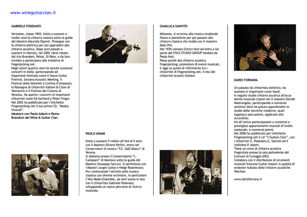www.wineguitarclan.it GABRIELE POSENATO GIANLUCA SANVITO Veronese, classe 1965. Inizia a suonare a tredici anni la chitarra classica sotto la guida del Maestro Maurizio Elponti. Prosegue con la chitarra elettrica per poi approdare alla chitarra acustica. Dopo anni passati a suonare in silenzio, nel 2002 viene notato dal trio Brandoni, Pelosi, Di Reto, e da loro invitato a partecipare alle iniziative di fingerpicking.net. Negli ultimi quattro anni ha tenuto numerosi concerti in Italia partecipando ad importanti festivals come il Soave Guitar Festival, Sarzana Acoustic Meeting, il Festival delle Dolomiti a Cortina d’Ampezzo, la Rassegna di chitarristi italiani di Cison di Valmarino e il Festival del Cinema di Venezia. Ha aperto i concerti di importanti chitarristi come Ed Gerhard e Peter Finger. Nel 2003 ha pubblicato per l’etichetta Fingerpicking.net il suo primo CD, “Modus Vivendi”. Ideatore con Paolo Adami e Remo Brandoni del Wine & Guitar Clan. Milanese, si avvicina alla musica studiando flauto e pianoforte per poi passare alla chitarra classica che studia con il maestro Malù Pini. Nel 1976 conosce Enrico Nuti ed entra a far parte del FOLK STUDIO GROUP fondato da Paolo Nuti. Passa quindi alla chitarra acustica fingerpicking; promotore di eventi musicali, è oggi un punto di riferimento tra i chitarristi di fingerpicking.net, il sito dei chitarristi acustici italiani. DARIO FORNARA PAOLO ADAMI Inizia a suonare il violino all’età di 5 anni, con il Maestro Silvano Perlini, entra nel Conservatori di musica “F.E. Dall’Abaco” di Verona. Si diploma presso il Conservatorio “L. Campiani” di Mantova sotto la guida del Maestro Giuseppe Sarcuni. Si perfeziona con i Maestri Jurgen Geise e Helge Rosenkranz. Pur continuando l’attività nella musica classica con diverse orchestre, in particolare l’Alio Modo Ensemble, da anni suona in duo con il chitarrista Gabriele Posenato, sviluppando un nuovo percorso di ricerca musicale. Un passato da chitarrista elettrico, ha suonato in importanti cover band. In seguito studia chitarra acustica all'accademia musicale Lizard con il maestro Davide Mastrangelo, partecipando a numerosi seminari dove ha potuto approfondire lo studio delle tecniche moderne, quali tapping e percussioni, applicate allo strumento. Ha all’attivo partecipazioni a numerosi e prestigiosi appuntamenti musicali di livello nazionale, e numerosi premi. Nel 2006 ha pubblicato per l'etichetta Fingerpicking.net il cd “3 Guitars Clan”, con i chitarristi G. Posenato,G. Sanvito ed il violinista P. Adami. Tiene un corso di chitarra acustica fingerstyle presso la sala polivalente del Comune di Cureggio (NO). Collabora con il distributore di strumenti musicali francese Guitar-Import in qualità di endorser italiano delle chitarre acustiche Wechter. www.dariofornara.it