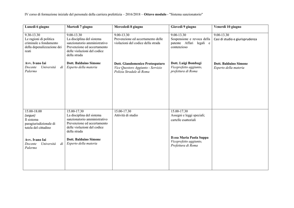 IV corso di formazione iniziale del personale della carriera prefettizia – 2016/2018 – Ottavo modulo - "Sistema sanzionatorio" Lunedì 6 giugno Martedì 7 giugno Mercoledì 8 giugno Giovedì 9 giugno Venerdì 10 giugno 9.30-13.30 Le ragioni di politica criminale a fondamento della depenalizzazione dei reati 9.00-13.30 La disciplina del sistema sanzionatorio amministrativo Prevenzione ed accertamento delle violazioni del codice della strada 9.00-13.30 Prevenzione ed accertamento delle violazioni del codice della strada 9.00-13.30 Sospensione e revoca della patente Affari legali e contenzioso 9.00-13.30 Casi di studio e giurisprudenza Avv. Ivano Iai Docente Università Palermo Dott. Balduino Simone Esperto della materia Dott. Giandomenico Protospataro Vice Questore Aggiunto - Servizio Polizia Stradale di Roma Dott. Luigi Bombagi Viceprefetto aggiunto, prefettura di Roma Dott. Balduino Simone Esperto della materia 15.00-18.00 (segue) Il sistema paragiurisdizionale di tutela del cittadino 15.00-17.30 La disciplina del sistema sanzionatorio amministrativo Prevenzione ed accertamento delle violazioni del codice della strada 15.00-17.30 Attività di studio 15.00-17.30 Assegni e leggi speciali; cartelle esattoriali Avv. Ivano Iai Docente Università Palermo Dott. Balduino Simone Esperto della materia di di D.ssa Maria Paola Suppa Viceprefetto aggiunto, Prefettura di Roma
