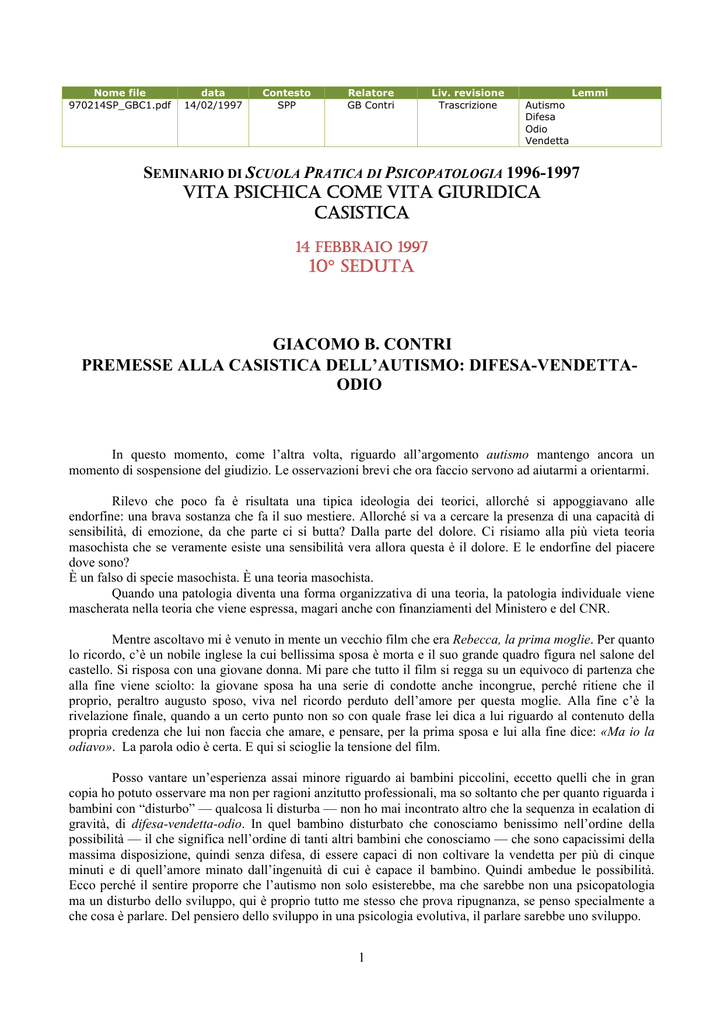 Nome file 970214SP_GBC1.pdf data 14/02/1997 Contesto SPP Relatore GB Contri Liv. revisione Trascrizione Lemmi Autismo Difesa Odio Vendetta SEMINARIO DI SCUOLA PRATICA DI PSICOPATOLOGIA 1996-1997 VITA PSICHICA COME VITA GIURIDICA CASISTICA 14 FEBBRAIO 1997 10° SEDUTA GIACOMO B. CONTRI PREMESSE ALLA CASISTICA DELL’AUTISMO: DIFESA-VENDETTAODIO In questo momento, come l’altra volta, riguardo all’argomento autismo mantengo ancora un momento di sospensione del giudizio. Le osservazioni brevi che ora faccio servono ad aiutarmi a orientarmi. Rilevo che poco fa è risultata una tipica ideologia dei teorici, allorché si appoggiavano alle endorfine: una brava sostanza che fa il suo mestiere. Allorché si va a cercare la presenza di una capacità di sensibilità, di emozione, da che parte ci si butta? Dalla parte del dolore. Ci risiamo alla più vieta teoria masochista che se veramente esiste una sensibilità vera allora questa è il dolore. E le endorfine del piacere dove sono? È un falso di specie masochista. È una teoria masochista. Quando una patologia diventa una forma organizzativa di una teoria, la patologia individuale viene mascherata nella teoria che viene espressa, magari anche con finanziamenti del Ministero e del CNR. Mentre ascoltavo mi è venuto in mente un vecchio film che era Rebecca, la prima moglie. Per quanto lo ricordo, c’è un nobile inglese la cui bellissima sposa è morta e il suo grande quadro figura nel salone del castello. Si risposa con una giovane donna. Mi pare che tutto il film si regga su un equivoco di partenza che alla fine viene sciolto: la giovane sposa ha una serie di condotte anche incongrue, perché ritiene che il proprio, peraltro augusto sposo, viva nel ricordo perduto dell’amore per questa moglie. Alla fine c’è la rivelazione finale, quando a un certo punto non so con quale frase lei dica a lui riguardo al contenuto della propria credenza che lui non faccia che amare, e pensare, per la prima sposa e lui alla fine dice: «Ma io la odiavo». La parola odio è certa. E qui si scioglie la tensione del film. Posso vantare un’esperienza assai minore riguardo ai bambini piccolini, eccetto quelli che in gran copia ho potuto osservare ma non per ragioni anzitutto professionali, ma so soltanto che per quanto riguarda i bambini con “disturbo” — qualcosa li disturba — non ho mai incontrato altro che la sequenza in ecalation di gravità, di difesa-vendetta-odio. In quel bambino disturbato che conosciamo benissimo nell’ordine della possibilità — il che significa nell’ordine di tanti altri bambini che conosciamo — che sono capacissimi della massima disposizione, quindi senza difesa, di essere capaci di non coltivare la vendetta per più di cinque minuti e di quell’amore minato dall’ingenuità di cui è capace il bambino. Quindi ambedue le possibilità. Ecco perché il sentire proporre che l’autismo non solo esisterebbe, ma che sarebbe non una psicopatologia ma un disturbo dello sviluppo, qui è proprio tutto me stesso che prova ripugnanza, se penso specialmente a che cosa è parlare. Del pensiero dello sviluppo in una psicologia evolutiva, il parlare sarebbe uno sviluppo. 1 Attribuiamoci il più possibile se non proprio di innocenza, almeno di ingenuità, nel migliore dei casi: il parlare da parte di un bambino il giorno che lo fa è una iniziativa. È il bambino che viene, riguardo al parlare piuttosto che altro. E il bambino viene ed è l’osservazione a dirci che quando il bambino viene, per quanto precocemente venga, abbiamo tutti i segni che se l’è presa comoda prima di venire, come dire che ci ha pensato su. È così complesso il primo elementare atto linguistico che assomiglia al fatto di una casa in costruzione che abbiamo visto in piazza per mesi e per anni ed era sempre lì con i suoi teloni davanti e poi un bel giorno si calano i teloni e la casa compare di botto. La prima frase del bambino è il comparire di botto di una casa che ha avuto un tempo di costruzione lungo. Dire che il parlare appartiene allo sviluppo è proprio una iniquità intellettuale sul piano osservativo. Anche l’afasia non è un disturbo dello sviluppo. Non lo si dica osservativamente: non implica una dottrina questo. Per questo dico difesa-vendetta-odio. Non sono i visceri in movimento che si rivoltano: sono forme del pensiero. Dato che nella precocità — e stiamo parlando di questo — direi che ancora nella nostra epoca ci troviamo di fronte alla difficoltà del nostro pensiero, un po’ come la moglia del film di cui sopra, è il nostro intelletto che trovo non ben preparato a riconoscere ciò che può già accadere nella precocità. Al nostro intelletto ripugna anche solo la possibilità di riconoscere l’odio nel bambino di due anni. Il nostro intelletto fa una specie di vade retro rispetto a questo pensiero. Penso che l’innocenza sia quella che si può raggiungere allorché si è saputo riconoscere la difesa, la vendetta e l’odio e il proprio pensiero non prova più ripugnanza rispetto a questo riconoscimento. L’innocenza allora incomincia ad avere un construtto. E per innocenza intendo anche la condizione per la conoscenza teorica dei fenomeni, per il sapere. In un caso di cui parlerà Raffaella Colombo la prossima volta, mi fa piacere per pure ragioni autobiografiche dire che è al bambino piccolo in tanti casi gli piacerebbe potersi pensare un bastardo: quando non può pensarsi un bastardo, fa il bastardo, nel senso comune con cui si dice “quello lì è proprio un bastardo”. Fino al Seicento la parola “bastardo” non era per nulla un insulto. Shakespeare usa “il bastardo del Re” e viene chiamato così. Quindi è abbastanza recente la mala storia, la mala fama di questa parola. Potersi pensare bastardo è potersi pensare in quello che è stato chiamato “il romanzo familiare”: essere figli di re e di regina. In questo caso siamo nella rêverie del bambino, ma è un po’ troppo riduttiva la parola rêverie; è un
