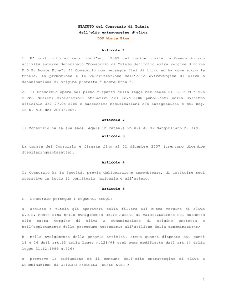 STATUTO del Consorzio di Tutela dell’olio extravergine d’oliva DOP Monte Etna Articolo 1 1. E' costituito ai sensi dell’art. 2602 del codice civile un Consorzio con attività esterna denominato “Consorzio di Tutela dell’olio extra vergine d’oliva D.O.P. Monte Etna”. Il Consorzio non persegue fini di lucro ed ha come scopo la tutela, la promozione e la valorizzazione dell’olio extravergine di oliva a denominazione di origine protetta " Monte Etna ”. 2. Il Consorzio opera nel pieno rispetto della legge nazionale 21.12.1999 n.526 e dei decreti ministeriali attuativi del 12.4.2000 pubblicati nella Gazzetta Ufficiale del 27.04.2000 e successive modificazioni e/o integrazioni e del Reg. CE n. 510 del 20/3/2006. Articolo 2 Il Consorzio ha la sua sede legale in Catania in via A. di Sangiuliano n. 349. Articolo 3 La durata del Consorzio è fissata fino al 31 dicembre 2057 (trentuno dicembre duemilacinquantasette). Articolo 4 Il Consorzio ha la facoltà, previa deliberazione assembleare, di istituire sedi operative in tutto il territorio nazionale e all’estero. Articolo 5 1. Consorzio persegue i seguenti scopi: a) assiste e tutela gli operatori della filiera oli extra vergine di oliva D.O.P. Monte Etna nello svolgimento delle azioni di valorizzazione del suddetto olio extra vergine di oliva a denominazione di origine protetta e nell’espletamento delle procedure necessarie all’utilizzo della denominazione; b) nello svolgimento della propria attività, attua quanto disposto dai punti 15 e 16 dell'art.53 della Legge n.128/98 così come modificato dall'art.14 della legge 21.12.1999 n.526; c) promuove la diffusione ed il Denominazione di Origine Protetta consumo dell'olio extravergine di oliva a Monte Etna ; 1 d) controlla e tutela, in Italia e all'estero, l'uso della denominazione, e del marchio consortile da utilizzare in abbinamento con le suddetta denominazione; e) vigila affinché il titolo di consorziato e il marchio adottato dal Consorzio (allegato allo Statuto) siano usati esclusivamente dagli aventi diritto, verifica e controlla ché non venga posto in vendita con denominazione di origine protetta Monte Etna o simile, o con il marchio distintivo del Consorzio, olio ottenuto con olive non prodotte e trasformate nel territorio delimitato o che, pure essendo prodotto/trasformato con olive provenienti da detto territorio, non sia in possesso della dichiarazione di conformità, rilasciata dall’Organismo di controllo, in merito alle caratteristiche chimico-fisiche e organolettiche definite dal disciplinare di produzione dell’olio extra vergine di oliva DOP Monte Etna; f) svolge una attiva sorveglianza, in collaborazione con il Ministero delle politiche agricole alimentari e forestali, in particolare con l’Ispettorato centrale per il controllo della qualità dei prodotti agroalimentari (ICQ) contro le infrazioni e le frodi possibili nella produzione e nel commercio delle olive e dell'olio; g) svolge tutti i compiti previsti dalla vigente normativa per i Consorzi di tutela e stipula pervenire ad una apposite convenzioni proficua e con migliore gli enti tutela pubblici della e privati produzione, per della valorizzazione dell'olio extravergine di oliva Monte Etna. 2. Per il raggiungimento degli scopi sociali il Consorzio: a) effettua accertare la controlli a campione corrispondenza alle sul prodotto caratteristiche imbottigliato, della partita al fine di esaminata ed ammessa all'uso della denominazione di origine; b) compie, anche in collaborazione con le associazioni dei Produttori olivicoli riconosciute, attività di assistenza tecnica, di divulgazione e di informazione agli operatori della filiera olearia D.O.P. Monte Etna, al fine di migliorare la qualità chimico-fisica e organolettica dell’olio extra vergine d’oliva, le tecniche colturali, le tecniche di trasformazione, stoccaggio, confezionamento, promozione; c) definisce, d'intesa con i soci del Consorzio, iscritti al Sistema dei controlli relativi alla DOP Monte Etna, che certificano lotti di confezionamento di olio extra vergine di oliva con marchio “DOP Monte Etna”, le linee guida in merito alla commercializzazione del prodotto ammesso all'uso della denominazione di origine; 2 d) svolge in Italia ed all'estero, anche attraverso la partecipazione a mostre e manifestazioni fieristiche, una adeguata azione promozionale e pubblicitaria intesa a diffondere la conoscenza ed il prestigio dell'olio extravergine d'oliva DOP Monte Etna; e)promuove ed organizza convegni, ricerche di mercato e seminari per lo studio dei problemi tecnici ed economici limitanti lo sviluppo della filiera dell’olio extra vergine d’oliva a Denominazione di Origine Protetta “Monte Etna”; f) si costituisce parte civile nei procedimenti penali promossi per reati relativi alle materie disciplinate dalla normativa vigente; g) svolge tutte le funzioni e tutte le iniziative affidate ai Consorzi di tutela dalla normativa vigente; 3. Il Consorzio potrà, al fine di rendere efficace la sua azione aderire ad organismi nazionali ed internazionali che si occupano di olivicoltura o di elaiotecnica. Articolo 6 Il consorzio può istituire, con delibera dell'assemblea dei soci e su approvazione del Ministero delle politiche agricole alimentari e forestali, il proprio marchio consortile (allegato allo statuto) che può essere concesso in uso ai consorziati. Articolo 7 I Consorziati si impegnano a segnalare al Consorzio ogni violazione dei diritti inerenti consortile, al all'uso fine di della renderne denominazione possibile di origine l'intervento con e del tutti marchio i mezzi consentiti dalle leggi vigenti. Articolo 8 1. Previa presentazione di apposita richiesta di adesione, possono fare parte, in qualità di consorziati: a) Le persone fisiche e giuridiche, nella qualità di olivicoltori, molitori e imbottigliatori, individuate all’art. 14 della Legge n. 526 del 21 dicembre 1999 e dal DM 12 aprile 2000, aderenti al Sistema dei controlli per 