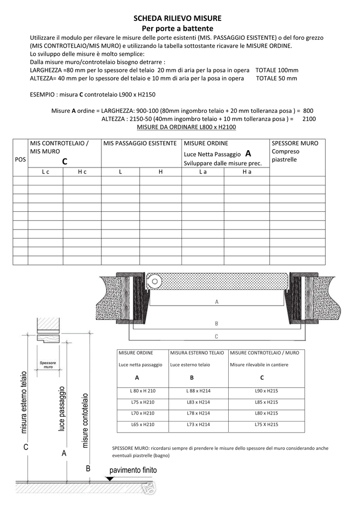 SCHEDARILIEVOMISURE Perporteabattente misure contotelaio luce passaggio misura esterno telaio Utilizzareilmoduloperrilevarelemisuredelleporteesistenti(MIS.PASSAGGIOESISTENTE)odelforogrezzo (MISCONTROTELAIO/MISMURO)eutilizzandolatabellasottostantericavareleMISUREORDINE. Losviluppodellemisureèmoltosemplice: Dallamisuremuro/controtelaiobisognodetrarre: LARGHEZZA=80mmperlospessoredeltelaio20mmdiariaperlaposainoperaTOTALE100mm ALTEZZA=40mmperlospessoredeltelaioe10mmdiariaperlaposainoperaTOTALE50mm ESEMPIO:misuraCcontrotelaioL900xH2150 MisureAordine=LARGHEZZA:900100(80mmingombrotelaio+20mmtolleranzaposa)=800 ALTEZZA:215050(40mmingombrotelaio+10mmtolleranzaposa)=2100 MISUREDAORDINAREL800xH2100 MISCONTROTELAIO/ SPESSOREMURO MISPASSAGGIOESISTENTE MISUREORDINE MISMURO Compreso LuceNettaPassaggioA piastrelle POS C Svilupparedallemisureprec. Lc Hc L H La Ha MISURAESTERNOTELAIO MISURECONTROTELAIO/MURO MISUREORDINE Lucenettapassaggio Luceesternotelaio Misurerilevabileincantiere A B C L80xH210 L88xH214 L90xH215 L75xH210 L83xH214 L85xH215 L70xH210 L78xH214 L80xH215 L65xH210 L73xH214 L75XH215 SPESSOREMURO:ricordarsisemprediprenderelemisuredellospessoredelmuroconsiderandoanche C A AB eventualipiastrelle(bagno) BC pavimento finito SCHEDARILIEVOMISURE Perportescorrevoliascomparsa L H LuceNettaPassaggioA Svilupparedallemisureprec. L H TELAIO ST MURO Pf X Centrata X=Y Y SelemisureSTePFcoincidonoNONCOMPILARELEULTIMETRECOLONNE SelamisurePFèmaggiorediSTbisognaspecificaredachelatoèladifferenza(XoY)indicandonelamisura Perverifica:Spessoretelaio(ST)+X+Y=Spessoremuro(PF) X = spessore muro maggiore (piastrelle, doppia lastra, ingrossi) A ST Y = spessore muro maggiore (piastrelle, B doppia lastra, ingrossi) A B B POS Nelcasodiportescorrevoliascomparsailrilievomisureèdifferente. Lamisuredaindicarenell’ordineèsemprelalucepassaggio(A)utilizzarelatabellaeglischemisottostanti perrilevareeverificarelemisure ESEMPIO:misuraBcontrotelaioL850xH2150 InlarghezzaBA=50mmInaltezzaBA=50mm MisureAordine=LARGHEZZA:85050(50mmingombrotelaioporta)=800 ALTEZZA:215050(50mmingombrotelaioporta)=2100 MISUREDAORDINAREL800xH2100 SPESSORE SPESSORE Differenzespessoremuro MISCONTROTELAIO MISUREORDINE