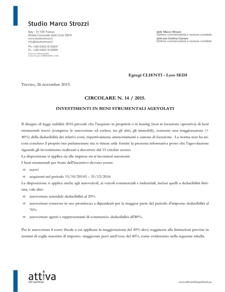 40%) della deducibilità dei relativi costi, rispettivamente ammortamenti e canone di locazione. La norma non ha ancora concluso il proprio iter parlamentare ma si ritiene utile fornire la presenta informativa posto che l’agevolazione