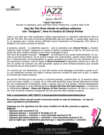 * SAVE THE DATE * Venerdì 11 settembre, parco dell’Hotel Terme Preistoriche, a partire dalle 19.00 ! Jazz By The Pool chiude la settima edizione con “Imagine”, inno in musica di Cheryl Porter ! Cade in una data due volte significativa l’ultimo appuntamento in calendario dell’edizione 2015 di Jazz By The Pool. Non solo la ricorrenza dell’attentato alle torri gemelle, in questa data, sette anni fa, la rassegna jazz a bordo piscina dell’Hotel terme Preistoriche di Montegrotto (PD) offriva al pubblico il suo primo concerto di sempre. ! Il prossimo venerdì - 11 settembre appunto - sarà la splendida voce Cheryl Porter a chiudere l’edizione “Back to Black” celebrando in musica il settimo compleanno di Jazz by The Pool con una serata dal forte richiamo simbolico e dal chiaro messaggio di pace. Nel nome del progetto musicale - “Imagine” - la promessa di una serata indimenticabile: un concerto di piccola formazione, ma di grande impatto che comprenderà i grandi classici della musica jazz d internazionale. Ad accompagnare in questa occasione una delle voci più importanti del nostro panorama musicale ci sarà la magia di Marco Ponchiroli al pianoforte, artista che in oltre 20 anni di carriera ha costruito uno stile personale capace di unire all’improvvisazione jazz sonorità provenienti dai più diversi generi musicali. ! Un concerto per non dimenticare, un inno alla musica come linguaggio universale in grado di unire, uno spettacolo circolare che sigilla il virtuoso percorso circolare di sette anni di jazz. In attesa di ritrovarsi per l’ottava edizione. ! Ma Jazz By The Pool non è solo musica. La formula prevede, a partire dalle 19, un aperitivo seguito da una cena a buffet, o, a scelta, da un tuffo nelle benefiche acque termali delle piscine termali per una combinazione di benessere, gusto e cultura unica nel suo genere. L’evento-degustazione di questa settimana è curato dall’associazione Strada del Vino dei Colli Euganei e, in particolare, dall’azienda Salvan - Vigne del Pigozzo di Due Carrare produttore, da oltre un secolo, di vini rossi di grande carattere, protagonisti del lato gourmet della rassegna euganea. ! Info e prenotazioni: 049 793477 o [email protected] ! Ricordiamo infine che gli eventi si terranno anche in caso di maltempo. In caso di cena è gradita la prenotazione. ! Ingresso ore 19; aperitivo ore 20; cena a buffet ore 20.30; concerto a seguire. Biglietti: - ingresso solo concerto € 10 - ingresso piscina + concerto € 20 dalle ore 19 - ingresso piscina + concerto + cena (bevande escluse) € 35 - ingresso giornaliero piscina + concerto+ cena (bevande escluse) € 52 - jazz & night spa: trattamento gourmet spa + ingresso piscina + concerto ! Scheda dell’evento IMAGINE Cheryl Porter: voce Marco Ponchiroli: pianoforte !! Cheryl Porter Artista e cantante americana Cheryl Porter si avvicina al mondo della musica nel 1990 con una borsa di studio in canto lirico alla Northern Illinois University diventando in 2 anni la miglior concertista di Chicago. Nel 1995 si trasferisce in Italia per proseguire la sua carriera nell'opera lirica, ma è proprio qui che si riavvicina alle radici della musica afro-americana, in particolare lo spirituals e il gospel. Mescolando Spirituals, Gospel, Classica e Jazz, Cheryl Porter si distingue per le sue doti vocali e si trova presto a duettare e collaborare assieme a grandi artisti, fra cui Paolo Conte, Katia Ricciarelli, Gianni Morandi, Tito Puente, Mariah Carey, David Crosby e Amii Stewart. Nel 2003 Luciano Pavarotti la chiama a guidare un coro gospel londinese, per cantare al suo matrimonio in occasione del quale ha condiviso il palco con Bono e Andrea Bocelli e Zucchero. Fra le sue sperimentazioni musicali, c'è anche l'album Mina in Black, in cui l'artista reinterpreta in chiave jazz e blues i grandi successi della celebre Mina. Dal 2004 collabora attivamente con la Banda Musicale della Polizia di Stato, con cui si è esibita anche in un gran concerto a Manhattan in occasione del Columbus Day nel 2008. Oltre a cantare, dal 1998 al 2002 Cheryl Porter ha insegnato canto nella scuola musicale vicentina Thelonious, presso la quale viene istituito un corso per coro gospel. Nel 2014 è ospite del 45º Premio Barocco.I critici e gli esperti la paragonano a grandi indimenticabili artiste quali Sarah Vaughan, Dinah Washington e Mahalia Jackson. Ha registrato più di 20 CD di Spirituals, Jazz, e Gospel, e più di 40 singoli. Nel corso della sua carriera ha avuto modo di esibirsi in 15 paesi (toccando America, Europa, Medio Oriente, Sud America e Caraibi). ! Marco Ponchiroli Marco Ponchiroli, eclettico artista veneziano, si diploma con lode in pianoforte presso il conservatorio Benedetto Marcello di Venezia. Intraprende ben presto un percorso di ricerca che lo porta a contaminare tra loro vari generi musicali e varie forme di esperienza artistica. Conosce il blues, il pop, il reggae (nel 1997 partecipa al festival di San Remo con i Pitura Freska), collabora a vari progetti discografici, compone la musica per lo spettacolo teatrale “ Il Grigio” di Giorgio Gaber. Mantiene viva la passione per il jazz, il suo principale genere di riferimento, e suona con musicisti noti nel panorama jazzistico italiano: Flavio Boltro, Massimo Manzi, Nicola Stilo, Robert Bonisolo, Ares Tavolazzi, David Boato, Saverio Tasca, Maurizio Caldura, Enzo Zirilli, Roberto Dani, Gigi Sella, Marco Castelli, Michel Marre, Marc Abrams, Claudio Roditi, Enrica Bacchia, John Riley,ecc. Insieme a Fabrizio Bosso affronta una tournée in Sudamerica. Si dedica all’insegnamento e alla composizione, attraverso la quale si impegna nella definizione di uno stile personale capace di unire all’improvvisazione jazz sonorità provenienti da disparati generi musicali ed elaborate grazie a un’intensa attività di ricerca, che è per il pianista l’elemento centrale e fondante del suo lavoro. Le sue composizioni si possono ascoltare sia in dischi pubblicati a