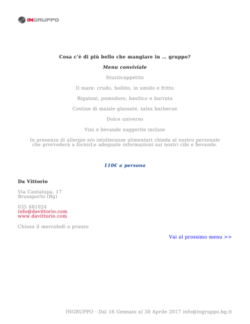 Cosa c’è di più bello che mangiare in … gruppo? Menu conviviale Stuzzicappetito Il mare: crudo, bollito, in umido e fritto Rigatoni, pomodoro, basilico e burrata Costine di maiale glassate, salsa barbecue Dolce universo Vini e bevande suggerite incluse In presenza di allergie e/o intolleranze alimentari chieda al nostro personale che provvederà a fornirLe adeguate informazioni sui nostri cibi e bevande. 110€ a persona Da Vittorio Via Cantalupa, 17 Brusaporto (Bg) 035 681024 [email protected] www.davittorio.com Chiuso il mercoledì a pranzo Vai al prossimo menu >> INGRUPPO - Dal 16 Gennaio al 30 Aprile 2017 [email protected]