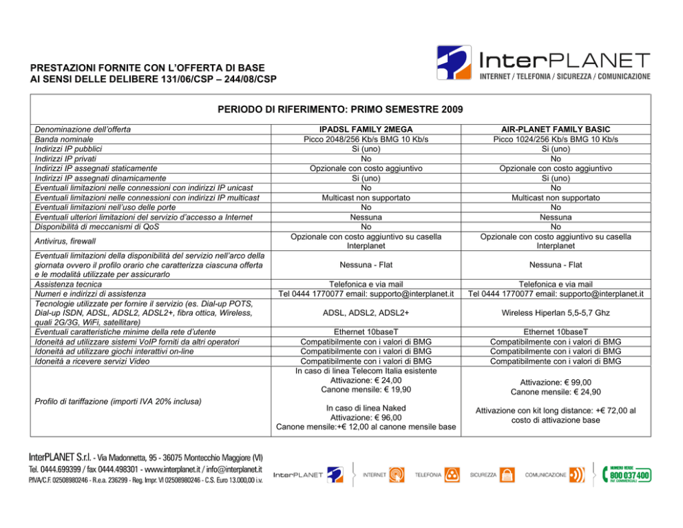 PRESTAZIONI FORNITE CON L’OFFERTA DI BASE AI SENSI DELLE DELIBERE 131/06/CSP – 244/08/CSP PERIODO DI RIFERIMENTO: PRIMO SEMESTRE 2009 Denominazione dell’offerta Banda nominale Indirizzi IP pubblici Indirizzi IP privati Indirizzi IP assegnati staticamente Indirizzi IP assegnati dinamicamente Eventuali limitazioni nelle connessioni con indirizzi IP unicast Eventuali limitazioni nelle connessioni con indirizzi IP multicast Eventuali limitazioni nell’uso delle porte Eventuali ulteriori limitazioni del servizio d’accesso a Internet Disponibilità di meccanismi di QoS Antivirus, firewall Eventuali limitazioni della disponibilità del servizio nell’arco della giornata ovvero il profilo orario che caratterizza ciascuna offerta e le modalità utilizzate per assicurarlo Assistenza tecnica Numeri e indirizzi di assistenza Tecnologie utilizzate per fornire il servizio (es. Dial-up POTS, Dial-up ISDN, ADSL, ADSL2, ADSL2+, fibra ottica, Wireless, quali 2G/3G, WiFi, satellitare) Eventuali caratteristiche minime della rete d’utente Idoneità ad utilizzare sistemi VoIP forniti da altri operatori Idoneità ad utilizzare giochi interattivi on-line Idoneità a ricevere servizi Video Profilo di tariffazione (importi IVA 20% inclusa) IPADSL FAMILY 2MEGA Picco 2048/256 Kb/s BMG 10 Kb/s Si (uno) No Opzionale con costo aggiuntivo Si (uno) No Multicast non supportato No Nessuna No Opzionale con costo aggiuntivo su casella Interplanet AIR-PLANET FAMILY BASIC Picco 1024/256 Kb/s BMG 10 Kb/s Si (uno) No Opzionale con costo aggiuntivo Si (uno) No Multicast non supportato No Nessuna No Opzionale con costo aggiuntivo su casella Interplanet Nessuna - Flat Nessuna - Flat Telefonica e via mail Tel 0444 1770077 email: [email protected] Telefonica e via mail Tel 0444 1770077 email: [email protected] ADSL, ADSL2, ADSL2+ Wireless Hiperlan 5,5-5,7 Ghz Ethernet 10baseT Compatibilmente con i valori di BMG Compatibilmente con i valori di BMG Compatibilmente con i valori di BMG In caso di linea Telecom Italia esistente Attivazione: € 24,00 Canone mensile: € 19,90 Ethernet 10baseT Compatibilmente con i valori di BMG Compatibilmente con i valori di BMG Compatibilmente con i valori di BMG In caso di linea Naked Attivazione: € 96,00 Canone mensile:+€ 12,00 al canone mensile base Attivazione con kit long distance: +€ 72,00 al costo di attivazione base Attivazione: € 99,00 Canone mensile: € 24,90