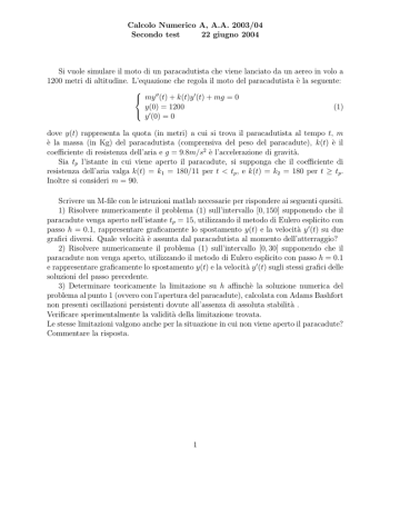Calcolo Numerico A, A.A. 2003/04 Secondo test 22 giugno 2004 Si vuole simulare il moto di un paracadutista che viene lanciato da un aereo in volo a 1200 metri di altitudine. L’equazione che regola il moto del paracadutista è la seguente: my 00 (t) + k(t)y 0 (t) + mg = 0 y(0) = 1200 (1) 0 y (0) = 0 dove y(t) rappresenta la quota (in metri) a cui si trova il paracadutista al tempo t, m è la massa (in Kg) del paracadutista (comprensiva del peso del paracadute), k(t) è il coefficiente di resistenza dell’aria e g = 9.8m/s2 è l’accelerazione di gravità. Sia tp l’istante in cui viene aperto il paracadute, si supponga che il coefficiente di resistenza dell’aria valga k(t) = k1 = 180/11 per t < tp , e k(t) = k2 = 180 per t ≥ tp . Inoltre si consideri m = 90. Scrivere un M-file con le istruzioni matlab necessarie per rispondere ai seguenti quesiti. 1) Risolvere numericamente il problema (1) sull’intervallo [0, 150] supponendo che il paracadute venga aperto nell’istante tp = 15, utilizzando il metodo di Eulero esplicito con passo h = 0.1, rappresentare graficamente lo spostamento y(t) e la velocità y 0 (t) su due grafici diversi. Quale velocità è assunta dal paracadutista al momento dell’atterraggio? 2) Risolvere numericamente il problema (1) sull’intervallo [0, 30] supponendo che il paracadute non venga aperto, utilizzando il metodo di Eulero esplicito con passo h = 0.1 e rappresentare graficamente lo spostamento y(t) e la velocità y 0 (t) sugli stessi grafici delle soluzioni del passo precedente. 3) Determinare teoricamente la limitazione su h affinchè la soluzione numerica del problema al punto 1 (ovvero con l’apertura del paracadute), calcolata con Adams Bashfort non presenti oscillazioni persistenti dovute all’assenza di assoluta stabilità . Verificare sperimentalmente la validità della limitazione trovata. Le stesse limitazioni valgono anche per la situazione in cui non viene aperto il paracadute? Commentare la risposta. 1