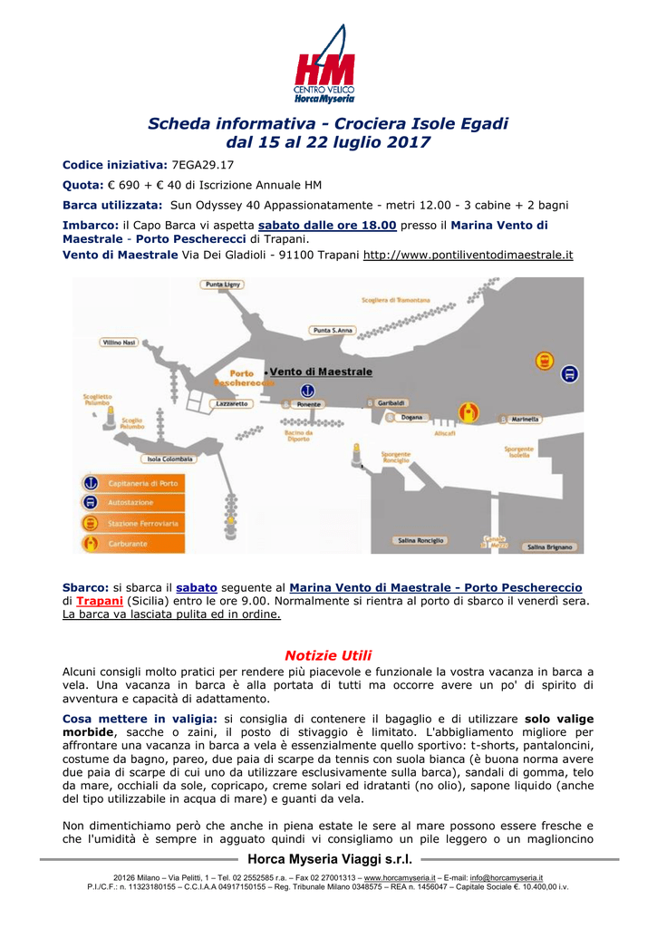 Scheda informativa - Crociera Isole Egadi dal 15 al 22 luglio 2017 Codice iniziativa: 7EGA29.17 Quota: € 690 + € 40 di Iscrizione Annuale HM Barca utilizzata: Sun Odyssey 40 Appassionatamente - metri 12.00 - 3 cabine + 2 bagni Imbarco: il Capo Barca vi aspetta sabato dalle ore 18.00 presso il Marina Vento di Maestrale - Porto Pescherecci di Trapani. Vento di Maestrale Via Dei Gladioli - 91100 Trapani http://www.pontiliventodimaestrale.it Sbarco: si sbarca il sabato seguente al Marina Vento di Maestrale - Porto Peschereccio di Trapani (Sicilia) entro le ore 9.00. Normalmente si rientra al porto di sbarco il venerdì sera. La barca va lasciata pulita ed in ordine. Notizie Utili Alcuni consigli molto pratici per rendere più piacevole e funzionale la vostra vacanza in barca a vela. Una vacanza in barca è alla portata di tutti ma occorre avere un po' di spirito di avventura e capacità di adattamento. Cosa mettere in valigia: si consiglia di contenere il bagaglio e di utilizzare solo valige morbide, sacche o zaini, il posto di stivaggio è limitato. L'abbigliamento migliore per affrontare una vacanza in barca a vela è essenzialmente quello sportivo: t-shorts, pantaloncini, costume da bagno, pareo, due paia di scarpe da tennis con suola bianca (è buona norma avere due paia di scarpe di cui uno da utilizzare esclusivamente sulla barca), sandali di gomma, telo da mare, occhiali da sole, copricapo, creme solari ed idratanti (no olio), sapone liquido (anche del tipo utilizzabile in acqua di mare) e guanti da vela. Non dimentichiamo però che anche in piena estate le sere al mare possono essere fresche e che l'umidità è sempre in agguato quindi vi consigliamo un pile leggero o un maglioncino Horca Myseria Viaggi s.r.l. 20126 Milano – Via Pelitti, 1 – Tel. 02 2552585 r.a. – Fax 02 27001313 – www.horcamyseria.it – E-mail: [email protected] P.I./C.F.: n. 11323180155 – C.C.I.A.A 04917150155 – Reg. Tribunale Milano 0348575 – REA n. 1456047 – Capitale Sociale €. 10.400,00 i.v. leggero o una felpa e un paio di pantaloni lunghi. Indispensabile, anche, una giacca impermeabile, cerata o k-way, facoltativi i pantaloni della cerata e gli stivali. Le barche NON sono munite di biancheria è quindi obbligatorio portare: - 1 federa per il cuscino - 1 lenzuolo per coprire il materasso - sacco lenzuolo o sacco a pelo leggero A bordo sono disponibili plaid in pile! Ciascuno deve provvedere alle proprie medicine personali. NON DIMENTICATE LA TESSERA SANITARIA Toilette: Le barche a vela sono dotate di un wc abbastanza simili a quello che tutti noi conosciamo, ma molto diverso come funzionamento rispetto a quello di casa. Infatti per il suo svuotamento utilizziamo una pompa manuale che pesca dall'esterno l'acqua, la spinge nel wc e la scarica sempre all'esterno dello scafo. Le tubazioni che compongono il sistema hanno, per ragioni di sicurezza, un diametro molto piccolo. Per questo motivo non bisogna assolutamente gettare carta igienica, carta cucina, assorbenti… nel wc, pena un poco piacevole quanto certo intasamento dello stesso. Acqua: La barca a vela trasporta una quantità limitata di acqua dolce, infatti essa in barca è un bene prezioso. Bisogna quindi fare di tutto per non sprecarla, non aprire mai i rubinetti al massimo e richiuderli accuratamente ed evitare lunghe docce! Medicinali: Oltre alle medicine personali si consiglia di portare aspirina e analgesici, pomate per punture di insetti, crema per scottature, cerotti e per chi pensa di soffrire di mal di mare, gomme da masticare o cerotti o braccialetti. Molto utile una confezione di salviettine detergenti Elettricità: Quando si naviga a vela l' energia a bordo viene fornita da batterie a 12 volt che alimentano tutti i sistemi della barca. Anche in questo caso è consigliato evitare di lasciare accese le luci, evitare di caricare cellulari e macchine fotografiche, durante la navigazione; in quanto la prima cosa che si ferma quando le batterie sono scariche è il frigorifero e nel periodo estivo non è sicuramente piacevole. La corrente 220 volt sarà disponibile solo nei porti. Cassa comune: a bordo, al momento dell’imbarco tutto l’ equipaggio versa nella cassa comune una quota con cui si provvederà alle spese che si affrontano durante la navigazione: spese portuali, gas e gasolio, piccoli danni dovuti ad incuria e la cambusa anche per lo skipper (esclusi eventuali ristoranti). La cambusa è la scorta di viveri presente sulla barca. Prima della partenza effettuerete la spese è importante che ognuno faccia presente eventuali intolleranze alimentari o preferenze. . Tenete conto però che spesso è difficile reperire alcuni alimenti particolari (per esempio senza glutine), vi raccomandiamo quindi di portarvi tali alimenti. Vita di bordo: Tutti sono tenuti a partecipare alle attività di bordo, per quanto attiene alla manutenzione degli spazi comuni. Qualsiasi decisione abbia a che vedere con la sicurezza della navigazione è di ESCLUSIVA competenza del Capo Barca, il quale è sempre un Istruttore HM ed ovviamente è disponibile ad integrare la crociera con esperienze didattiche. In tema di sicurezza in mare, ti ricordo che si tratta soprattutto di un corretto atteggiamento mentale: il non seguire le istruzioni ed i consigli del Capo Barca potrebbe rendere meno piacevole la tua vacanza. Attenzione: L'eventuale perdita del tender e/o del motore fuoribordo non è coperta da assicurazione ed è quindi da risarcire con la cassa comune. Horca Myseria Viaggi s.r.l. 20126 Milano – Via Pelitti, 1 – Tel. 02 2552585 r.a. – Fax 02 27001313 – www.horcamyseria.it – E-mail: [email protected] Partita IVA n. 11323180155 – C.C.I.A.A 04917150155 – Reg. Tribunale Milano 0348575 – REA n. 1456047 – Capitale Sociale €. 10.400,00 i.v. Come raggiungere Trapani (Sicilia): Compagnie aeree Trapani: Ryanair http://www.ryanair.com/site/IT/ Alitalia http://www.alitalia.com/ Da Trapani aeroporto a Trapani porto: (40 minuti in autobus) 