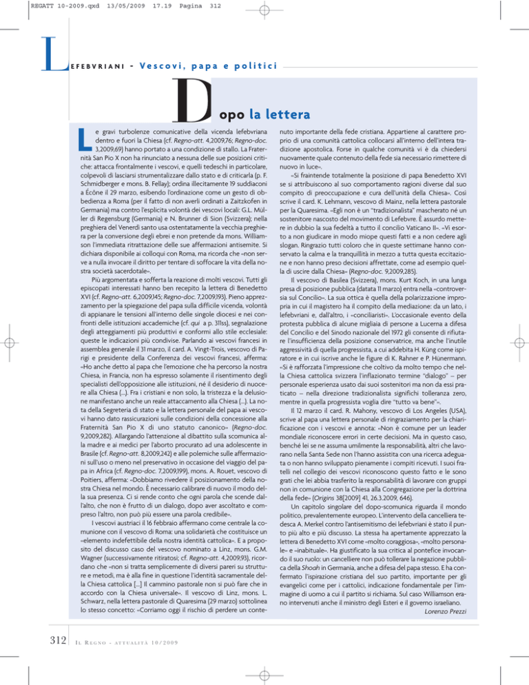 REGATT 10-2009.qxd 13/05/2009 L EFEBVRIANI 17.19 Pagina 312 - Ve scov i , p a p a e p o l i t i c i D opo la lettera L e gravi turbolenze comunicative della vicenda lefebvriana dentro e fuori la Chiesa (cf. Regno-att. 4,2009,76; Regno-doc. 3,2009,69) hanno portato a una condizione di stallo. La Fraternità San Pio X non ha rinunciato a nessuna delle sue posizioni critiche: attacca frontalmente i vescovi, e quelli tedeschi in particolare, colpevoli di lasciarsi strumentalizzare dallo stato e di criticarla (p. F. Schmidberger e mons. B. Fellay); ordina illecitamente 19 suddiaconi a Écône il 29 marzo, esibendo l’ordinazione come un gesto di obbedienza a Roma (per il fatto di non averli ordinati a Zaitzkofen in Germania) ma contro l’esplicita volontà dei vescovi locali: G.L. Müller di Regensburg (Germania) e N. Brunner di Sion (Svizzera); nella preghiera del Venerdì santo usa ostentatamente la vecchia preghiera per la conversione degli ebrei e non pretende da mons. Williamson l’immediata ritrattazione delle sue affermazioni antisemite. Si dichiara disponibile ai colloqui con Roma, ma ricorda che «non serve a nulla invocare il diritto per tentare di soffocare la vita della nostra società sacerdotale». Più argomentata e sofferta la reazione di molti vescovi. Tutti gli episcopati interessati hanno ben recepito la lettera di Benedetto XVI (cf. Regno-att. 6,2009,145; Regno-doc. 7,2009,193). Pieno apprezzamento per la spiegazione del papa sulla difficile vicenda, volontà di appianare le tensioni all’interno delle singole diocesi e nei confronti delle istituzioni accademiche (cf. qui a p. 311ss), segnalazione degli atteggiamenti più produttivi e conformi allo stile ecclesiale: queste le indicazioni più condivise. Parlando ai vescovi francesi in assemblea generale il 31 marzo, il card. A. Vingt-Trois, vescovo di Parigi e presidente della Conferenza dei vescovi francesi, afferma: «Ho anche detto al papa che l’emozione che ha percorso la nostra Chiesa, in Francia, non ha espresso solamente il risentimento degli specialisti dell’opposizione alle istituzioni, né il desiderio di nuocere alla Chiesa (…). Fra i cristiani e non solo, la tristezza e la delusione manifestano anche un reale attaccamento alla Chiesa (…). La nota della Segreteria di stato e la lettera personale del papa ai vescovi hanno dato rassicurazioni sulle condizioni della concessione alla Fraternità San Pio X di uno statuto canonico» (Regno-doc. 9,2009,282). Allargando l’attenzione al dibattito sulla scomunica alla madre e ai medici per l’aborto procurato ad una adolescente in Brasile (cf. Regno-att. 8,2009,242) e alle polemiche sulle affermazioni sull’uso o meno nel preservativo in occasione del viaggio del papa in Africa (cf. Regno-doc. 7,2009,199), mons. A. Rouet, vescovo di Poitiers, afferma: «Dobbiamo rivedere il posizionamento della nostra Chiesa nel mondo. È necessario calibrare di nuovo il modo della sua presenza. Ci si rende conto che ogni parola che scende dall’alto, che non è frutto di un dialogo, dopo aver ascoltato e compreso l’altro, non può più essere una parola credibile». I vescovi austriaci il 16 febbraio affermano come centrale la comunione con il vescovo di Roma: una solidarietà che costituisce un «elemento indefettibile della nostra identità cattolica». E a proposito del discusso caso del vescovo nominato a Linz, mons. G.M. Wagner (successivamente ritiratosi; cf. Regno-att. 4,2009,93), ricordano che «non si tratta semplicemente di diversi pareri su strutture e metodi, ma è alla fine in questione l’identità sacramentale della Chiesa cattolica […] Il cammino pastorale non si può fare che in accordo con la Chiesa universale». Il vescovo di Linz, mons. L. Schwarz, nella lettera pastorale di Quaresima (29 marzo) sottolinea lo stesso concetto: «Corriamo oggi il rischio di perdere un conte- 312 IL REGNO - AT T UA L I T À 10/2009 nuto importante della fede cristiana. Appartiene al carattere proprio di una comunità cattolica collocarsi all’interno dell’intera tradizione apostolica. Forse in qualche comunità vi è da chiedersi nuovamente quale contenuto della fede sia necessario rimettere di nuovo in luce». «Si fraintende totalmente la posizione di papa Benedetto XVI se si attribuiscono al suo comportamento ragioni diverse dal suo compito di preoccupazione e cura dell’unità della Chiesa». Così scrive il card. K. Lehmann, vescovo di Mainz, nella lettera pastorale per la Quaresima. «Egli non è un “tradizionalista” mascherato né un sostenitore nascosto del movimento di Lefebvre. È assurdo mettere in dubbio la sua fedeltà a tutto il concilio Vaticano II». «Vi esorto a non giudicare in modo miope questi fatti e a non cedere agli slogan. Ringrazio tutti coloro che in queste settimane hanno conservato la calma e la tranquillità in mezzo a tutta questa eccitazione e non hanno preso decisioni affrettate, come ad esempio quella di uscire dalla Chiesa» (Regno-doc. 9,2009,285). Il vescovo di Basilea (Svizzera), mons. Kurt Koch, in una lunga presa di posizione pubblica (datata 11 marzo) entra nella «controversia sul Concilio». La sua ottica è quella della polarizzazione impropria in cui il magistero ha il compito della mediazione: da un lato, i lefebvriani e, dall’altro, i «conciliaristi». L’occasionale evento della protesta pubblica di alcune migliaia di persone a Lucerna a difesa del Concilio e del Sinodo nazionale del 1972 gli consente di rifiutare l’insufficienza della posizione conservatrice, ma anche l’inutile aggressività di quella progressista, a cui addebita H. Küng come ispiratore e in cui iscrive anche le figure di K. Rahner e P. Hünermann. «Si è rafforzata l’impressione che coltivo da molto tempo che nella Chiesa cattolica svizzera l’inflazionato termine “dialogo” – per personale esperienza usato dai suoi sostenitori ma non da essi praticato – nella direzione tradizionalista significhi tolleranza zero, mentre in