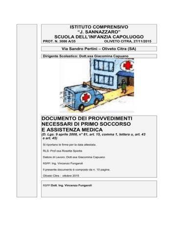 ISTITUTO COMPRENSIVO “J. SANNAZZARO” SCUOLA DELL’INFANZIA CAPOLUOGO PROT. N. 3086 A/35 OLIVETO CITRA, 27/11/2015 Via Sandro Pertini – Oliveto Citra (SA) Dirigente Scolastico: Dott.ssa Giacomina Capuano DOCUMENTO DEI PROVVEDIMENTI NECESSARI DI PRIMO SOCCORSO E ASSISTENZA MEDICA (D. Lgs. 9 aprile 2008, n° 81, art. 15, comma 1, lettera u, art. 43 e art. 45) Si riportano le firme per la data attestata. RLS: Prof.ssa Rosetta Spiotta Datore di Lavoro: Dott.ssa Giacomina Capuano RSPP: Ing. Vincenzo Fungaroli Il presente documento è composto da n. 10 pagine. Oliveto Citra : ottobre 2015 RSPP:Dott. Ing. Vincenzo Fungaroli ISTITUTO COMPRENSIVO “J. SANNAZZARO” Scuola dell’infanzia Capoluogo 2 Documento dei provvedimenti necessari di primo soccorso e assistenza medica INDICE Generalità 1 Addetti al primo soccorso 2 Procedure impartite agli addetti incaricati del pronto soccorso 3 Attivazione piano di pronto soccorso 6 Tenuta del registro infortuni 6 Cassetta di pronto soccorso 6 Contenuto della cassetta di pronto soccorso e materiale aggiuntivo 7 Segnalazione interventi di primo soccorso 8 Numeri telefonici di emergenza 9 Scheda di registrazione degli interventi di pronto soccorso 10 (D. Lgs. 9 aprile 2008, n° 81, art. 15, comma 1, lettera u, art. 43 e art. 45) dott. ing. Vincenzo Fungaroli ISTITUTO COMPRENSIVO “J. SANNAZZARO” Scuola dell’infanzia Capoluogo Documento dei provvedimenti necessari di primo soccorso e assistenza medica 3 1. GENERALITÀ Il presente Documento dei Provvedimenti necessari di Primo Soccorso e assistenza medica contiene l’insieme dei provvedimenti adottati e delle azioni da attuare per garantire agli infortunati il primo soccorso e attivare gli interventi di pronto soccorso e di assistenza medica di emergenza. Il Documento dei Provvedimenti necessari di Primo Soccorso e assistenza medica è stato redatto in virtù del Decreto Legislativo 81/2008, all’art. 15, comma 1, lettera u) , esso stabilisce che tra le misure generali di tutela della salute e della sicurezza dei lavoratori nei luoghi di lavoro, rientrano “le misure di emergenza da attuare in caso di primo soccorso, di lotta antincendio, di evacuazione dei lavoratori e di pericolo grave e immediato”. Al fine di prendere i provvedimenti adeguati il datore di lavoro ha considerato i seguenti fattori: a) natura dell’attività; b) dimensioni dell’azienda o della unità produttiva; c) altre eventuali persone presenti sui luoghi di lavoro. In base all’art. 1 del D.M. 15 luglio 2003 n°388 (regolamento recante disposizioni sul pronto soccorso aziendale) si classifica la scuola denominata “SCUOLA SCUOLA DELL’INFANZIA CAPOLUOGO” con sede operativa nel Comune di Oliveto Citra, provincia di Salerno come Azienda del GRUPPO B: aziende o unità produttive con 3 o più lavoratori che non rientrano nel gruppo A. In particolare, il regolamento classifica le aziende in tre gruppi, tenendo conto della tipologia di attività svolta, del numero dei lavoratori occupati e dei fattori di rischio. Al Gruppo A appartengono le aziende a rischio rilevante (per esempio centrali termoelettriche), le aziende con oltre cinque lavoratori appartenenti o riconducibili ai gruppi tariffari INAIL con indice infortunistico di inabilità permanente superiore a quattro e le aziende o unità produttive con oltre cinque lavoratori a tempo indeterminato del comparto dell'agricoltura. Al Gruppo B appartengono le aziende con tre o più lavoratori che non rientrano nel Gruppo A, mentre fanno parte del Gruppo C le aziende con meno di tre lavoratori che non rientrano nel Gruppo A. 2. ADDETTI AL PRIMO SOCCORSO Le seguenti persone sono state incaricate del servizio di primo soccorso. 1. DI GIORGIO LOREDANA; 2. DI GUIDA EMILIA. Le stesse sono anche incaricate di effettuare la verifica del contenuto della cassetta del pronto soccorso. 2.1 criteri di individuazione degli addetti al pronto soccorso Gli addetti al pronto soccorso sono stati individuati in numero idoneo al fine di assicurare che presso la scuola vi sia sempre, salvo eccezioni, la presenza di almeno un addetto. Il personale deve comunque essere informato sul comportamento da adottare qualora, in via eccezionale, nella scuola non sia presente alcun addetto al Pronto Soccorso. 2.2 designazione degli addetti al pronto soccorso Il Datore di lavoro ha provveduto a designare tramite raccomandata consegnata a mano gli addetti al pronto soccorso (D.Lgs. 81/08 art. 43). Gli stessi sono stati informati di non poter rifiutare la designazione se non per giustificato motivo. Copia delle comunicazioni di designazione è custodita presso gli uffici amministrativi. (D. Lgs. 9 aprile 2008, n° 81, art. 15, comma 1, lettera u, art. 43 e art. 45) dott. ing. Vincenzo Fungaroli ISTITUTO COMPRENSIVO “J. SANNAZZARO” Scuola dell’infanzia Capoluogo Documento dei provvedimenti necessari di primo soccorso e assistenza medica 4 L’elenco degli addetti è stato comunicato al Rappresentante dei Lavoratori per la Sicurezza (RLS) ed a tutti i dipendenti. 2.3 formazione Gli addetti al pronto soccorso sono formati con istruzione teorica e pratica per l’attuazione delle misure di primo intervento interno e per l’attivazione degli interventi di pronto soccorso sono in numero sufficiente e dispongono di attrezzature adeguate, in considerazione delle dimensioni e dei rischi specifici all’interno della scuola. Le caratteristiche minime delle attrezzature di primo soccorso, i requisiti del personale addetto e la sua formazione, individuati in relazione alla natura dell’attività, al numero dei lavoratori occupati ed ai fattori di rischio sono individuati dal decreto ministeriale 15 luglio 2003, n. 388 e dai successivi decreti ministeriali di adeguamento. Per la “scuola dell’infanzia - Capoluogo” i contenuti ed i tempi minimi del corso di formazione sono riportati nell’allegato IV del D.M. 15 luglio 2003 n°388. La formazione dei lavoratori designati al Primo Soccorso deve essere ripetu