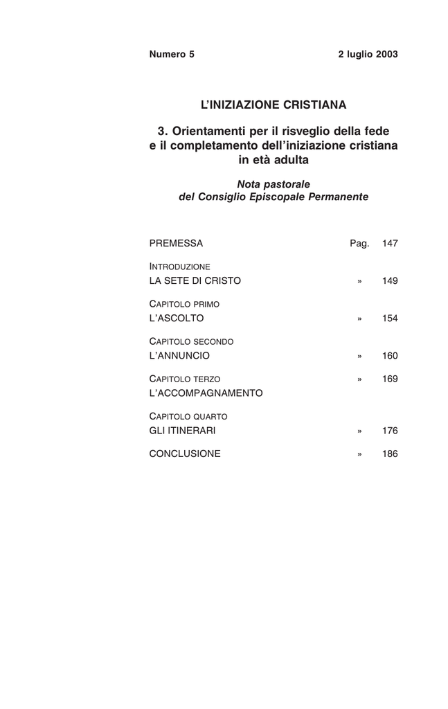 Numero 5 2 luglio 2003 L’INIZIAZIONE CRISTIANA 3. Orientamenti per il risveglio della fede e il completamento dell’iniziazione cristiana in età adulta Nota pastorale del Consiglio Episcopale Permanente PREMESSA Pag. 147 INTRODUZIONE LA SETE DI CRISTO » 149 CAPITOLO PRIMO L’ASCOLTO » 154 CAPITOLO SECONDO L’ANNUNCIO » 160 » 169 CAPITOLO QUARTO GLI ITINERARI » 176 CONCLUSIONE » 186 CAPITOLO TERZO L’ACCOMPAGNAMENTO NOTIZIARIO DELLA CONFERENZA EPISCOPALE ITALIANA a cura della Segreteria Generale NUMERO 5 2 LUGLIO 2003 L’INIZIAZIONE CRISTIANA 3. Orientamenti per il risveglio della fede e il completamento dell’iniziazione cristiana in età adulta Nota pastorale del Consiglio Episcopale Permanente 145 A seguito della pubblicazione delle due precedenti “Note” pastorali sulla “Iniziazione cristiana”: 1. Orientamenti per il catecumenato degli adulti (cf Notiziario CEI 1997, 3/81-126) e 2. Orientamenti per l’iniziazione dei fanciulli e dei ragazzi dai 7 ai 14 anni (cf Notiziario CEI 1999, 7/253-283), il Consiglio Episcopale Permanente del 20-22 gennaio 2003 ha esaminato una bozza della terza “Nota” pastorale sulla “Iniziazione cristiana” dal titolo: 3. Orientamenti per il risveglio della fede e il completamento della iniziazione cristiana in età adulta. La bozza era stata predisposta dalle Commissioni Episcopali per la dottrina della fede, l’annuncio e la catechesi e per la liturgia, con il contributo del “Gruppo di studio nazionale per il catecumenato” costituito nel 1993. Successivamente, sulla scorta dei suggerimenti e delle osservazioni offerte dai Vescovi del Consiglio Permanente, le stesse Commissioni hanno rielaborato il documento e ne hanno presentato una nuova stesura all’esame delle stesso Consiglio nella sessione del 24-26 marzo 2003 per la debita approvazione. Il Consiglio ha approvato il testo della “Nota”, affidando alla Presidenza e alla Segreteria Generale la pubblicazione tenendo presenti le integrazioni proposte dai Vescovi. Il documento è stato reso pubblico il giorno 8 giugno 2003, domenica di Pentacoste. 146 PREMESSA Comunicare il Vangelo è, per la Chiesa, il compito primario e fondamentale; è la grazia più grande e la sua più vera e intima identità. La consapevolezza del primato dell’evangelizzazione si è fatta negli ultimi decenni sempre più chiara nelle nostre comunità e, mentre ha prodotto una salutare inquietudine di fronte ai radicali cambiamenti nella società e nella cultura, ha impresso una marcata connotazione missionaria a tutta la vita e all’azione della Chiesa. Concretamente questa “conversione della pastorale” non può limitarsi a coloro che non hanno ancora ricevuto l’annuncio del Vangelo, ma esige una rinnovata e sempre più convinta attenzione a tutti i battezzati, a cominciare da coloro che, pur non avendo rinnegato formalmente il loro Battesimo, vivono un fragile rapporto con la Chiesa e devono quindi essere interpellati dal santo Vangelo di Gesù Cristo per riscoprirne la bellezza e la forza trasformante e per ritrovare così la gioia di vivere l’esperienza cristiana in maniera più consapevole e operosa. Dopo la pubblicazione della prima Nota pastorale sulla iniziazione cristiana dedicata al catecumenato degli adulti (30 marzo 1997) e di quella dedicata al catecumenato dei fanciulli e dei ragazzi dai 7 ai 14 anni (23 maggio 1999), questa terza Nota è espressamente indirizzata al “risveglio della fede e al completamento dell’iniziazione cristiana degli adulti”. La Nota pertanto si configura come la realizzazione di uno dei primi obiettivi di quella “agenda pastorale”, che ci vede impegnati nel cammino di questo decennio. In modo puntuale e concreto vengono offerte precise indicazioni, vòlte a far maturare nella comunità cristiana un’apertura missionaria e un ascolto attento e disponibile delle domande ad essa rivolte. Ispirandosi al modello catecumenale, come paradigma dell’azione pastorale, si sollecita la parrocchia a prendere coscienza di essere il “luogo ordinario e privilegiato di evangelizzazione della comunità cristiana” e si indirizza nell’anno liturgico lo sviluppo dell’azione di accompagnamento. La Nota vuole essere anche una prima risposta all’impegno, sollecitato dagli Orientamenti pastorali per il decennio in corso, di mettere in atto “un impegno di primo annuncio, su cui innestare un vero e proprio itinerario di iniziazione o di ripresa della vita cristiana” di quei battezzati che desiderano “ricominciare” un cammino di riscoperta della fede (Comunicare il Vangelo in un mondo che cambia, 57). La pubblicazione di questa terza Nota sulla iniziazione cristiana potrà aiutare le nostre Chiese a operare quei cambiamenti ormai indif- 147 feribili e sempre più urgenti per “comunicare il Vangelo in un mondo che cambia”: tenere presente che l’evangelizzazione non è impegno riservato agli “specialisti”, ma compito proprio e prioritario di tutta la comunità; essere consapevoli che l’iniziazione cristiana non è tanto un settore della pastorale, quanto il suo modello ispiratore e il suo paradigma esemplare; basare ogni percorso formativo sulla catechesi e, prima ancora, fondare ogni catechesi, anche quella dei fanciulli battezzati, sul “primo annuncio”. Da tempo la Chiesa italiana ha operato la scelta qualificante di passare a una “pastorale di missione permanente”. Ci auguriamo che la presente Nota, mentre completa il progetto avviato con la pubblicazione delle due Note precedenti, contribuisca a imprimere al rinnovamento pastorale, in atto nelle nostre comunità, un orientamento preciso, uno slancio creativo, un aiuto concreto ed efficace. Roma, 8 giugno 2003 Domenica di Pentecoste IL CONSIGLIO EPISCOPALE PERMANENTE 148 INTRODUZIONE LA SETE DI CRISTO 1. - Una Samaritana incontra Gesù al pozzo di Giacobbe, vicino alla città di Sicar. Egli le chiede: «Dammi da bere» (Gv 4,7). La sete di Gesù è segno del suo ardente deside
