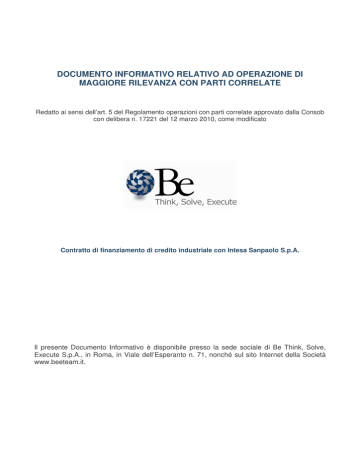 DOCUMENTO INFORMATIVO RELATIVO AD OPERAZIONE DI MAGGIORE RILEVANZA CON PARTI CORRELATE Redatto ai sensi dell’art. 5 del Regolamento operazioni con parti correlate approvato dalla Consob con delibera n. 17221 del 12 marzo 2010, come modificato Contratto di finanziamento di credito industriale con Intesa Sanpaolo S.p.A. Il presente Documento Informativo è disponibile presso la sede sociale di Be Think, Solve, Execute S.p.A., in Roma, in Viale dell’Esperanto n. 71, nonché sul sito Internet della Società www.beeteam.it. SOMMARIO INTRODUZIONE 3 DEFINIZIONI 4 1. AVVERTENZE 4 2. INFORMAZIONI RELATIVE ALL’OPERAZIONE 4 2.1 Descrizione delle caratteristiche, modalità, termini e condizioni dell’Operazione 4 2.2. Indicazione delle parti correlate con cui l’Operazione è stata posta in essere, del relativo grado di correlazione, della natura e della portata degli interessi di tali parti nell’Operazione 5 2.3. Indicazione delle motivazioni economiche e della convenienza per la Società dell’Operazione 5 2.4. Modalità di determinazione del corrispettivo dell’Operazione e valutazioni circa la sua congruità rispetto ai valori di mercato di operazioni similari 5 2.5. Illustrazione degli effetti economici, patrimoniali e finanziari dell’Operazione 6 2.6. Incidenza dell’Operazione sui compensi dei componenti dell’organo di amministrazione della Società e/o di società da questa controllate 6 2.7. Informazioni relative agli strumenti finanziari della Società detenuti dai componenti degli organi di amministrazione e di controllo, direttori generali e dirigenti della Società eventualmente coinvolti nell’Operazione e agli interessi di questi ultimi in operazioni straordinarie 6 Conduzione e partecipazione alle trattative - Procedure di approvazione dell’operazione 6 2.8. Allegato 2 Introduzione Il presente Documento Informativo è stato predisposto da Be Think, Solve, Execute S.p.A. ai sensi dell’articolo 5 del Regolamento approvato con delibera Consob n. 17221 del 12 marzo 2010, recante disposizioni in materia di operazioni con parti correlate (il “Regolamento CONSOB”) nonché dell’articolo 2.2 della procedura che disciplina le operazioni con parti correlate approvata dal consiglio di amministrazione di Be Think, Solve, Execute S.p.A. in data 11 novembre 2010 (la “Procedura OPC”). Be Think, Solve, Execute S.p.A. è una società di diritto italiano con sede in Roma, in Viale dell’Esperanto n. 71, codice fiscale e Partita IVA 01483450209, iscritta al registro delle Imprese di Roma, le cui azioni sono negoziate sul Mercato Telematico Azionario organizzato e gestito da Borsa Italiana S.p.A. (di seguito, “BE” o la ”Società”). 3 DEFINIZIONI Be Consulting Be Consulting Think, Project & Plan S.p.A., già B.E.E. Consulting, società con sede legale a Roma, controllata al 100% dall’Emittente Be Solutions Be Solutions Solve, Realize & Control S.p.A., già B.E.E. Solutions, società con sede legale a Roma, controllata al 100% dall’Emittente. Be Operations Be Operations Execute, Manage & Perform S.p.A. già B.E.E. Sourcing, società con sede legale a Roma, controllata al 66,7% dall’Emittente CONSOB Commissione Nazionale per le Società e la Borsa, con sede in Roma, via G.B. Martini n. 3. Documento Informativo Il presente documento informativo redatto ai sensi e per gli effetti del Regolamento CONSOB. Emittente, BE o la Società Be Think, Solve, Execute S.p.A.,in breve Be S.p.A., già B.E.E. TEAM S.p.A. con sede legale in Roma, Viale dell’Esperanto n. 71, numero di iscrizione presso il Registro delle Imprese di Roma, codice fiscale e Partita IVA 01483450209. Finanziamento Il contratto di finanziamento di credito industriale per un importo in linea capitale pari ad Euro 4,5 milioni stipulato tra Intesa Sanpaolo e la Società. Gruppo Be o Gruppo Il gruppo facente capo a BE. Gruppo Intesa Sanpaolo Il gruppo di società che fa capo a Intesa Sanpaolo. Intesa Sanpaolo Intesa Sanpaolo S.p.A. con sede legale in Torino, piazza San Carlo, 156 – 10121, Partita IVA 10810700152. Operazione La concessione del Finanziamento da parte di Intesa Sanpaolo alla Società. 1. Avvertenze Alla data del presente Documento Informativo non si ravvisano particolari rischi connessi a potenziali conflitti di interesse derivanti dall’Operazione con parti correlate descritta nel Documento Informativo. 2. Informazioni relative all’Operazione 2.1 Descrizione delle caratteristiche, modalità, termini e condizioni dell’Operazione La Società ha stipulato con Intesa Sanpaolo in data 8 novembre 2012 un contratto di finanziamento ai sensi del quale Intesa Sanpaolo ha erogato alla Società un finanziamento di credito industriale per un importo in linea capitale pari a circa Euro 4,5 milioni. Il Finanziamento prevede il rimborso in 8 rate semestrali ciascuna per un importo pari a Euro 562.500, con la prima rata in scadenza il 30 settembre 2013 e l’ultima rata in scadenza il 31 marzo 2017. Ai sensi del Finanziamento il tasso di interesse dovuto per ciascun semestre – in linea con le condizioni di mercato – è variabile ed è determinato in misura nominale annua dalla somma di: 1) una quota fissa pari al 6,50%; 2) una quota variabile pari al tasso MEDIA EURIBOR 3 MESI, base 365. Il Tasso Effettivo Globale (TAEG) del finanziamento è pari al 7,343% annuo. 4 Il suddetto contratto prevede che, nell’ipotesi in cui la Società si renda inadempiente rispetto al proprio obbligo di pagamento di ogni somma dovuta a qualsiasi titolo in dipendenza del Finanziamento, la Società è tenuta a corrispondere ad Intesa Sanpaolo interessi moratori pari al tasso contrattualmente previsto maggiorato di 2 punti percentuali sulla somma non pagata. Inoltre, il Finanziamento prevede l’impegno da parte della Società – per sé e per i propri successori e aventi causa – a far sì che siano rispettati i seguenti covenants finanziari, verificati annualmente su dati consolidati: (i) un rapporto tra PFN e EBI