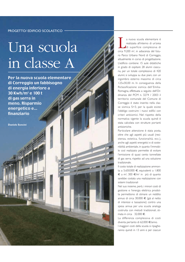 PROGETTO/ EDIFICIO SCOLASTICO Una scuola in classe A Per la nuova scuola elementare di Correggio un fabbisogno di energia inferiore a 30 Kwh/m2 e 100 t di gas serra in meno. Risparmio energetico e… finanziario Daniele Soncini L a nuova scuola elementare è realizzata all’interno di un’area di superficie complessiva di circa 9.200 m2, in adiacenza del futuro Parco Urbano Nord di Correggio, attualmente in corso di progettazione. L’edificio contiene 15 aule didattiche in grado di ospitare 28 alunni ciascuna, per un totale complessivo di 420 alunni; si sviluppa su due piani, con un ingombro esterno massimo di circa 125x30,00 m. In conseguenza della Riclassificazione sismica dell´EmiliaRomagna, effettuata a seguito dell’Ordinanza del PCM n. 3274 / 2003 il territorio comunale del Comune di Correggio è stato inserito nella classe sismica S=3, per la quale esiste l’obbligo costruire i nuovi edifici con criteri antisismici. Nel rispetto della normativa vigente la scuola quindi è stata calcolata con strutture portanti antisismiche. Particolare attenzione è stata posta, oltre che agli aspetti più usuali (resistenza, estetica, funzionalità, ecc.), anche agli aspetti energetici e di sostenibilità ambientale, in quanto l’immobile così realizzato permette di evitare l’emissione di quasi cento tonnellate di gas serra, rispetto ad una soluzione tradizionale. Il costo totale di realizzazione ammonta a 5.650.000 `, equivalenti a 1.800 ` a m2; 300 `/m2 in più di quanto sarebbe costata una realizzazione con sistemi tradizionali Nel suo insieme, però, i minori costi di gestione e l’energia elettrica prodotta permettono di stimare un reddito annuo di circa 30.000 ` (già al netto di interessi e tassazione) contro una spesa annua per una scuola analoga costruita con metodi tradizionali, stimata in circa 32.000 `. La differenza complessiva di costi diventa pertanto di 62.000 `/anno. I maggiori costi della scuola si ripagheranno quindi in 13 anni e per ciascun anno successivo ci potrà essere un utile di circa 30.000 ` netti, proveniente dalla vendita di energia elettrica. Conteggiando anche i costi ambientali evitati in termini di emissione di gas serra, tenendo conto che gli stessi incidono per circa 20 ` per ogni tonnellata di CO 2 emessa, sarebbe da aggiungere un ulteriore risparmio annuo di circa `2.000. Soluzioni ecosostenibili In questo edificio scolastico sono stati applicati molti concetti di progettazione e costruzione ecosostenibile. Si spazia dal risparmio energetico alla produzione di energia da fonti rinnovabili, puntando al risparmio delle fonti esauribili ed al massimo sfruttamento delle potenzialità naturali del nostro pianeta. Gli stessi concetti possono essere trasferiti in qualunque abitazione privata. s0ANNELLI SOLARI FOTOVOLTAICI n IMPIANto che trasforma la radiazione solare in elettricità; s0ANNELLI SOLARI TERMICI n IMPIANTO che trasforma la radiazione solare in energia termica, particoralmente utilizzata per riscaldare l’acqua sanitaria; s3ERRA SOLARE n LOCALE VETRATO CHE raccoglie il calore delle radiazioni solari anche nei periodi freddi; s)MPIANTOGEOTERMICOnFUNZIONACON una pompa di calore collegata a sonde geotermiche che scendono a circa cento metri di profondità e permette di riscaldare in inverno e di raffrescare in estate, sfruttando la temperatura del sottosuolo; s2ECUPEROACQUAPIOVANAnIMPIANTO di raccolta e accumulo dell’acqua piovana con riutilizzo per l’irrigazione del giardino o lo scarico dei WC; s!PPARECCHIABASSOCONSUMOnELETTRODOMESTICI IN CLASSE! ALTA EFFICIENza) e lampadari con lampade a basso consumo (neon); s)SOLAMENTOTERMICOnTUTTELESUPERfici disperdenti debbono essere dotate di elevato isolamento termico ed ele- L’Impianto fotovoltaico Sul tetto dell’edificio sono installati, in maniera integrata con la lamiera di copertura, pannelli fotovoltaici per la produzione di corrente elettrica in corrente continua. Sono installati circa 106 Kw di pannelli rigidi al silicio policristallino sui tetti esposti a sud e circa 21 Kw al silicio amorfo a film sottile sulle coperture curve del secondo lotto. In totale saranno prodotti circa 140.000 Kwh/anno. Sulla copertura è presente un impianto di irrigazione con riutilizzo dell’acqua piovana, per raffreddare i pannelli in estate e migliorarne il rendimento. vata massa per avere migliore inerzia termica; s!LBEDOnICOLORICHIARISULLESUPERfici esterne aiutano a non innalzare la temperatura del pianeta; s"IOSSIDO DI TITANIO n LA PRESENZA DI questa sostanza nei tinteggi esterni permette la riduzione delle polveri inquinanti presenti in atmosfera. L’isolamento termico di un edificio, abbinato alla inerzia termica, sono i due parametri che garantiscono per un edificio un benessere ambientale interno ed un forte risparmio nei consumi energetici. Dal 2006 il Comune di Correggio ha approvato un regolamento edilizio che impone di costruire le nuove abitazioni almeno in “classe C” e cioè con un fabbisogno energetico annuo per riscaldamento inferiore a 70 Kwh/ m2, contro i 90 Kwh/m2 precedentemente permessi. Questa scuola è stata costruita in hCLASSE!vECIOÒCONFABBISOGNOENERgetico inferiore a 30 Kwh/m2 e questo basso consumo permette di alimentarla con fonti rinnovabili senza avere bisogno di gas metano, salvo periodi eccezionalmente freddi. Per garantire isolamento ed inerzia termica, il pacchetto fondamentale delle murature esterne, è costituito da una parete in blocchi di calcestruzzo aerato autoclavato, una doppia lastra di isolante termico (polistirene estruso) ed una parete in mattoni forati tradizionale; il tutto racchiuso dagli intonaci interni ed esterni. s"LOCCHIFORATIINLATERIZIO Elementi in laterizio alleggerito non por tante, con sezione ampiamente forata e quindi con grandi volumi di intercapedine, in grado di aumentare notevolmente le prestazioni termiche dei laterizi pieni o semipieni. Conducibilità termica dichiarata λ = 0,39 W/ mK s0OLISTIRENE ESPANSO ESTRUSO MONOstrato Il polisti