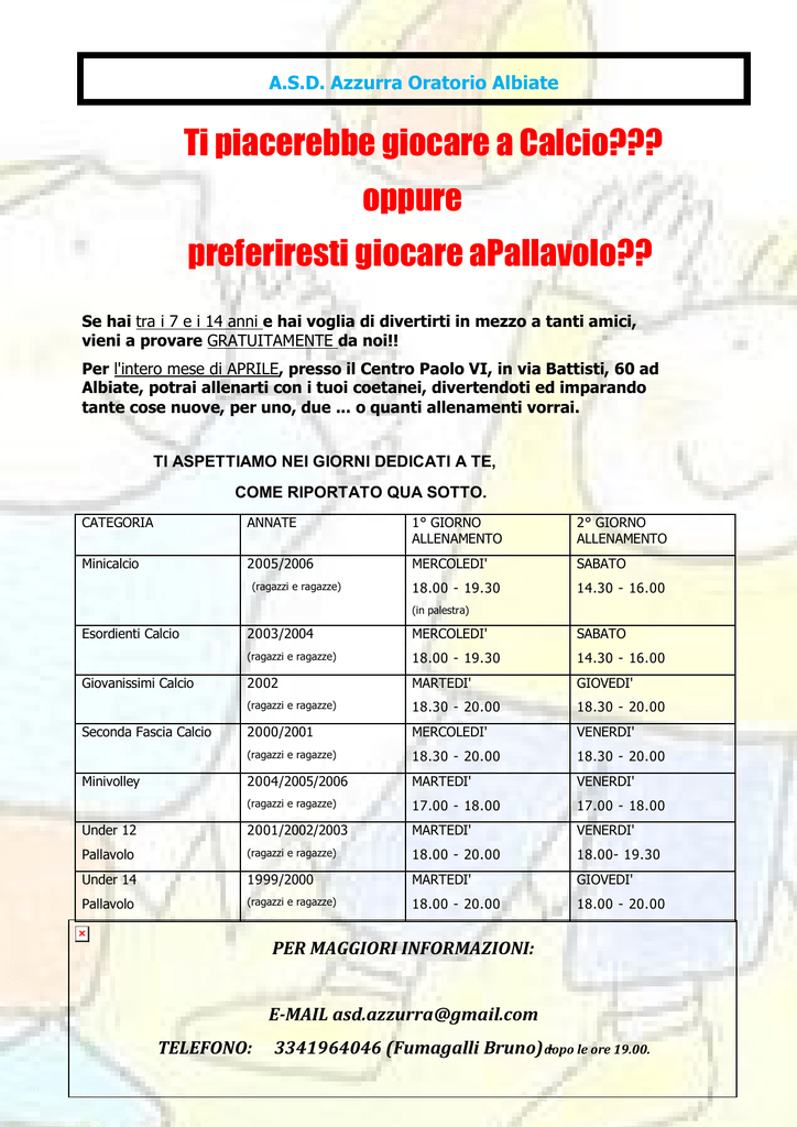 A.S.D. Azzurra Oratorio Albiate Ti piacerebbe giocare a Calcio??? oppure preferiresti giocare aPallavolo?? Se hai tra i 7 e i 14 anni e hai voglia di divertirti in mezzo a tanti amici, vieni a provare GRATUITAMENTE da noi!! Per l'intero mese di APRILE, presso il Centro Paolo VI, in via Battisti, 60 ad Albiate, potrai allenarti con i tuoi coetanei, divertendoti ed imparando tante cose nuove, per uno, due ... o quanti allenamenti vorrai. TI ASPETTIAMO NEI GIORNI DEDICATI A TE, COME RIPORTATO QUA SOTTO. CATEGORIA ANNATE 1° GIORNO ALLENAMENTO 2° GIORNO ALLENAMENTO Minicalcio 2005/2006 MERCOLEDI' SABATO 18.00 - 19.30 14.30 - 16.00 (ragazzi e ragazze) (in palestra) Esordienti Calcio 2003/2004 MERCOLEDI' SABATO (ragazzi e ragazze) 18.00 - 19.30 14.30 - 16.00 2002 MARTEDI' GIOVEDI' (ragazzi e ragazze) 18.30 - 20.00 18.30 - 20.00 2000/2001 MERCOLEDI' VENERDI' (ragazzi e ragazze) 18.30 - 20.00 18.30 - 20.00 2004/2005/2006 MARTEDI' VENERDI' (ragazzi e ragazze) 17.00 - 18.00 17.00 - 18.00 Under 12 2001/2002/2003 MARTEDI' VENERDI' Pallavolo (ragazzi e ragazze) 18.00 - 20.00 18.00- 19.30 Under 14 1999/2000 MARTEDI' GIOVEDI' Pallavolo (ragazzi e ragazze) 18.00 - 20.00 18.00 - 20.00 Giovanissimi Calcio Seconda Fascia Calcio Minivolley PER MAGGIORI INFORMAZIONI: E-MAIL [email protected] TELEFONO: 3341964046 (Fumagalli Bruno) dopo - le ore 19.00.