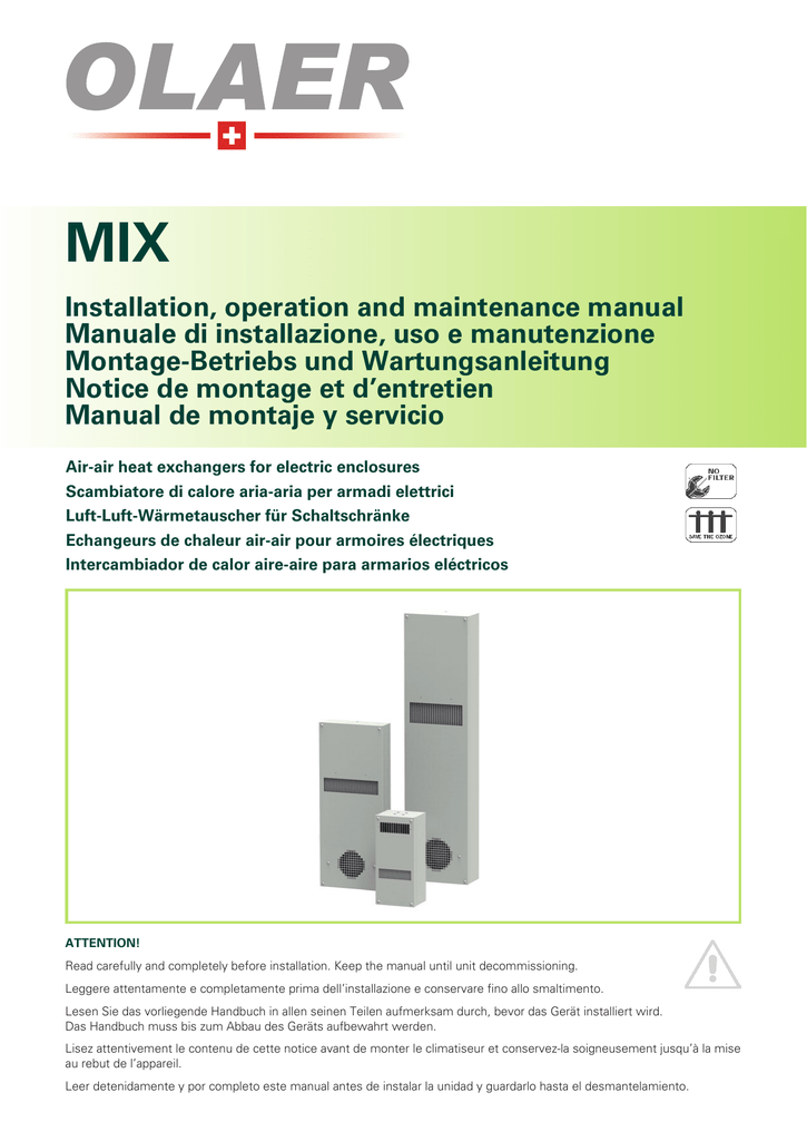 MIX Installation, operation and maintenance manual Manuale di installazione, uso e manutenzione Montage-Betriebs und Wartungsanleitung Notice de montage et d’entretien Manual de montaje y servicio Air-air heat exchangers for electric enclosures Scambiatore di calore aria-aria per armadi elettrici Luft-Luft-Wärmetauscher für Schaltschränke Echangeurs de chaleur air-air pour armoires électriques Intercambiador de calor aire-aire para armarios eléctricos ATTENTION! Read carefully and completely before installation. Keep the manual until unit decommissioning. Leggere attentamente e completamente prima dell’installazione e conservare fino allo smaltimento. Lesen Sie das vorliegende Handbuch in allen seinen Teilen aufmerksam durch, bevor das Gerät installiert wird. Das Handbuch muss bis zum Abbau des Geräts aufbewahrt werden. Lisez attentivement le contenu de cette notice avant de monter le climatiseur et conservez-la soigneusement jusqu’à la mise au rebut de l’appareil. Leer detenidamente y por completo este manual antes de instalar la unidad y guardarlo hasta el desmantelamiento. ENGLISH - Original instructions ENG 1. Cooler unit application 5 1.1 Intended use5 1.2 Improper use5 2. Supply5 3. Updates5 4. Technical features5 5. Transport and handling 5 6. Assembly5 7. Electrical connection5 7.1 Safety5 8. Regulation thermostat for external fan (optinal) 5 9. Maintenance5 10. Technical information6 10.1 Operating principle6 10.2 Safety devices.6 11. Disposal6 12. Troubleshooting6 13. Pictograms15-16 14. Technical data 16 15. Performances17 16. Dimensions18 17. Spare part19-21 18. Guarantee22-23 19. Assistance service 24 ITALIANO - Istruzioni originali ITA 1. Destinazione d’uso7 1.1 Uso previsto7 1.2 Uso non previsto 7 2. Fornitura7 3. Aggiornamenti7 4. Caratteristiche tecniche7 5. Movimentazione e trasporto 7 6. Montaggio7 7. Collegamento elettrico7 7.1 Sicurezza7 8. Termostato di regolazione per ventilatore esterno (optional) 7 9. Manutenzione7 10. Informazioni tecniche8 10.1 Principio di funzionamento 8 10.2 Dispositivi di sicurezza 8 11. Smaltimento8 12. Risoluzione anomalie8 13. Pittogrammi15-16 13. Dati tecnici16 13. Prestazioni17 16. Dimensioni18 17. Ricambi19-21 18. Garanzia22-23 19. Servizio di Assistenza 24 OLAER (Schweiz) AG, Bonnstrasse 3, CH – 3186 Düdingen, Tel 026 492 70 00, Fax 026 492 70 70, [email protected], www.olaer.ch DEUTSCH - Originalbetriebsanleitung DEU 1. Anwendungsbereich des Kühlgerätes 9 1.1 Vorgesehene Anwendung9 1.2 Nicht vorgesehene Anwendung9 2. Lieferumfang9 3. Technische Entwicklung.9 4. Technische Daten9 5. Handhabung und Transport 9 6. Montage9 7. Elektroanschluss9 8. Regelthermostat für externen Ventilator (Optional) 9 7.1 Sicherheit9 9. Wartung9 10. Technische Informationen10 10.1 Funktionsprinzip10 10.2 Sicherheitseinrichtungen10 11. Entsorgung10 12. Beseitigung der Störungen10 13. Piktogramme15-16 14. Technische Daten16 15. Leistungen17 16. Abmessungen18 17. Ersatzteile19-21 18. Garantie22-23 19. Kundendienst24 FRANÇAISE - Notice originale FRA 1. Utilisation du climatiseur 11 1.1 Utilisation prévue11 1.2 Utilisation non prévue11 2. Fourniture11 3. Mises à jour11 4. Données techniques11 5. Déplacement et transport 11 6. Montage11 7. Branchement électrique11 7.1 Sécurité11 8. Thermostat de réglage pour ventilateur externe (option) 11 9. Entretien11 10. Informations techniques12 12.1 Principe de fonctionnement12 12.2 Dispositifs de sécurité 12 11. Mise au rebut12 12. Petit guide de dépannage 12 13. Pictogrammes 15-16 14. Données techniques 16 15. Performances17 16. Dimensions18 17. Pièces détachées 19-21 18. Garantie22-23 19. Service Assistance24 OLAER (Schweiz) AG, Bonnstrasse 3, CH – 3186 Düdingen, Tel 026 492 70 00, Fax 026 492 70 70, [email protected], www.olaer.ch ESPAÑOL - Manual original ESP 1. Uso del intercambiador13 1.1 Uso previsto13 1.2 Uso no previsto13 2. Alcance del suministro13 3. Puestas al dia13 4. Características técnicas13 5. Manutención y transporte 13 6. Montaje13 7. Conexión eléctrica13 7.1 Seguridad13 8. Termostato de regulación para ventilador externo (opcional 13 9. Mantenimiento13 10. Información técnica14 10.1 Principio de funcionamiento14 10.2 Dispositivos de seguridad14 11. Eliminación14 12. Solución de las anomalías 14 13. Pictogramas 15-16 14. Datos técnicos 16 15. Prestaciones17 16. Dimensiones18 17. Piezas de repuestro 19-21 18. Garantía 22-23 19. Servicio de Asistencia 24 OLAER (Schweiz) AG, Bonnstrasse 3, CH – 3186 Düdingen, Tel 026 492 70 00, Fax 026 492 70 70, [email protected], www.olaer.ch ENG 1. Heat exchanger application The MIX series heat exchangers described in this manual are designed and built to cool the air inside electrical switchboards in order to protect components sensitive to thermal shock when the external temperature is lower than the internal temperature. They also provide IP54 ingress protection against contaminating and aggressive substances.. 3. Updates OLAER reserves the right to update its products and the corresponding manuals based on technical progress without prior notice. Please note that at the time of sale, this manual and the corresponding product may not be considered inadequate merely because they are not subject to the abovementioned updates. 1.1 Intended use The MIX heat exchanger must be used: - For cooling electrical switchboards - Within the temperature and voltage-supply limits indicated on the data plate (F.07, pos. 2) of the heat exchanger and also given in table F.08 of this manual - With ambient (external) temperatures lower than those inside the electrical switchboard and in any case lower than the maximum temperature specified in the technical specifications - Away from any sources of heat or hot air - In an environment with adequate air exchange - On switchboards with IP54 rating or higher, and which are completely free of dust and/or other contaminants To ensure correct operation, the specified scheduled mainte