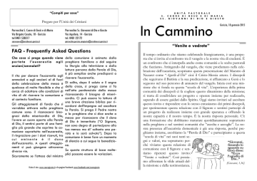 “Compiti per casa” Pregare per l’Unità dei Cristiani Parrocchia S. Cuore di Gesù e di Maria Via Brigata Casale, 10 - Gorizia tel 0481 530317 Parrocchia Ss. Giovanni di Dio e Giusto Via Aquileia, 14 - Gorizia tel. 0481 22172 [email protected] [email protected] FAQ - Frequently Asked Questions Che cosa si prega quando viene della comunione è animata dalla p o r t a t a l ’ e u c a r e s t i a a g l i preghiera familiare o dal seguire la liturgia alla televisione o dalla anziani/ammalati? lettura persona della Parola di Dio, è più semplice anche predisporsi a Il rito per donare l’eucarestia agli ricevere l’eucarestia. ammalati e agli anziani al di fuori della celebrazione della messa è Di solito, dopo il saluto e il segno qualcosa di molto flessibile e che si della croce, si prega come si fa cerca di adattare alle condizioni di nell’atto penitenziale della messa vita di chi ricevere la comunione e riconoscendo il bisogno di misericordia. Ci può essere la lettura di al contesto familiare. una breve citazione biblica per riGli atteggiamenti di fondo che si cordarsi dell’impegno ad ascoltare vorrebbe attivare nella preghiera la Parola. Si prega il Padre nostro comune sono: il riconoscersi biso- e la preghiera che si dice anche a gnosi della misericordia di Dio, messa per riconoscere che il dono l’avere un cuore aperto alla Parola di Dio è immeritato (“O Signore, di Dio, il sentirsi parte di una fami- non sono degno di partecipare alla glia più grande che esprime la co- tua mensa: ma di’ soltanto una pamunione soprattutto nell’eucarestia, rola e io sarò salvato”). Dopo la il ringraziare per i doni ricevuti, tra comunione è bene fare un momento c u i e m i n e n t e è i l d o n o di silenzio a cui segue la benediziodell’eucarestia. A questi atteggiane. menti si può giungere attraverso Su questa struttura di base moltediverse vie. plici possono essere le variazioni. Sicuramente se l’attesa del ministro Visita il sito: www.cuoregiusto.it e la pagina Facebook www.facebook.com/cuoregiusto U N I T À P A S T O R A L E S . C U O R E D I G E S Ù E D I M A R I A S S . G I O V A N N I D I D I O E G I U S T O In Cammino Gorizia, 18 gennaio 2015 “Venite e vedrete” Il tempo ordinario che stiamo celebrando liturgicamente, è una proposta che ci invita al confronto tra il vangelo e la nostra vita di credenti. È un confronto che ci interpella anche come comunità e le scelte pastorali che facciamo. Attingendo dal vangelo, che viene proclamato nella celebrazione dell’eucaristia, scopriamo questa presentazione del Maestro di Nazaret come “Agnello di Dio” cioè il Cristo-Messia atteso. I discepoli che seguivano il Battista e la sua predicazione, si affiancano a Gesù e lo seguono nel suo percorso di annuncio del vangelo. Inizia così una missione che si fonda su questa “scuola di vita”. L’esperienza della prima comunità dei discepoli ci fa cogliere questo dinamismo della missione; si tratta di condividere un progetto e operare insieme per realizzarlo, sapendo di essere guidati dallo Spirito. Oggi siamo invitati ad ascoltare questo invito e rispondere con lo stesso entusiasmo dei primi discepoli, per sperimentare questa relazione con il Signore e sentirci partecipi di un progetto da realizzare insieme con grande speranza e offrendo le nostre capacità e il nostro tempo. È la nostra risposta personale. C’è una formazione che dobbiamo maturare quotidianamente soprattutto nella preghiera e nel sentirci comunità che “ascolta e accoglie”. La nostra presenza all’eucaristia domenicale è già una risposta, perché preghiamo insieme, ascoltiamo la “Parola di Dio” e partecipiamo a questa “scuola di vita” nei suoi tanti segni e valori, ma soprattutto per“Giovanni, fissando lo ché viviamo questa relazione di sguardo su comunione con il Signore e senGesù disse: tiamo ripeterci questo invito: “Ecco l’agnello di “Venite e vedrete”. Così possiaDio..” mo affrontare le sfide attuali del(Giovanni, 1,36) la missione e della testimonianza. Assemblea dell’Unità Pastorale Oggi si svolge la prima assemblea dell’Unità Pastorale, e si articolerà in tre tempi: la celebrazione dell’eucaristia, il momento assembleare, un momento conviviale. La celebrazione della Messa sarà alle 10.30 nella Chiesa del S. Cuore e verrà presieduta dal vescovo Carlo. È previsto un servizio di animazione durante la messa per i bambini dai 3 ai 7 anni nella cappella del S. Cuore. Saranno accolti anche genitori che accompagnano bambini più piccoli. Nel momento assembleare verranno presentati gli Atti della Comunità e ci saranno alcuni interventi dei presenti, il vescovo concluderà l’assemblea. Questo appuntamento non è riservato agli addetti ai lavori, ma è per tutti i fedeli dell’Unità Pastorale. Mentre gli adulti rimarranno in chiesa, per i bambini e ragazzi verrà offerto un momento di animazione e di gioco insieme. Si concluderà infine con un momento conviviale. Chi partecipa può portare, se lo desidera, qualcosa da mangiare, o dolce o salato. Gli orari delle messe di questa domenica in sintesi saranno: S. Cuore: Domenica 8.00 - 10.30 - 18.30 S. Giusto: Domenica: nessuna celebrazione Settimana di preghiera per l’unità dei cristiani Lunedì 19/1 alle 20.30 presso la “sala incontro” di Via Veniero, a San Rocco, ci sarà una conferenza sul tema: “Pane per la vita, energia per il mondo” a cura del teologo cattolico Simone Morandini e del pastore metodista Marco Fornerone. Giovedì 22/1 alle 20.30 nella chiesa metodista di via Diaz ci sarà un incontro ecumenico di preghiera. La settimana di preghiera si conclude sabato 24/1 con la memoria della “conversione di S. Paolo” Sentirsi famiglia Durante questa settimana abbiamo celebrato il funerale di Maria Coglievina ved. Lavisatti, Fischer Anna Maria ved. Di Gregorio, Laura Sassoli Melillo, Stefania Biasi e Michele Pietro Ribeiro (19 anni). Partecipiamo al lutto delle rispettive famiglie