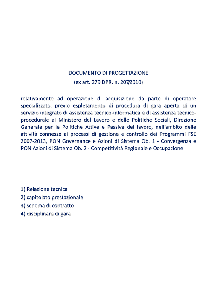 DOCUMENTO DI PROGETTAZIONE (ex art. 279 DPR. n. 207/2010) relativamente ad operazione di acquisizione da parte di operatore specializzato, previo espletamento di procedura di gara aperta di un servizio integrato di assistenza tecnico-informatica e di assistenza tecnicoprocedurale al Ministero del Lavoro e delle Politiche Sociali, Direzione Generale per le Politiche Attive e Passive del lavoro, nell’ambito delle attività connesse ai processi di gestione e controllo dei Programmi FSE 2007-2013, PON Governance e Azioni di Sistema Ob. 1 - Convergenza e PON Azioni di Sistema Ob. 2 - Competitività Regionale e Occupazione 1) Relazione tecnica 2) capitolato prestazionale 3) schema di contratto 4) disciplinare di gara 1) REL AZIONE TECNICA Indice relazione tenica 1. Obiettivi dell'intervento e contesto di rif erimento 1.1 Contesto nor mati vo 1.2 Contesto Organi zzati vo 1.2.1 - Organizzazione interna 1.2.2 1.3 Enti in house del MLPS Contesto tecnico -procedurale 1.3.1 Ambiente pr oduttivo 1.3.1.1 Architettura del sistema informativo 1.3.1.2 L'hardware attualmente installato 1.3.1.3 Il software di base e d'ambiente 1.3.1.4 La rete locale 1.3.2 Il software applicativo in esercizio 1.3.2.1 Sistema Informativo Gestione Monitorag gio e Audit (SIGMA) 1.3.2.2 Sistema di registrazione eventi e comitati FSE (Regeventi) 1.3.2.2 Sistema Inform. Gestione Contab. Fondo di Rotazione (GEFRO) 1.3.2.3 Sistema di registrazione e gestione Decreti (GEDEC) 1.3.2.4 Sistema Informativo Progetti 2000-2006 (SIPRO) 1.3.2.5 Sistema informativo IGRUE per il monitoraggio (MONIT) 1.3.2.6 Sistema di gestione dei fondi nella Comunità 2007 -13 (SFC2007) 1.3.2.7 A l t r i S i s t e m i - p r e g r e s s e p r o g r a m m a z i o n i F S E ( S I G E P, S I S VA ) 1.3.3 L'evoluzione programmata del sistema attualmente in esercizio 2. Oggetto dei servi zi richiesti 2.1 Ser vi zi richiesti 2.1.1 Conduzione tecnica complessiva del S.I. dedicato ed ulteriori servizi di assistenza tecnico-informatica 2.1.2 I servizi di assistenza tecnico -procedurale 2.1.2.1 Assistenza tecnico -procedurale a supporto degli adempimenti comunitari 2.1.2.2 Assistenza tecnico -procedurale alla Direzione generale della DG PA P L , a l l e D i v i s i o n i o p e r a t i v e , a g l i O r g a n i s m i i n t e r m e d i e a g l i E n t i a t t u a t o r i 2.1.2.3 Assistenza e consulenza tecnico -informatica e procedurale in funzione dell'avvio della Programmazione FSE 2014 -2020 2.1.3 Il servizio di manutenzione evolutiva 2.2 Modalità di reali zzazione dei ser vi zi 2.3 Fi gure professionali 2.4 Modalità di remunerazione dei ser vi zi 2.5 Durata del contrat to e ser vizio di affiancamento successi vo 3. Condizioni generali della fornitura 3.1 Modalità di reali zzazione del ser vi zio 3.2 La gestione della qualità dei servi zi 3.2.1 Livelli di servizio per la conduzione tecnic a e gli altri servizi ad oggetto informatico 3.2.2 Livelli di servizio per le attività di assistenza tecnico -procedurale 4. Analisi dei costi per voce di f ornitura 4.1 Premessa 4.2 Conduzione tecni ca complessi va del S.I. dedicato ed ulteriori servi zi di assistenza tecnico -inf or matica 4.3 Assistenza tecnico -procedurale 4.4 Manutenzione evolutiva 4.5 Riepilogo 1. Obiettivi dell'intervento e contesto di riferimento La Direzione Generale per le Politiche Attive e Passive del Lavoro (già Direzione Generale Politiche per l’Orientamento e la Formazione) si propone di selezionare, previo espletamento di pubblica gara, un Operatore che sia in grado di espletare un servizio di assistenza tecnico-informatica e tecnico-procedurale a sostegno della Direzione medesima per tutte le attività contabili, amministrative, procedurali e gestionali connesse al Fondo Sociale Europeo, per un periodo di tre anni utilizzando e aggiornando le procedure e le applicazioni informatiche già operative e assistendo la DG PAPL anche nell’interazione ed adozione di software gestionale proveniente da altre Amministrazioni. L'Operatore prescelto dovrà provvedere alla realizzazione dei servizi richiesti utilizzando l’ambiente tecnologico, normativo e procedurale in essere al momento dell'avvio del contratto, secondo modalità tali, inoltre, da assicurare un concreto trasferimento di know-how dalle figure operanti per conto del Fornitore ai funzionari in organico alla DG PAPL, alle condizioni specificate più avanti. Ferma tuttavia rimanendo l'architettura funzionale generale, l'Amministrazione potrà provvedere, anche in corso di rapporto, alla evoluzione dei sistemi hardware e software di base di riferimento. 1.1 Contesto normativo Nell’ambito del Ministero del Lavoro e delle Politiche Sociali, opera la Direzione Generale per le Politiche Attive e Passive del Lavoro (nel prosieguo, per brevità, denominata solo DG PAPL). Con riferimento in particolare all’oggetto della gara in questione, alla DG PAPL è attribuita la responsabilità di Autorità capofila per gli interventi Finanziati con Fondo Sociale Europeo (FSE), per le politiche di Orientamento e Formazione, oltre a quelle di Autorità di Gestione, Certificazione ed Audit con riferimento a due Programmi Operativi Nazionali. La DG PAPL per il periodo di programmazione dei fondi 2007-2013 è infatti titolare dei seguenti Programmi Operativi Nazionali (PON): PON Governance e Azioni di Sistema, per le Regioni dell’Obiettivo 1 Convergenza (FSE), PON Azioni di Sistema Regioni Ob.2 Competitività Regionale ed Occupazione (FSE). L'intervento progettato è specificamente mirato a supportare la DG PAPL nello svolgimento delle funzioni alla medesima attribuite con riferimento al processo di attuazione degli interventi oggetto di cofinanziamento da parte del Fondo Sociale Europeo. Il contesto normativo di riferimento è dunque composto dalle fonti regolatrici di tale processo ed in particolare: Regolamento (CE) n. 1083/2006 del Consiglio dell’11 luglio 2006 recante disposizioni generali sul Fondo Europeo di Sviluppo Regionale, sul Fondo Sociale