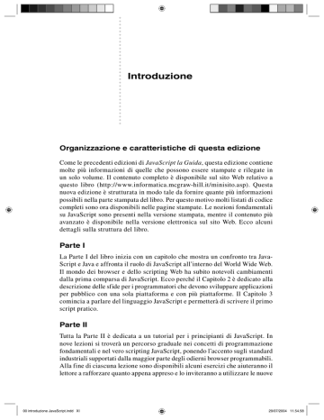 Introduzione Organizzazione e caratteristiche di questa edizione Come le precedenti edizioni di JavaScript la Guida, questa edizione contiene molte più informazioni di quelle che possono essere stampate e rilegate in un solo volume. Il contenuto completo è disponibile sul sito Web relativo a questo libro (http://www.informatica.mcgraw-hill.it/minisito.asp). Questa nuova edizione è strutturata in modo tale da fornire quante più informazioni possibili nella parte stampata del libro. Per questo motivo molti listati di codice completi sono ora disponibili nelle pagine stampate. Le nozioni fondamentali su JavaScript sono presenti nella versione stampata, mentre il contenuto più avanzato è disponibile nella versione elettronica sul sito Web. Ecco alcuni dettagli sulla struttura del libro. Parte I La Parte I del libro inizia con un capitolo che mostra un confronto tra JavaScript e Java e affronta il ruolo di JavaScript all’interno del World Wide Web. Il mondo dei browser e dello scripting Web ha subito notevoli cambiamenti dalla prima comparsa di JavaScript. Ecco perché il Capitolo 2 è dedicato alla descrizione delle sfide per i programmatori che devono sviluppare applicazioni per pubblico con una sola piattaforma e con più piattaforme. Il Capitolo 3 comincia a parlare del linguaggio JavaScript e permetterà di scrivere il primo script pratico. Parte II Tutta la Parte II è dedicata a un tutorial per i principianti di JavaScript. In nove lezioni si troverà un percorso graduale nei concetti di programmazione fondamentali e nel vero scripting JavaScript, ponendo l’accento sugli standard industriali supportati dalla maggior parte degli odierni browser programmabili. Alla fine di ciascuna lezione sono disponibili alcuni esercizi che aiuteranno il lettore a rafforzare quanto appena appreso e lo inviteranno a utilizzare le nuove 00 introduzione JavaScript.indd XI 29/07/2004 11.54.58 XII INTRODUZIONE conoscenze (le soluzioni degli esercizi sono nell’appendice, disponibile sul Minisito). L’obiettivo del tutorial è fornire sufficiente esperienza per cominciare a scrivere semplici pagine facilitando la comprensione delle discussioni e degli esempi discussi nella parte restante del libro. Alla fine dell’ultima lezione i lettori sapranno programmare l’effetto di scambio delle immagini di rollover, oggi così popolare in moltissime pagine Web, e saranno in grado di modificare il contenuto di una pagina Web in modo dinamico. Parte III La Parte III fornisce una descrizione dettagliata dei modelli di oggetti del documento implementati dai browser odierni. In tutti i capitoli un diagramma di compatibilità indica i browser che supportano ogni oggetto e le sue caratteristiche. Un capitolo in particolare, il Capitolo 15, contiene materiale di riferimento condiviso dalla maggior parte dei restanti capitoli della Parte III. Parte IV Le informazioni sul linguaggio JavaScript fondamentale si trovano nella Parte IV. Come per i riferimenti della Parte III, i capitoli su JavaScript mostrano i diagrammi di compatibilità per ciascun termine del linguaggio JavaScript. Parte V Numerose appendici forniscono utili informazioni di riferimento. Queste risorse comprendo un riferimento rapido agli oggetti JavaScript e dei browser, un elenco delle parole riservate per JavaScript, le risposte agli esercizi dei tutorial della Parte II e infine le risorse su Internet. Questa parte la troverete sul Minisito all’indirizzo: http://www.informatica.mcgraw-hill.it/minisito.asp. Prerequisiti per l’apprendimento di JavaScript Sebbene questo libro non richieda al lettore grande esperienza di programmazione, più pagine Web sono state create con HTML, più facile sarà comprendere l’interazione di JavaScript con gli elementi che normalmente si inseriscono nella pagina. A volte è necessario modificare i tag HTML per trarre vantaggio dallo scripting. Se si conoscono già i tag, JavaScript sarà più facile da imparare. I moduli e i loro elementi (campi di testo, pulsanti ed elenchi di selezione) giocano un ruolo particolarmente importante nella maggior parte del lavoro tipico di JavaScript. Si dovrebbe avere familiarità con tali elementi e i loro attributi HTML. Fortunatamente non è necessario conoscere lo scripting lato server o il passaggio di informazioni da un modulo a un server; l’attenzione qui è sullo scripting lato client, che lavora indipendentemente dal server, dopo che 00 introduzione JavaScript.indd XII 29/07/2004 11.55.02 INTRODUZIONE XIII la pagina contenente JavaScript è stata completamente caricata nel browser. Il vocabolario fondamentale dello standard HTML corrente dovrebbe far parte delle proprie conoscenze. È inoltre opportuno conoscere alcuni degli standard di markup dei documenti più recenti, come XHTML e CSS (Cascading Style Sheets). Non serve comunque essere degli esperti: le ricerche sul Web relative a questi termini riveleranno numerosi tutorial sull’argomento. Se non si è mai programmato prima Per chi ha imparato HTML su un piccolo libro anni fa, le dimensioni di questo libro possono spaventare. JavaScript può non essere il linguaggio più semplice del mondo, ma è ben lontano da un linguaggio di programmazione completo, come Java o C. JavaScript permette di sperimentare ottenendo grandi risultati anche da poche righe di codice, senza realizzare applicazioni complete (come i programmi che si acquistano). L’interprete JavaScript incorporato in tutti i browser compatibili con gli script fa molto lavoro per il programmatore. La programmazione, al livello più elementare, non consiste in niente di più che scrivere una serie di istruzioni che il computer deve seguire. Gli umani seguono istruzioni in tutti i momenti, anche se non se ne rendono conto. Il viaggio verso la casa di un amico è una sequenza di piccole istruzioni: tre isolati in quella direzione, girare a sinistra qui, girare a destra lì. Fra tali istruzioni ci sono alcune decisioni da prendere: se il semaforo è ross