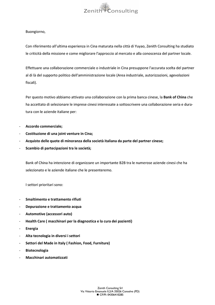 Buongiorno, Con riferimento all’ultima esperienza in Cina maturata nella città di Yuyao, Zenith Consulting ha studiato le criticità della missione e come migliorare l'approccio al mercato e alla conoscenza del partner locale. Effettuare una collaborazione commerciale o industriale in Cina presuppone l'accurata scelta del partner al di là del supporto politico dell'amministrazione locale (Area industriale, autorizzazioni, agevolazioni fiscali). Per questo motivo abbiamo attivato una collaborazione con la prima banca cinese, la Bank of China che ha accettato di selezionare le imprese cinesi interessate a sottoscrivere una collaborazione seria e duratura con le aziende italiane per: - Accordo commerciale; - Costituzione di una joint venture in Cina; - Acquisto delle quote di minoranza della società italiana da parte del partner cinese; - Scambio di partecipazioni tra le società; Bank of China ha intenzione di organizzare un importante B2B tra le numerose aziende cinesi che ha selezionato e le aziende italiane che le presenteremo. I settori prioritari sono: - Smaltimento e trattamento rifiuti - Depurazione e trattamento acqua - Automotive (accessori auto) - Health Care ( macchinari per la diagnostica e la cura dei pazienti) - Energia - Alta tecnologia in diversi i settori - Settori del Made in Italy ( Fashion, Food, Furniture) - Biotecnologia - Macchinari automatizzati Zenith Consulting Srl Via Vittorio Emanuele II,2/A 35026 Conselve (PD) CF/PI: 04306410285 Il modus operandi sarà il seguente: • Presentazione del company profile in italiano ed inglese; • Attivazione di B2B preventivi tra le aziende presso Bank of China nella sede di Roma e di Milano; • Organizzazione di un work show a Roma tra le aziende per la sottoscrizione di MoU o Loi; • Incontri nelle sedi produttive in Italia ed in Cina. Bank of China vi aiuterà nel progetto di internazionalizzazione, identificando il partner cinese, verificando la possibilità di finanziare il progetto e supportando l'attivazione degli accordi sottoscritti con le autorità locali. Restiamo a vostra disposizione per chiarimenti in merito alla presente. Cordiali saluti Zenith Consulting Srl Via Vittorio Emanuele II,2/A 35026 Conselve (PD) CF/PI: 04306410285