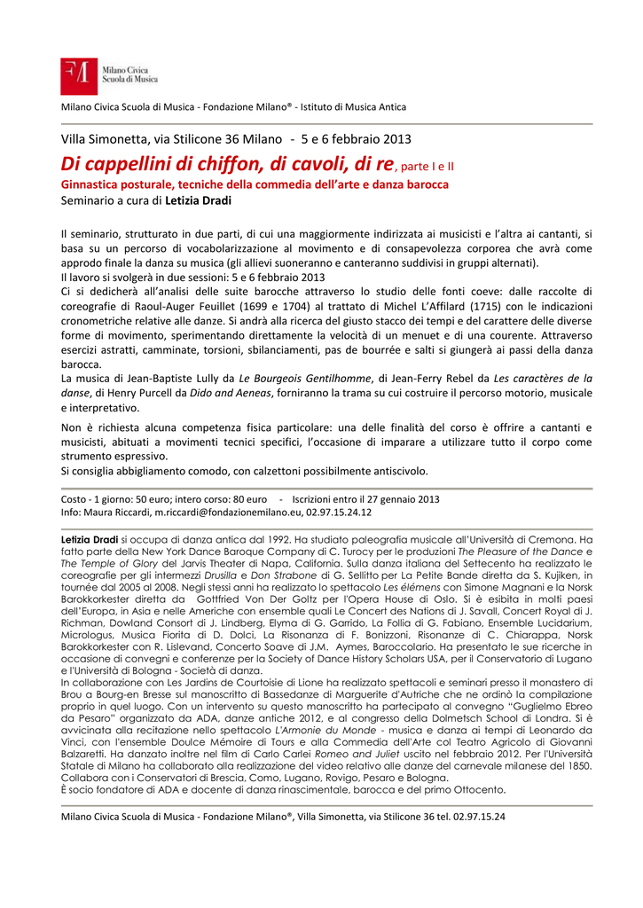 Milano Civica Scuola di Musica - Fondazione Milano® - Istituto di Musica Antica Villa Simonetta, via Stilicone 36 Milano - 5 e 6 febbraio 2013 Di cappellini di chiffon, di cavoli, di re, parte I e II Ginnastica posturale, tecniche della commedia dell’arte e danza barocca Seminario a cura di Letizia Dradi Il seminario, strutturato in due parti, di cui una maggiormente indirizzata ai musicisti e l’altra ai cantanti, si basa su un percorso di vocabolarizzazione al movimento e di consapevolezza corporea che avrà come approdo finale la danza su musica (gli allievi suoneranno e canteranno suddivisi in gruppi alternati). Il lavoro si svolgerà in due sessioni: 5 e 6 febbraio 2013 Ci si dedicherà all’analisi delle suite barocche attraverso lo studio delle fonti coeve: dalle raccolte di coreografie di Raoul-Auger Feuillet (1699 e 1704) al trattato di Michel L’Affilard (1715) con le indicazioni cronometriche relative alle danze. Si andrà alla ricerca del giusto stacco dei tempi e del carattere delle diverse forme di movimento, sperimentando direttamente la velocità di un menuet e di una courente. Attraverso esercizi astratti, camminate, torsioni, sbilanciamenti, pas de bourrée e salti si giungerà ai passi della danza barocca. La musica di Jean-Baptiste Lully da Le Bourgeois Gentilhomme, di Jean-Ferry Rebel da Les caractères de la danse, di Henry Purcell da Dido and Aeneas, forniranno la trama su cui costruire il percorso motorio, musicale e interpretativo. Non è richiesta alcuna competenza fisica particolare: una delle finalità del corso è offrire a cantanti e musicisti, abituati a movimenti tecnici specifici, l’occasione di imparare a utilizzare tutto il corpo come strumento espressivo. Si consiglia abbigliamento comodo, con calzettoni possibilmente antiscivolo. Costo - 1 giorno: 50 euro; intero corso: 80 euro - Iscrizioni entro il 27 gennaio 2013 Info: Maura Riccardi, [email protected], 02.97.15.24.12 Letizia Dradi si occupa di danza antica dal 1992. Ha studiato paleografia musicale all’Università di Cremona. Ha fatto parte della New York Dance Baroque Company di C. Turocy per le produzioni The Pleasure of the Dance e The Temple of Glory del Jarvis Theater di Napa, California. Sulla danza italiana del Settecento ha realizzato le coreografie per gli intermezzi Drusilla e Don Strabone di G. Sellitto per La Petite Bande diretta da S. Kujiken, in tournée dal 2005 al 2008. Negli stessi anni ha realizzato lo spettacolo Les élémens con Simone Magnani e la Norsk Barokkorkester diretta da Gottfried Von Der Goltz per l'Opera House di Oslo. Si è esibita in molti paesi dell’Europa, in Asia e nelle Americhe con ensemble quali Le Concert des Nations di J. Savall, Concert Royal di J. Richman, Dowland Consort di J. Lindberg, Elyma di G. Garrido, La Follia di G. Fabiano, Ensemble Lucidarium, Micrologus, Musica Fiorita di D. Dolci, La Risonanza di F. Bonizzoni, Risonanze di C. Chiarappa, Norsk Barokkorkester con R. Lislevand, Concerto Soave di J.M. Aymes, Baroccolario. Ha presentato le sue ricerche in occasione di convegni e conferenze per la Society of Dance History Scholars USA, per il Conservatorio di Lugano e l'Università di Bologna - Società di danza. In collaborazione con Les Jardins de Courtoisie di Lione ha realizzato spettacoli e seminari presso il monastero di Brou a Bourg-en Bresse sul manoscritto di Bassedanze di Marguerite d'Autriche che ne ordinò la compilazione proprio in quel luogo. Con un intervento su questo manoscritto ha partecipato al convegno “Guglielmo Ebreo da Pesaro” organizzato da ADA, danze antiche 2012, e al congresso della Dolmetsch School di Londra. Si è avvicinata alla recitazione nello spettacolo L'Armonie du Monde - musica e danza ai tempi di Leonardo da Vinci, con l'ensemble Doulce Mémoire di Tours e alla Commedia dell'Arte col Teatro Agricolo di Giovanni Balzaretti. Ha danzato inoltre nel film di Carlo Carlei Romeo and Juliet uscito nel febbraio 2012. Per l'Università Statale di Milano ha collaborato alla realizzazione del video relativo alle danze del carnevale milanese del 1850. Collabora con i Conservatori di Brescia, Como, Lugano, Rovigo, Pesaro e Bologna. È socio fondatore di ADA e docente di danza rinascimentale, barocca e del primo Ottocento. Milano Civica Scuola di Musica - Fondazione Milano®, Villa Simonetta, via Stilicone 36 tel. 02.97.15.24