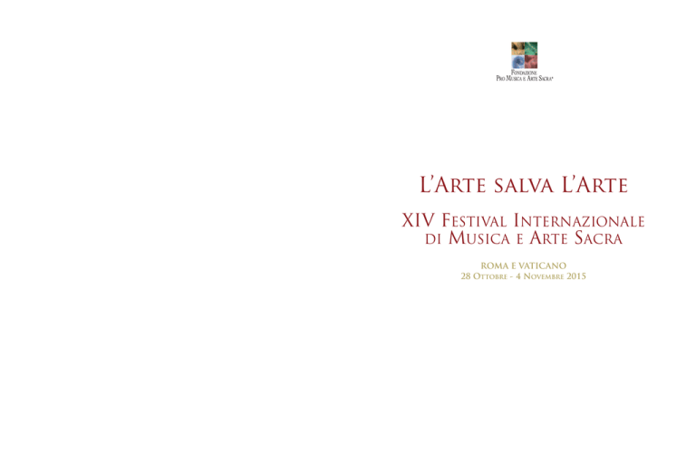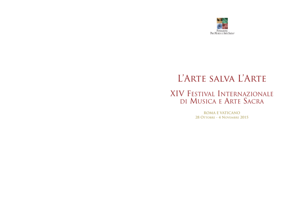 L’Arte salva L’Arte XIV FESTIVAL INTERNAZIONALE DI MUSICA E ARTE SACRA ROMA E VATICANO 28 OTTOBRE - 4 NOVEMBRE 2015 GLI ENTI PATROCINANTI LA FONDAZIONE PRO MUSICA CON IL PREMIO DI RAPPRESENTANZA DEL PRESIDENTE DELLA REPUBBLICA ORGANI ISTITUZIONALI FONDATORE E PRESIDENTE GENERALE Sen. Dr. h.c. mult. Hans-Albert Courtial Medaglia di rappresentanza del Presidente della Repubblica E ARTE SACRA per la Tutela dei Monumenti Storici ed Artistici della Santa Sede Cavaliere di Gran Croce OMRI Premio “Fondazione Pro Musica e Arte Sacra” 2006 Ambasciatore di Roma nel Mondo Sua Em.za Rev.ma Francesco Cardinal Monterisi CONSIGLIO DIRETTIVO di San Paolo fuori le Mura, Roma Arciprete emerito della Basilica Papale Sen. Dr. h.c. mult. Hans-Albert Courtial Sua Em.za Rev.ma Paul Cardinal Poupard Mons. Pablo Colino Presidente emerito del Pontificio Consiglio della Cultura Mons. Valentino Miserachs Grau M° Mons. Prof. Dr. Georg Ratzinger Nicole Anneliese Courtial, M.A. Protonotario Apostolico e Maestro di Cappella emerito PRESIDENTE ONORARIO Sua Em.za Rev.ma Gianfranco Cardinal Ravasi Premio “Fondazione Pro Musica e Arte Sacra” 2010 Sua Em.za Rev.ma Angelo Cardinal Comastri Presidente del Pontificio Consiglio della Cultura Arciprete della Basilica Papale di San Pietro in Vaticano, Sua Em.za Rev.ma Camillo Cardinal Ruini Vicario Generale di Sua Santità per la Città del Vaticano, Vicario Generale emerito di Sua Santità Presidente della Fabbrica di San Pietro per la Diocesi di Roma COMITATO Arcivescovo Prelato della Santa Casa di Loreto Sua Ecc.za Rev.ma Mons. Giovanni Tonucci e con il Patrocinio del Senato della Repubblica della Camera dei Deputati del Ministero dei Beni e delle Attività Culturali e del Turismo del Fondo Edificio di Culto, Ministero dell’Interno della Città Metropolitana di Roma Capitale di Roma Capitale della Camera di Commercio Roma dell’ENIT – Ente Nazionale Italiano per il Turismo 2 D’ONORE Sua Em.za Rev.ma Cardinal Santos Abril y Castelló Sua Em.za Rev.ma Agostino Cardinal Vallini Arciprete della Basilica Papale di Santa Maria Maggiore Vicario Generale di Sua Santità per la Diocesi di Roma Sua Em.za Rev.ma Card. Domenico Bartolucci e Arciprete della Basilica Papale di San Giovanni (Borgo S. Lorenzo, 7 mag. 1917 - Roma, 11 nov. 2013) in Laterano, Roma Maestro perpetuo della Cappella Musicale Pontificia “Sistina” Prof. Dr. Dr. Sen. h.c. Herbert Batliner Premio “Fondazione Pro Musica e Arte Sacra” 2010 Cavaliere di Gran Croce con Diamanti Sua Em.za Rev.ma Andrea Cardinal Cordero Lanza del Principato del Liechtenstein di Montezemolo Premio “Fondazione Pro Musica e Arte Sacra” 2014 Arciprete emerito della Basilica Papale Ralph Dommermuth di San Paolo fuori le Mura, Roma Sen. Dott.ssa Mariapia Garavaglia Sua Em.za Rev.ma Timothy Cardinal Dolan Premio “Fondazione Pro Musica e Arte Sacra” 2008 Arcivescovo di New York Prof. Nikolaus Harnoncourt Direttore d’Orchestra Sua Em.za Rev.ma James Michael Cardinal Harvey Premio “Fondazione Pro Musica e Arte Sacra” 2014 Arciprete della Basilica Papale Prof. Dr. Clemens Hellsberg di San Paolo fuori le Mura, Roma Premio “Fondazione Pro Musica e Arte Sacra” 2010 Sua Em.za Rev.ma Bernard Cardinal Francis Law Dott. Gianni Letta Arciprete emerito della Basilica Papale Premio “Fondazione Pro Musica e Arte Sacra” 2004 di Santa Maria Maggiore, Roma Ing. Wolfgang D. Schrempp Sua Em.za Rev.ma William Joseph Cardinal Levada Richard de Tscharner Prefetto emerito della Congregazione Premio “Fondazione Pro Musica e Arte Sacra” 2008 per la Dottrina della Fede Dr. h.c. Hans Urrigshardt Sua Em.za Rev.ma Card. Francesco Marchisano Premio “Fondazione Pro Musica e Arte Sacra” 2010 (Racconigi, 25 giugno 1929 – Roma, 27 luglio 2014) Franz Welser-Möst Presidente emerito della Commissione Permanente Direttore d’Orchestra 3 LA FONDAZIONE PRO MUSICA COMITATO ARTISTICO E ARTE SACRA COMITATO DEI SOSTENITORI M° Mons. Pablo Colino Dott.ssa Claudia Autieri, Presidente Maestro di Cappella emerito e Prefetto per la Musica S.A.S. Principessa Marie von und zu Liechtenstein della Basilica Papale di San Pietro in Vaticano Wiener Philharmoniker, Vienna Premio “Fondazione Pro Musica e Arte Sacra” 2014 Pontificio Istituto di Musica Sacra, Città del Vaticano M° Prof. Janos Czifra Associazione Amici della Fondazione Pro Musica Maestro di Cappella al Duomo di Salisburgo e Arte Sacra, Roma M° Prof. Dr. Clemens Hellsberg Förderverein der Freunde der Fondazione Pro Musica Presidente emerito dei Wiener Philharmoniker e Arte Sacra e.V., Germania M° Prof. Eberhard Metternich Courtial International srl, Roma Maestro di Cappella al Duomo di Colonia M° Mons. Valentino Miserachs Grau Preside emerito del Pontificio Istituto di Musica Sacra REVISORI CONTABILI M° James O’Donnell Dr. Demetrio Minuto, Presidente Organista e Maestro di Cappella della Westminster Abbey Dr. Carlo Bardanzellu, Revisore effettivo M° Don Massimo Palombella, SDB Dr. Valter Sebastianelli, Revisore effettivo Maestro Direttore della Cappella Musicale Pontificia Dr. Giorgio Peraldo Matton, Revisore supplente “Sistina” Dr. Silvio Paolo Magnanego, Revisore supplente ORGANIGRAMMA DEL XIV FESTIVAL INTERNAZIONALE DI MUSICA E ARTE SACRA Fondatore, Presidente Generale e legale rappresentante Sen. Dr. h.c. mult. Hans-Albert Courtial Presidente del Festival 2015 Dott.ssa Claudia Autieri Segreteria Dott.ssa Elena Regina Brandstetter PREFAZIONE DEL PRESIDENTE ONORARIO Q uest’anno il Festival Internazionale di Musica e Arte Sacra è dedicato a San Giovanni Paolo II. Permettetemi di aprire il cuore e di confidarvi alcuni ricordi che lo riguardano. Il 1° aprile 2005, vigilia della santa morte di Giovanni Paolo II, mi trovavo nel mio nuovo ufficio presso la basilica di San Pietro, dove Giovanni Paolo II mi aveva chiamato il 5 febbraio di quell’anno. Squilla il telefono. Alzo la cornetta e riconosco immediatamente la voce di S.E. Monsignor Stanislaw Dziwisz, segreta