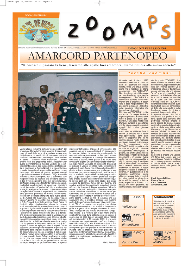 layout2.qxp 14/02/2005 19.30 Pagina 1 www.itcdenicola.it Periodico a cura della redazione scolastica dell’ITC Enrico De Nicola, Via E.a. Mario - Napoli. e-mail: [email protected] ANNO I N°2 FEBBRAIO 2005 AMARCORD PARTENOPEO "Ricordare il passato fa bene, lasciamo alle spalle luci ed ombre, diamo fiducia alla nuova società" Perchè Carlo Iuliano: lo hanno definito "uomo ombra" del presidente Corrado Ferlaino, quando il Napoli calcava gli stadi della serie A, e portava a casa scudetti e coppe. In verità i trionfi non sono stati mai tantissimi ma bastavano, comunque, per mandare in estasi i fantastici tifosi napoletani. L'"uomo ombra" fino alla presidenza Naldi, passando per quella dell'imprenditore Giorgio Corbelli, si è contraddistinto sempre per la sua grande professionalità e dedizione al Calcio Napoli e in special modo quando, in qualità di responsabile dell'area comunicazione. si trattava di gestire i rapporti con gli organi d'informazione di un certo Diego Armando Maradona. Per Iuliano però, non ci sono stati solo magici successi da riportare alle cronache sportive; a dire il vero negli ultimi anni, nel libro della storia del Napoli, si sono riportate tante vicende negative, molteplici cambiamenti di panchina, campioni ceduti in cambio di "poche lire", tifo e società allo sbaraglio, e si potrebbe ancora continuare ad elencare perché di disfatte il Napoli ed il suo pazientissimo pubblico, purtroppo ne hanno vissute tante. Iuliano non è entrato a far parte della nuova società di Aurelio De Laurentiis, la neonata "Napoli Soccer", poiché ha lasciato il suo incarico assieme al D.S. Perinetti durante la gestione Naldi. Prima di dar inizio all'incontro-intervista, Iuliano, ha premesso di esser disponibile a voler discutere non solo di argomenti riguardanti il Napoli, ma di voler parlare anche di problemi inerenti al rapporto esistente tra i giovani ed il calcio nella nostra città, o di tematiche più generali quali ad esempio la violenza negli stadi. La curiosità degli interessati. calorosi ed affezionati tifosi napoletan-denicoliani, cade, però, inevitabilmente, sull'ultima tribolata avventura, quella che ha portato al fallimento della vecchia S.S.C. Napoli. Iuliano ha spiegato che il Napoli Calcio costituiva una delle poche eccezioni in positivo nel panorama delle imprese napoletane, anche avendo accumulato un ingente quantità di debiti; quest'ultimo motivo frenava imprenditori e partnership, che, pur avendo fiutato l'affare, a rilevare la società. La città, comunque, con tutte le problematiche che le fanno da contorno, rappresentava e rappresenta pur sempre un proficuo business; in special modo per l'affezione, eroica ed onnipresente, alla squadra che porta in uno stadio di C1 sessantamila persone. Iuliano ha rimarcato quest'aspetto da non sottovalutare in quanto è un fenomeno ancora eccezionale, se si pensa al nuovo problema comune a tutte le società, delle "pay tv" e tra un po' della rivoluzione digitale (ma anche l'acquisto della visione degli incontri via web). In molte città d'Italia già si iniziano a vedere gli stadi vuoti, preferendo la poltrona di casa. Forse non solo perché le partite in diretta arrivano a casa nostra, ma anche per la violenza sempre crescente negli stadi, qualche teppista da stadio forse potrebbe fornirci spiegazioni in più. La gente di Napoli, invece, preferisce assaporare ancora il gusto di ascoltare un boato in seguito ad un goal con i piedi nello stadio. Era quasi scontata la domanda, forse non per Iuliano, che sembra visibilmente emozionato quando gli giunge all'orecchio il nome di Diego Maradona: "Grande uomo- ha risposto a chi gli ha chiesto cosa ne pensasse dell'uomo Maradona- un amico ideale per tutti coloro che gli stavano accanto. Ricordo che a volte prima di scendere in campo faceva delle iniezioni perché soffriva di mal di schiena, ma poi sapevamo che ci avrebbe deliziato con qualche perla delle sue". Ammette di esser stato molto legato al "Pibe", e ricorda che mentre i napoletani aspettano un suo ritorno ed in città si rievocano le gioie e le gesta di un tempo, attraverso il museo "M10" inaugurato alla Mostra d'Oltremare, "Diego dice Iuliano - si è rovinato con le sue mani, ora sta combattendo una dura battaglia con se stesso, e spero che ne esca bene". Si passa poi al ricordo più emozionante:" il 10 maggio 1987, è una data storica per me. - aggiunge poi - però non disdegno neanche la vittoria in Uefa a Stoccarda, dove lo stadio sembrava il San Paolo, tutto azzurro!". Lasciato alle spalle il passato glorioso e la sua carriera, ha invitato tutti a credere nell'ardito progetto De Laurentiis di ritornare innanzitutto in A, e poi, magari in uno scenario addirittura europeo, che la città in primis e la società poi, meritano per gli sforzi che stanno facendo. Mario Assante Quando nel lontano 1997 dovemmo decidere il nome da dare al giornale del nostro Istituto, dopo una breve discussione tra i redattori di allora, decidemmo per "ZOOMPS". Non ricordiamo più chi lo propose, ma ricordiamo bene perché lo scegliemmo. "ZOOMPS" è la curiosità di scrutare la vita ed il mondo che ci circonda, di osservare le cose nei particolare, proprio come fa lo zoom , l'obiettivo della macchina fotografica che ingrandisce gli oggetti. Ma il termine "ZOOMPS" richiama anche 'o zumpo, il salto, in lingua napoletana. È quindi sinonimo di gioco. E il gioco, per i bambini, è una cosa molto seria. Dunque: curiosità e approfondimento, gioco e serietà: questi gli aspetti del nostro giornale d'Istituto. Certo che ne abbiamo fatta di strada! Le difficoltà non ci hanno mai spaventato; sono state tante, e sappiamo che ce ne saranno ancora molte, ma basta un piccolo "zumpo" e sicuramente le supereremo tutte. ZOOMPS, infatti, per noi è anche tenacia, è voglia di continuare un'esperienza meravigliosa e, perché, no, anche utile a noi e a chi ci legge. Il nostro giornale, da quest'anno , in questa nuova veste, ha una responsabilità in più, in qu