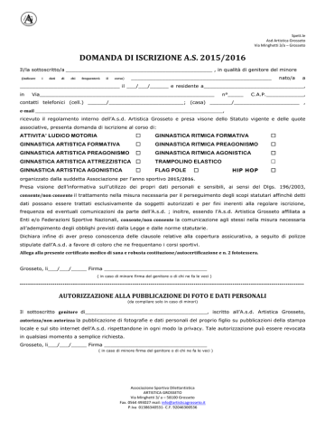 Spett.le Asd Artistica Grosseto Via Minghetti 3/a – Grosseto DOMANDA DI ISCRIZIONE A.S. 2015/2016 Il/la sottoscritto/a _______________________________________________ , in qualità di genitore del minore (indicare i dati di chi frequenterà il _____________________________________________ corso) nato/a a ________________________________ il ___/___/______ e residente a________________________________, in Via________________________________________________________ n°_____ C.A.P.____________, contatti telefonici (cell.) ______/________________________; (casa) _______/_____________________ , e-‐mail ____________________________________________________________, ricevuto il regolamento interno dell’A.s.d. Artistica Grosseto e presa visone dello Statuto vigente e delle quote associative, presenta domanda di iscrizione al corso di: ATTIVITA’ LUDICO MOTORIA £ GINNASTICA RITMICA FORMATIVA £ GINNASTICA ARTISTICA FORMATIVA £ GINNASTICA RITMICA PREAGONISMO £ GINNASTICA ARTISTICA PREAGONISMO £ GINNASTICA RITMICA AGONISTICA £ GINNASTICA ARTISTICA ATTREZZISTICA £ TRAMPOLINO ELASTICO £ GINNASTICA ARTISTICA AGONISTICA FLAG POLE £ £ HIP HOP £ organizzato dalla suddetta Associazione per l’anno sportivo 2015/2016. Presa visione dell’informativa sull’utilizzo dei propri dati personali e sensibili, ai sensi del Dlgs. 196/2003, consente/non consente il trattamento nella misura necessaria per il perseguimento degli scopi statutari affinchè detti dati possano essere trattati esclusivamente da soggetti autorizzati e per fini inerenti alla regolare iscrizione, frequenza ed eventuali comunicazioni da parte dell’A.s.d. ; inoltre, essendo l’A.s.d. Artistica Grosseto affiliata a Enti e/o Federazioni Sportive Nazionali, consente/non consente la comunicazione agli stessi nella misura necessaria all’adempimento degli obblighi previsti dalla Legge e dalle norme statutarie. Dichiara infine di aver preso conoscenza delle clausole relative alla copertura assicurativa, a seguito di polizze stipulate dall’A.s.d. a favore di coloro che ne frequentano i corsi sportivi. Allega alla presente certificato medico di sana e robusta costituzione/autocertificazione e n. 2 fototessera. Grosseto, li___/___/_____ Firma _________________________________ ( in caso di minore firma del genitore o di chi ne fa le veci ) ------------------------------------------------------------------------------------------------------------------------------------------ AUTORIZZAZIONE ALLA PUBBLICAZIONE DI FOTO E DATI PERSONALI (da compilare solo in caso di minori) Il sottoscritto genitore di_______________________________________, iscritto all’A.s.d. Artistica Grosseto, autorizza/non autorizza la pubblicazione di fotografie e dati personali del proprio figlio su pubblicazioni della stampa locale e sul sito internet dell’A.s.d. rispettandone in ogni modo la privacy. Tale autorizzazione può essere revocata in qualsiasi momento a semplice richiesta. Grosseto, li___/___/_____ Firma _________________________________ ( in caso di minore firma del genitore o di chi ne fa le veci ) Associazione Sportiva Dilettantistica ARTISTICA GROSSETO Via Minghetti 3/ a – 58100 Grosseto Fax. 0564 493027 mail: [email protected] P.Iva 01386340531-‐ C.F. 92046300536 REGOLAMENTO INTERNO Art. 1 – Quote Associative L’importo della quota associativa è fissato annualmente dal Consiglio direttivo dell’Associazione ed avviene contestualmente al pagamento della quota dei corsi. Il pagamento della quota dei corsi annuale può avvenire nelle seguenti modalità: a. in una unica soluzione all’atto dell’iscrizione con sconto del 10 % sull’intera quota esclusivamente per chi paga entro il 30 Ottobre dell’anno in corso; b. in 2 rate da saldare una al momento dell’iscrizione ed una entro il 31 Dicembre dell’anno in corso. La quota annuale dei corsi non comprende il costo del body societario obbligatorio per tutti gli atleti e della tuta societaria (non obbligatoria solo per i corsi di ludico-motoria). Al momento del loro ordine dovrà essere versato una caparra di 10 euro per il body e 20 euro per la tuta. Per la partecipazione alle gare provinciali verrà chiesta l’adesione ai genitori, che, in caso di assenso, saranno tenuti a rispettare l’impegno preso, salvo casi eccezionali., in quanto l’iscrizione a tali competizioni è a carico della società e non rimborsabile in caso di rinuncia. L’iscrizione a gare regionali, nazionali ed internazionali è a carico dei genitori e non è rimborsabile. Art. 2 – Mancata frequenza alle lezioni Non è previsto alcun rimborso delle quote versate per la eventuale mancata frequenza alle lezioni se non per motivi dipendenti dall’Associazione. Il Consiglio direttivo valuterà casi particolari dovuti a gravi e prolungati impedimenti motivati da certificato medico. L’Associazione dovrà essere avvisata nel caso di prolungata assenza dalle lezioni. In caso contrario non sarà presa in esame nessuna richiesta di rimborso. Art. 3 – Assicurazione La quota di iscrizione comprende, fra l'altro, la copertura assicurativa derivante dalla tessera di base Uisp. Eventuali infortuni dovranno essere denunciati, entro 7 giorni dall'evento, all’Assicurazione tramite i nostri uffici o tramite gli uffici Uisp di Grosseto. La convenzione stipulata prevede la possibilità per l’iscritto di integrare, a sue spese, la copertura assicurativa di base. Nei locali della palestra sono affisse tutte le informazioni inerenti la copertura assicurativa, per chiarimenti eventuali rivolgersi in segreteria. Art. 4 – Idoneità Sport Agonistico (Passaporto Sportivo) Sarà cura della Società presentare la richiesta al servizio ASL di Medicina dello Sport., per gli allievi/e dei corsi agonistici, degli accertamenti medico sportivi di idoneità alla pratica sportiva agonistica (Passaporto Sportivo). La visita effettuata dalla Asl è gratuita per gli atleti minorenni. Nel caso in cui la struttura pubblica non garantisca 