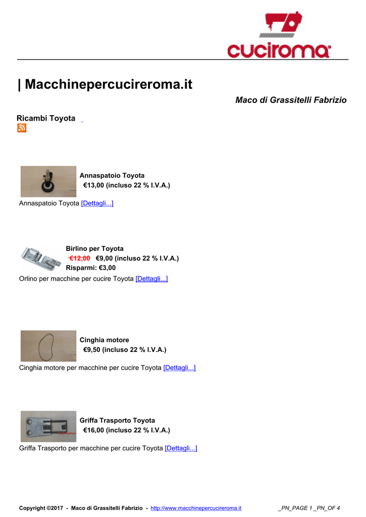 | Macchinepercucireroma.it Maco di Grassitelli Fabrizio Ricambi Toyota Annaspatoio Toyota €13,00 (incluso 22 % I.V.A.) Annaspatoio Toyota [Dettagli...] Birlino per Toyota €12,00 €9,00 (incluso 22 % I.V.A.) Risparmi: €3,00 Orlino per macchine per cucire Toyota [Dettagli...] Cinghia motore €9,50 (incluso 22 % I.V.A.) Cinghia motore per macchine per cucire Toyota [Dettagli...] Griffa Trasporto Toyota €16,00 (incluso 22 % I.V.A.) Griffa Trasporto per macchine per cucire Toyota [Dettagli...] Copyright ©2017 - Maco di Grassitelli Fabrizio - http://www.macchinepercucireroma.it _PN_PAGE 1 _PN_OF 4 Gruppo crochett €25,00 (incluso 22 % I.V.A.) Gruppo completo manda crochett [Dettagli...] Ingranaggio crochett Toyota €15,00 (incluso 22 % I.V.A.) Ingranaggio per macchine per cucire Toyota [Dettagli...] Leva Alzapiedino €8,50 (incluso 22 % I.V.A.) Leva alza piedino [Dettagli...] Manopola Punti Toyota FSL-18 Chiama per il Prezzo Manopola punti per Toyota FSL-18 [Dettagli...] Manopola Punti Toyota FSR 18 Chiama per il Prezzo Manopola Punti per macchine da cucire Toyota mod FSR18 [Dettagli...] Manopola Punti Toyota FSR21 €13,00 (incluso 22 % I.V.A.) Copyright ©2017 - Maco di Grassitelli Fabrizio - http://www.macchinepercucireroma.it _PN_PAGE 2 _PN_OF 4 Manopola punti per macchina da cucire Toyota FSR21 [Dettagli...] Manopola Punti Toyota FSS2 €13,00 (incluso 22 % I.V.A.) Manopola punti per macchina da cucire Toyota FSS2 [Dettagli...] Manopola Punti Toyota FSS224 €13,00 (incluso 22 % I.V.A.) Manopola Punti per macchina da cucire Toyota FSS224 [Dettagli...] Manopola Punti Toyota JFS18 Chiama per il Prezzo Manopola Punti per macchina da cucire Toyota JFS18 sostituita dalla FSR18 [Dettagli...] Pedale Toyota €35,00 (incluso 22 % I.V.A.) Pedale per macchina per cucire Toyota [Dettagli...] Piedino a Rulli per Pelle €10,00 (incluso 22 % I.V.A.) Piedino a rulli per pelle [Dettagli...] Copyright ©2017 - Maco di Grassitelli Fabrizio - http://www.macchinepercucireroma.it _PN_PAGE 3 _PN_OF 4 Placca Ago Toyota €12,00 (incluso 22 % I.V.A.) Placca ago per macchine per cucire Toyota [Dettagli...] Porta crochett €14,00 (incluso 22 % I.V.A.) Porta crochett Toyota [Dettagli...] Portafilo Toyota €3,90 (incluso 22 % I.V.A.) Portafilo per macchine per cucire Toyota [Dettagli...] Reostato Toyota €35,00 (incluso 22 % I.V.A.) Reostato per macchine per cucire Toyota [Dettagli...] • • • • • «« Inizio « Prec 1 Succ » Fine »» Risultati 1 - 19 di 19 Copyright ©2017 - Maco di Grassitelli Fabrizio - http://www.macchinepercucireroma.it _PN_PAGE 4 _PN_OF 4