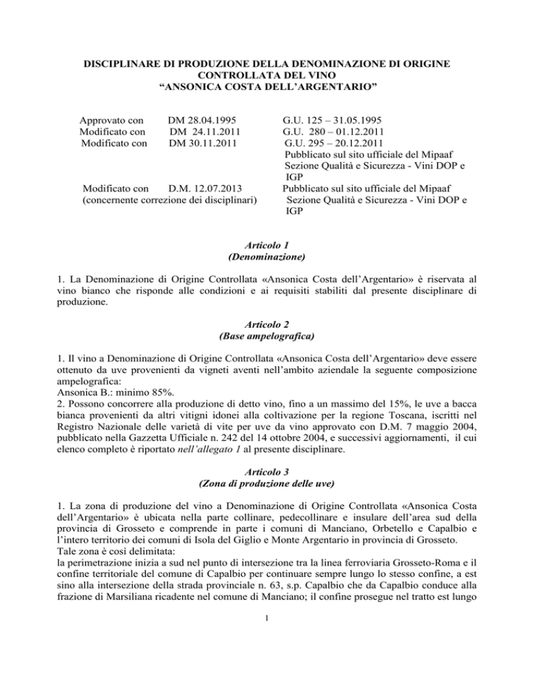 DISCIPLINARE DI PRODUZIONE DELLA DENOMINAZIONE DI ORIGINE CONTROLLATA DEL VINO “ANSONICA COSTA DELL’ARGENTARIO” Approvato con Modificato con Modificato con DM 28.04.1995 DM 24.11.2011 DM 30.11.2011 G.U. 125 – 31.05.1995 G.U. 280 – 01.12.2011 G.U. 295 – 20.12.2011 Pubblicato sul sito ufficiale del Mipaaf Sezione Qualità e Sicurezza - Vini DOP e IGP Pubblicato sul sito ufficiale del Mipaaf Sezione Qualità e Sicurezza - Vini DOP e IGP Modificato con D.M. 12.07.2013 (concernente correzione dei disciplinari) Articolo 1 (Denominazione) 1. La Denominazione di Origine Controllata «Ansonica Costa dell’Argentario» è riservata al vino bianco che risponde alle condizioni e ai requisiti stabiliti dal presente disciplinare di produzione. Articolo 2 (Base ampelografica) 1. Il vino a Denominazione di Origine Controllata «Ansonica Costa dell’Argentario» deve essere ottenuto da uve provenienti da vigneti aventi nell’ambito aziendale la seguente composizione ampelografica: Ansonica B.: minimo 85%. 2. Possono concorrere alla produzione di detto vino, fino a un massimo del 15%, le uve a bacca bianca provenienti da altri vitigni idonei alla coltivazione per la regione Toscana, iscritti nel Registro Nazionale delle varietà di vite per uve da vino approvato con D.M. 7 maggio 2004, pubblicato nella Gazzetta Ufficiale n. 242 del 14 ottobre 2004, e successivi aggiornamenti, il cui elenco completo è riportato nell’allegato 1 al presente disciplinare. Articolo 3 (Zona di produzione delle uve) 1. La zona di produzione del vino a Denominazione di Origine Controllata «Ansonica Costa dell’Argentario» è ubicata nella parte collinare, pedecollinare e insulare dell’area sud della provincia di Grosseto e comprende in parte i comuni di Manciano, Orbetello e Capalbio e l’intero territorio dei comuni di Isola del Giglio e Monte Argentario in provincia di Grosseto. Tale zona è così delimitata: la perimetrazione inizia a sud nel punto di intersezione tra la linea ferroviaria Grosseto-Roma e il confine territoriale del comune di Capalbio per continuare sempre lungo lo stesso confine, a est sino alla intersezione della strada provinciale n. 63, s.p. Capalbio che da Capalbio conduce alla frazione di Marsiliana ricadente nel comune di Manciano; il confine prosegue nel tratto est lungo 1 la strada statale n. 74 (s.s. Maremmana) fino al bivio per Magliano in prossimità della frazione di Marsiliana. Prosegue poi nel tratto nord lungo la strada consorziale delle Pulledraie fino al fosso che la interrompe per poi reimmettersi sulla s.s. 74 al km 8,700 in direzione della frazione di Albinia sino alla intersezione con la linea ferroviaria delle FF.SS. Roma-Grosseto. Da tale punto, nel tratto ovest, il confine prosegue lungo la linea ferroviaria suddetta, in direzione sud, sino a incontrare il punto di partenza. La zona di produzione comprende altresì i comuni di Monte Argentario e dell’Isola del Giglio. Articolo 4 (Norme per la viticoltura) 1. Le condizioni ambientali e colturali dei vigneti destinati alla produzione del vino a Denominazione di Origine Controllata «Ansonica Costa dell’Argentario» devono essere quelle tradizionali della zona e, comunque, atte a conferire alle uve e ai vini derivati le specifiche caratteristiche di qualità. 2. I sesti di impianto, le forme di allevamento e i sistemi di potatura devono essere quelli generalmente usati nella zona o comunque atti a non modificare le caratteristiche delle uve e del vino. 3. È escluso l’allevamento espanso su tetto orizzontale. 4. I nuovi impianti e i reimpianti devono prevedere un minimo di 3.300 ceppi per ettaro e la produzione massima per ceppo non deve superare mediamente i kg 3,5. 5. È vietata ogni pratica di forzatura. È consentita l’irrigazione di soccorso. 6. La quantità massima di uva ammessa per la produzione del vino a Denominazione di Origine Controllata «Ansonica Costa dell’Argentario» non deve superare tonnellate 11 per ettaro di vigneto in coltura specializzata. 7. A detto limite, anche in annate eccezionalmente favorevoli, le produzioni dovranno essere riportate attraverso una accurata cernita delle uve, purchè la produzione per ettaro non superi del 20% il limite medesimo. Qualora la produzione superi il 20% delle suddette quantità, il vino ottenuto non avrà diritto alla denominazione di origine controllata. 8. Fermo restando il limite massimo sopra indicato, la resa per ettaro di vigneto a coltura promiscua deve essere calcolata in rapporto alla effettiva superficie coperta dalle viti. 9. La Regione Toscana, con proprio decreto, su proposta del Consorzio di Tutela, sentite le organizzazioni di categoria interessate, di anno in anno, prima della vendemmia, tenuto conto delle condizioni ambientali e di coltivazione, può stabilire un limite massimo di produzione rivendicabile di uva per ettaro inferiore a quello fissato dal presente disciplinare di produzione, dandone immediata comunicazione al competente Organismo di controllo. 10. La resa massima delle uve in vino non deve essere superiore al 70%. 11. Le uve destinate alla vinificazione devono assicurare al vino a Denominazione di Origine Controllata «Ansonica Costa dell’Argentario» un titolo alcolometrico volumico naturale minimo di 10,50% vol. Articolo 5 (Norme per la vinificazione) 1. Nella vinificazione sono ammesse soltanto le pratiche enologiche locali, leali e costanti atte a conferire al vino a Denominazione di Origine Controllata «Ansonica Costa dell’Argentario» le sue peculiari caratteristiche. 2 2. La vinificazione delle uve per la produzione del vino a Denominazione di Origine Controllata «Ansonica Costa dell’Argentario» deve essere effettuata nell’ambito dell’intero territorio dei comuni di cui al precedente art. 3. 3. Tuttavia, tenuto conto delle situazioni tradizionali di produzione il Ministero delle politiche agricole alimentari e forestali, può consentire su apposita domanda delle ditte interessate che le suddette 