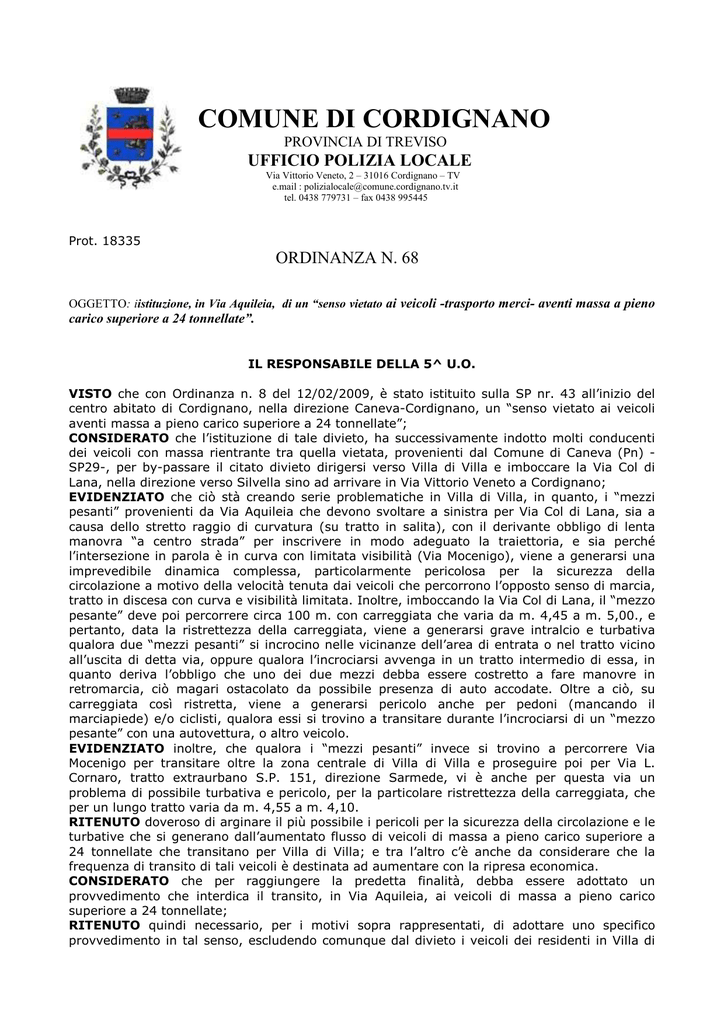 COMUNE DI CORDIGNANO PROVINCIA DI TREVISO UFFICIO POLIZIA LOCALE Via Vittorio Veneto, 2 – 31016 Cordignano – TV e.mail : [email protected] tel. 0438 779731 – fax 0438 995445 Prot. 18335 ORDINANZA N. 68 OGGETTO: iistituzione, in Via Aquileia, di un “senso vietato ai veicoli -trasporto merci- aventi massa a pieno carico superiore a 24 tonnellate”. IL RESPONSABILE DELLA 5^ U.O. VISTO che con Ordinanza n. 8 del 12/02/2009, è stato istituito sulla SP nr. 43 all’inizio del centro abitato di Cordignano, nella direzione Caneva-Cordignano, un “senso vietato ai veicoli aventi massa a pieno carico superiore a 24 tonnellate”; CONSIDERATO che l’istituzione di tale divieto, ha successivamente indotto molti conducenti dei veicoli con massa rientrante tra quella vietata, provenienti dal Comune di Caneva (Pn) SP29-, per by-passare il citato divieto dirigersi verso Villa di Villa e imboccare la Via Col di Lana, nella direzione verso Silvella sino ad arrivare in Via Vittorio Veneto a Cordignano; EVIDENZIATO che ciò stà creando serie problematiche in Villa di Villa, in quanto, i “mezzi pesanti” provenienti da Via Aquileia che devono svoltare a sinistra per Via Col di Lana, sia a causa dello stretto raggio di curvatura (su tratto in salita), con il derivante obbligo di lenta manovra “a centro strada” per inscrivere in modo adeguato la traiettoria, e sia perché l’intersezione in parola è in curva con limitata visibilità (Via Mocenigo), viene a generarsi una imprevedibile dinamica complessa, particolarmente pericolosa per la sicurezza della circolazione a motivo della velocità tenuta dai veicoli che percorrono l’opposto senso di marcia, tratto in discesa con curva e visibilità limitata. Inoltre, imboccando la Via Col di Lana, il “mezzo pesante” deve poi percorrere circa 100 m. con carreggiata che varia da m. 4,45 a m. 5,00., e pertanto, data la ristrettezza della carreggiata, viene a generarsi grave intralcio e turbativa qualora due “mezzi pesanti” si incrocino nelle vicinanze dell’area di entrata o nel tratto vicino all’uscita di detta via, oppure qualora l’incrociarsi avvenga in un tratto intermedio di essa, in quanto deriva l’obbligo che uno dei due mezzi debba essere costretto a fare manovre in retromarcia, ciò magari ostacolato da possibile presenza di auto accodate. Oltre a ciò, su carreggiata così ristretta, viene a generarsi pericolo anche per pedoni (mancando il marciapiede) e/o ciclisti, qualora essi si trovino a transitare durante l’incrociarsi di un “mezzo pesante” con una autovettura, o altro veicolo. EVIDENZIATO inoltre, che qualora i “mezzi pesanti” invece si trovino a percorrere Via Mocenigo per transitare oltre la zona centrale di Villa di Villa e proseguire poi per Via L. Cornaro, tratto extraurbano S.P. 151, direzione Sarmede, vi è anche per questa via un problema di possibile turbativa e pericolo, per la particolare ristrettezza della carreggiata, che per un lungo tratto varia da m. 4,55 a m. 4,10. RITENUTO doveroso di arginare il più possibile i pericoli per la sicurezza della circolazione e le turbative che si generano dall’aumentato flusso di veicoli di massa a pieno carico superiore a 24 tonnellate che transitano per Villa di Villa; e tra l’altro c’è anche da considerare che la frequenza di transito di tali veicoli è destinata ad aumentare con la ripresa economica. CONSIDERATO che per raggiungere la predetta finalità, debba essere adottato un provvedimento che interdica il transito, in Via Aquileia, ai veicoli di massa a pieno carico superiore a 24 tonnellate; RITENUTO quindi necessario, per i motivi sopra rappresentati, di adottare uno specifico provvedimento in tal senso, escludendo comunque dal divieto i veicoli dei residenti in Villa di Villa, oppure quelli che, per comprovata necessità di carico e/o scarico, sono diretti verso le attività esistenti in Villa di Villa; VISTO il parere favorevole della Provincia di Treviso, pervenuto il 17.09.2009 con prot. 13371, all’istituzione del divieto in parola; VISTI gli art. 5, 7 e 37 del D.Lgs. 30.4.1992, n. 285 -Nuovo Codice della Strada- ed il D.P.R. 16.12.1992, nr. 495- Regolamento di esecuzione del Nuovo Codice della Strada-; VISTO il provvedimento sindacale nr. 10 del 01.07.2009, di nomina dei Responsabili Uffici e Servizi; VISTO l’art. 107 del decreto legislativo 18 agosto 2000 nr. 267, e pertanto ritenuta la propria competenza; ORDINA - in Via Aquileja, S.P. 151, subito dopo l’inizio del centro abitato di Villa di Villa, l’istituzione del divieto “senso vietato ai veicoli aventi massa a pieno carico superiore a 24 t. -trasporto merci-“, da rendersi noto attraverso il segnale composito previsto dall’art. 83 Reg. Esec. CDS; - sono esclusi dal predetto divieto i mezzi di proprietà dei residenti in Villa di Villa, oppure quelli che, per comprovata necessità di carico e/o scarico, sono diretti verso le attività esistenti in Villa di Villa. Il presente provvedimento verrà inoltre reso noto al pubblico mediante il posizionamento dell’ idoneo segnale stradale, nonché gli altri accorgimenti previsti dal Codice della Strada e relativo Regolamento, e mediante pubblicazione all’Albo Pretorio e inserimento nel sito internet del Comune di Cordignano. Il personale preposto al servizio di polizia stradale di cui all’art. 12 del Codice della Strada, è incaricato di far rispettare gli obblighi derivanti dal presente provvedimento; Avverso il presente atto è ammesso ricorso al Ministero LL.PP. entro 60 giorni dalla data di affissione all'Albo Pretorio del Comune di Cordignano, ovvero, in alternativa, ricorso al T.A.R. Veneto entro 60 giorni da detta affissione. Dalla Residenza Municipale, 21.12.2009 IL RESPONSABILE DEL SERVIZIO Giovanni Gomarasca Oggetto: Centro abitato di Villa di Villa; in Via Aquileia (S.P. 151) istituzione di un senso vietato ai veicoli -trasporto merci- aventi massa a pieno carico superiore a 24 tonnellate. 1) La particolare d