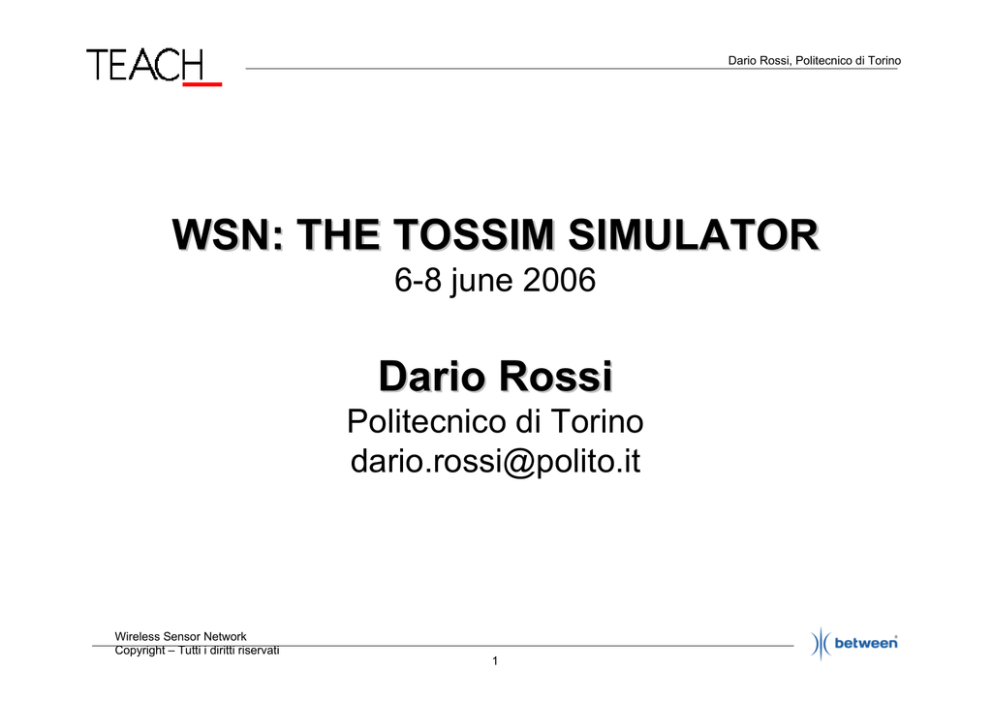 Dario Rossi, Politecnico di Torino WSN: THE TOSSIM SIMULATOR 6-8 june 2006 Dario Rossi Politecnico di Torino [email protected] Wireless Sensor Network Copyright – Tutti i diritti riservati 1 Dario Rossi, Politecnico di Torino Copyright • Questo insieme di trasparenze (detto nel seguito slides) è protetto dalle leggi sul copyright e dalle disposizioni dei trattati internazionali. Il titolo ed i copyright relativi alle slides (ivi inclusi, ma non limitatamente, ogni immagine, fotografia, animazione, video, audio, musica e testo) sono di proprietà degli autori indicati a pag. 1. • Le slides possono essere riprodotte ed utilizzate liberamente dagli istituti di ricerca, scolastici ed universitari afferenti al Ministero della Pubblica Istruzione e al Ministero dell’Università e Ricerca Scientifica e Tecnologica, per scopi istituzionali, non a fine di lucro. In tal caso non è richiesta alcuna autorizzazione. • Ogni altra utilizzazione o riproduzione (ivi incluse, ma non limitatamente, le riproduzioni su supporti magnetici, su reti di calcolatori e stampate) in toto o in parte è vietata, se non esplicitamente autorizzata per iscritto, a priori, da parte degli autori. • L’informazione contenuta in queste slides è ritenuta essere accurata alla data della pubblicazione. Essa è fornita per scopi meramente didattici e non per essere utilizzata in progetti di impianti, prodotti, reti, ecc. In ogni caso essa è soggetta a cambiamenti senza preavviso. Gli autori non assumono alcuna responsabilità per il contenuto di queste slides (ivi incluse, ma non limitatamente, la correttezza, completezza, applicabilità, aggiornamento dell’informazione). • In ogni caso non può essere dichiarata conformità all’informazione contenuta in queste slides. • In ogni caso questa nota di copyright non deve mai essere rimossa e deve essere riportata anche in utilizzi parziali. Wireless Sensor Network Copyright – Tutti i diritti riservati 2 Dario Rossi, Politecnico di Torino Outline Motivations Architecture Overview • Compiler support • Execution model • Hardware/Radio models • Communication services (TinyViz) Evaluation • Bridging, Fidelity, Scalability, Completeness Extension • PowerTOSSIM Wireless Sensor Network Copyright – Tutti i diritti riservati 3 Dario Rossi, Politecnico di Torino Sensor Networks & Simulation Sensor networks… • Require large scale deployment (smart dusts) • Located in physically inaccessible places Apps are deployed… • only once during network life time • Little or no scope to re-deploy on errors Early evaluation of the system… • Is an integral part for development steering • Check correctness of application behavior • Sensors are pretty hard to debug – Failure bug -> easier – Operational but aberrant behavior -> harder Wireless Sensor Network Copyright – Tutti i diritti riservati 4 Dario Rossi, Politecnico di Torino Debugging a Mote... Used to require hardware modification... ...to the mote (removal of a resistor) ... ...to the board (addition of jtag connector) Wireless Sensor Network Copyright – Tutti i diritti riservati 5 Dario Rossi, Politecnico di Torino Debugging a Mote ...still requires another hardware toy ...in TinyOS authors’ own words: “Prepare to a slightly painful experience” N. Ramanathan, K. Chang, R. Kapur, L. Girod, E. Kohler, and D. Estrin Sympathy for the Sensor Network Debugger In Proc. of SenSys 2005. Wireless Sensor Network Copyright – Tutti i diritti riservati 6 Dario Rossi, Politecnico di Torino Simulation Pros and Cons Several advantages • Study system in totally controlled environment • Explore configuration difficult to construct • Observe interaction difficult to live-capture • Helps in design improvement • Cost effective alternative And disadvantages as well • May not represent accurate real-world results • Depends on several modeling assumptions • Tradeoff details and accuracy for feasibility Wireless Sensor Network Copyright – Tutti i diritti riservati 7 Dario Rossi, Politecnico di Torino Existing Tools? Not very suitable for sensor networks • Provides abstraction levels either – too coarse -> packet level (ns-2, omnet++, Glomosim, …) – too fine-grained -> instruction-level (Atemu, Proteus,…) • Do not address the complex interactions – Among motes (Application level) – Within motes (Network stack) – Motes and environment (Real world noise) • Need to handle 2 parallel implementations – One for the real motes, one for the simulator Need for simulator tightly bound to TinyOS Wireless Sensor Network Copyright – Tutti i diritti riservati 8 Dario Rossi, Politecnico di Torino Key Requirements Scalability • How many ? Completeness • How much ? Fidelity • How similar ? Bridging • How easy ? Wireless Sensor Network Copyright – Tutti i diritti riservati 9 Dario Rossi, Politecnico di Torino Key Requirements Scalability • Largest real deployment: 850 nodes (20,000 secreted) • Must handle these sizes and above Completeness • Cover as many interaction as possible • Simulating complete application is required Fidelity • Capture network interaction at a fine grain • Must be able to reveal unanticipated interactions Bridging • Bridge the gap between algorithm and implementation • Often, algorithm is sound but implementation is not Wireless Sensor Network Copyright – Tutti i diritti riservati 10 Dario Rossi, Politecnico di Torino TOSSIM Architecture •Discrete-event simulator •Utilizes TinyOS’s component based architecture •Transparently integrated within TinyOS –providing a new hardware resource abstraction layer –TinyOS event-driven execution maps well to a discrete-even simulation Wireless Sensor Network Copyright – Tutti i diritti riservati 11 Dario Rossi, Politecnico di Torino TOSSIM Architecture Wireless Sensor Network Copyright – Tutti i diritti riservati 12 Dario Rossi, Politecnico di Torino TOSSIM Architecture Arc