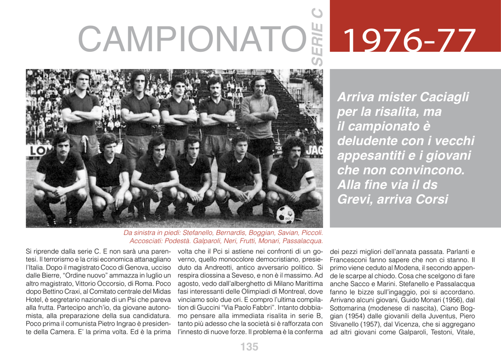 serie C Campionato 1976-77 Arriva mister Caciagli per la risalita, ma il campionato è deludente con i vecchi appesantiti e i giovani che non convincono. Alla fine via il ds Grevi, arriva Corsi Da sinistra in piedi: Stefanello, Bernardis, Boggian, Savian, Piccoli. Accosciati: Podestà. Galparoli, Neri, Frutti, Monari, Passalacqua. Si riprende dalla serie C. E non sarà una parentesi. Il terrorismo e la crisi economica attanagliano l’Italia. Dopo il magistrato Coco di Genova, ucciso dalle Bierre, “Ordine nuovo” ammazza in luglio un altro magistrato, Vittorio Occorsio, di Roma. Poco dopo Bettino Craxi, al Comitato centrale del Midas Hotel, è segretario nazionale di un Psi che pareva alla frutta. Partecipo anch’io, da giovane autonomista, alla preparazione della sua candidatura. Poco prima il comunista Pietro Ingrao è presidente della Camera. E’ la prima volta. Ed è la prima volta che il Pci si astiene nei confronti di un governo, quello monocolore democristiano, presieduto da Andreotti, antico avversario politico. Si respira diossina a Seveso, e non è il massimo. Ad agosto, vedo dall’alberghetto di Milano Marittima fasi interessanti delle Olimpiadi di Montreal, dove vinciamo solo due ori. E compro l’ultima compilation di Guccini “Via Paolo Fabbri”. Intanto dobbiamo pensare alla immediata risalita in serie B, tanto più adesso che la società si è rafforzata con l’innesto di nuove forze. Il problema è la conferma 135 dei pezzi migliori dell’annata passata. Parlanti e Francesconi fanno sapere che non ci stanno. Il primo viene ceduto al Modena, il secondo appende le scarpe al chiodo. Cosa che scelgono di fare anche Sacco e Marini. Stefanello e Passalacqua fanno le bizze sull’ingaggio, poi si accordano. Arrivano alcuni giovani, Guido Monari (1956), dal Sottomarina (modenese di nascita), Ciano Boggian (1954) dalle giovanili della Juventus, Piero Stivanello (1957), dal Vicenza, che si aggregano ad altri giovani come Galparoli, Testoni, Vitale, 1976-77 praticamente promossi titolari. Al Vicenza approda Carrera, il nostro pezzo migliore, e alla Reggiana viene girato, assieme a un gruzzolo di bigliettoni, l’esperto Giorgio Bernardis, per tanti anni al Catania, mentre dalla Masesse arriva Domenico Neri (1952), un jolly d’attacco. I quadri risultano i seguenti. Portieri: Piccoli, Brighi; difensori: Galparoli, Testoni, D’Angiulli, Podestà, Stefanello, Maiani, Salgarella, Bernardis; centrocampisti: Passalacqua, Savian, Neri, Stivanello, Monari; attaccanti: Frutti, Serato, Mossini, Rabitti, Vitale, Marconcini, Boggian. Intanto muore Mao Tse Tung e con lui la tragica illusione di un comunismo speciale, mentre il muro di Berlino uccide anche un reggiano. E’ abbattuto dai Vopos il camionista rubierese Benito Corghi, mentre a Reggio si decide uno sciopero generale per salvare la Bloch, azienda in crisi, proprio quando è in corso la mobilitazione per il Friuli terremotato. Marisa, che parli da pasionaria davanti ai cancelli della Bloch, non venire a vedere la Reggiana perchè se no t’incazzi ancora di più. I nostri perdono infatti le prime due partite di Coppa Italia di serie C: la prima col Mantova, il 22 agosto, per 1 a 0 e la seconda il 25 agosto, col Parma, con identico risultato, entrambe al Mirabello. E capita che nel corso della partita coi crociati il biondo Serato si arrabbi di brutto col pubblico che lo contesta e gli getti addosso la maglietta prima di andarsene dal campo. Gesto inqualificabile. Lauro Azzolini, un altro reggiano, assieme ad un altro brigatista, compie un nuovo agghiacciante omicidio: quello del vice questore di Biella Francesco Cusano. La Reggiana si rimette in sesto e pareggia a Parma e a Mantova per zero a zero. Visconti annuncia Serato butta via la maglia in Coppa, poi torna e sembra un altro, ma è Testoni il mito e Galparoli la sicurezza d’essere alla ricerca di un centravanti, ma poi renderà onore al figliol prodigo Serato. Così, il 12 settembre, alla prima del campionato con l’Empoli di Bruno Giorgi, la Reggiana stenta parecchio e riesce a prevalere solo grazie a un calcio di rigore trasformato da Neri. poi a Viterbo ritorna Serato, che convince, ma la Reggiana non va oltre un pari per 1 a 1. Ancora una vittoria di misura con la Sangiovannese al Mirabello, dopo che Piccoli aveva dovuto dare forfait per un grave incidente, che lo terrà fuori per alcuni mesi, e viene sostituito dal giovane Brighi e mentre al Boiardo vediamo “Novecento, parte prima” di Bertolucci e all’Alexander “L’ultima donna” di Ferreri con la Muti e Depardieu. Nasce il mito di Furia Testoni, che parte da metà campo e semina in velocità tutti gli avversari. Sembra l’arma letale della Reggiana e i granata superano brillantemente la Massese per 3 a 0, dopo che Cassius Clay (alias Mohammed Alì) si conferma campione battendo Norton. Poi è pari a Giulianova per 2 a 2, ma ai granata è annullata inspiegabilmente una rete e negato un rigore. Monari, Galparoli e Testoni sono convocati per la nazionale di C e la Reggiana, il 17 ottobre, impatta col forte Livorno al Mirabello dinanzi a oltre 8mila persone e resta al primo posto da sola. Cantiamo anche noi “Furia cavallo del West” con Bruno Lauzi e Claudio Testoni che cavalca e nitrisce, sbuffa, s’invola e si rilassa. Che spettacolo vedere le sue sfuriate. Niki Lauda perde il titolo perché, dopo l’incidente che gli ha deturpato il viso, preferisce salvarsi la vita piuttosto che rischiare sotto la pioggia, e la Reggiana non salva l’onore, il 24 ottobre, a Parma, perdendo il derby molto più nettamente di quan- 136 to non dica il risultato (2 a 1). Tra i nostri anche i nuovi acquisti: il portiere Muraro e la mezzala De Biasi. Tra loro il nostro ex Borzoni, micidiale. Anche il primato è perduto e la domenica successiva col Riccione, nella partita del debutto del nuovo acquisto Florio (Frutti è stato ceduto al Sant’Angelo Lodigiano), la Reggiana vince all’ultimo minuto e con molta fortuna