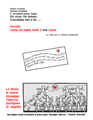 Poteva accadere. Doveva accadere. E’ accaduto prima. Dopo. Più vicino. Più lontano. E’accaduto non a te……. Ascolta come mi batte forte il tuo cuore ( da “Ogni caso” di Wislawa Szymborska) La Storia, le storie: Giuseppe Taliercio, partigiano di legalità Aula Magna Scuola Secondaria di primo grado “Giuseppe Taliercio” - Venerdì 21/12/2012