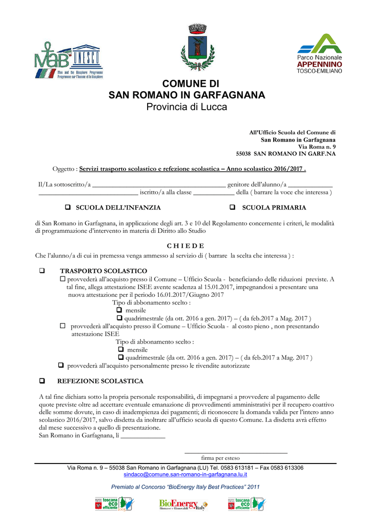 COMUNE DI SAN ROMANO IN GARFAGNANA Provincia di Lucca All’Ufficio Scuola del Comune di San Romano in Garfagnana Via Roma n. 9 55038 SAN ROMANO IN GARF.NA Oggetto : Servizi trasporto scolastico e refezione scolastica – Anno scolastico 2016/2017 . Il/La sottoscritto/a _______________________________________ genitore dell’alunno/a _____________ _____________________________ iscritto/a alla classe ____________ della ( barrare la voce che interessa ) SCUOLA DELL’INFANZIA SCUOLA PRIMARIA di San Romano in Garfagnana, in applicazione degli art. 3 e 10 del Regolamento concernente i criteri, le modalità di programmazione d’intervento in materia di Diritto allo Studio CHIEDE Che l’alunno/a di cui in premessa venga ammesso al servizio di ( barrare la scelta che interessa ) : TRASPORTO SCOLASTICO provvederà all’acquisto presso il Comune – Ufficio Scuola - beneficiando delle riduzioni previste. A tal fine, allega attestazione ISEE avente scadenza al 15.01.2017, impegnandosi a presentare una nuova attestazione per il periodo 16.01.2017/Giugno 2017 Tipo di abbonamento scelto : mensile quadrimestrale (da ott. 2016 a gen. 2017) – ( da feb.2017 a Mag. 2017 ) provvederà all’acquisto presso il Comune – Ufficio Scuola - al costo pieno , non presentando attestazione ISEE Tipo di abbonamento scelto : mensile quadrimestrale (da ott. 2016 a gen. 2017) – ( da feb.2017 a Mag. 2017 ) provvederà all’acquisto personalmente presso le rivendite autorizzate REFEZIONE SCOLASTICA A tal fine dichiara sotto la propria personale responsabilità, di impegnarsi a provvedere al pagamento delle quote previste oltre ad accettare eventuale emanazione di provvedimenti amministrativi per il recupero coattivo delle somme dovute, in caso di inadempienza dei pagamenti; di riconoscere la domanda valida per l’intero anno scolastico 2016/2017, salvo disdetta da inoltrare all’ufficio scuola di questo Comune. La disdetta avrà effetto dal mese successivo a quello di presentazione. San Romano in Garfagnana, lì _____________ ______________________________ firma per esteso Via Roma n. 9 – 55038 San Romano in Garfagnana (LU) Tel. 0583 613181 – Fax 0583 613306 [email protected] Premiato al Concorso “BioEnergy Italy Best Practices” 2011